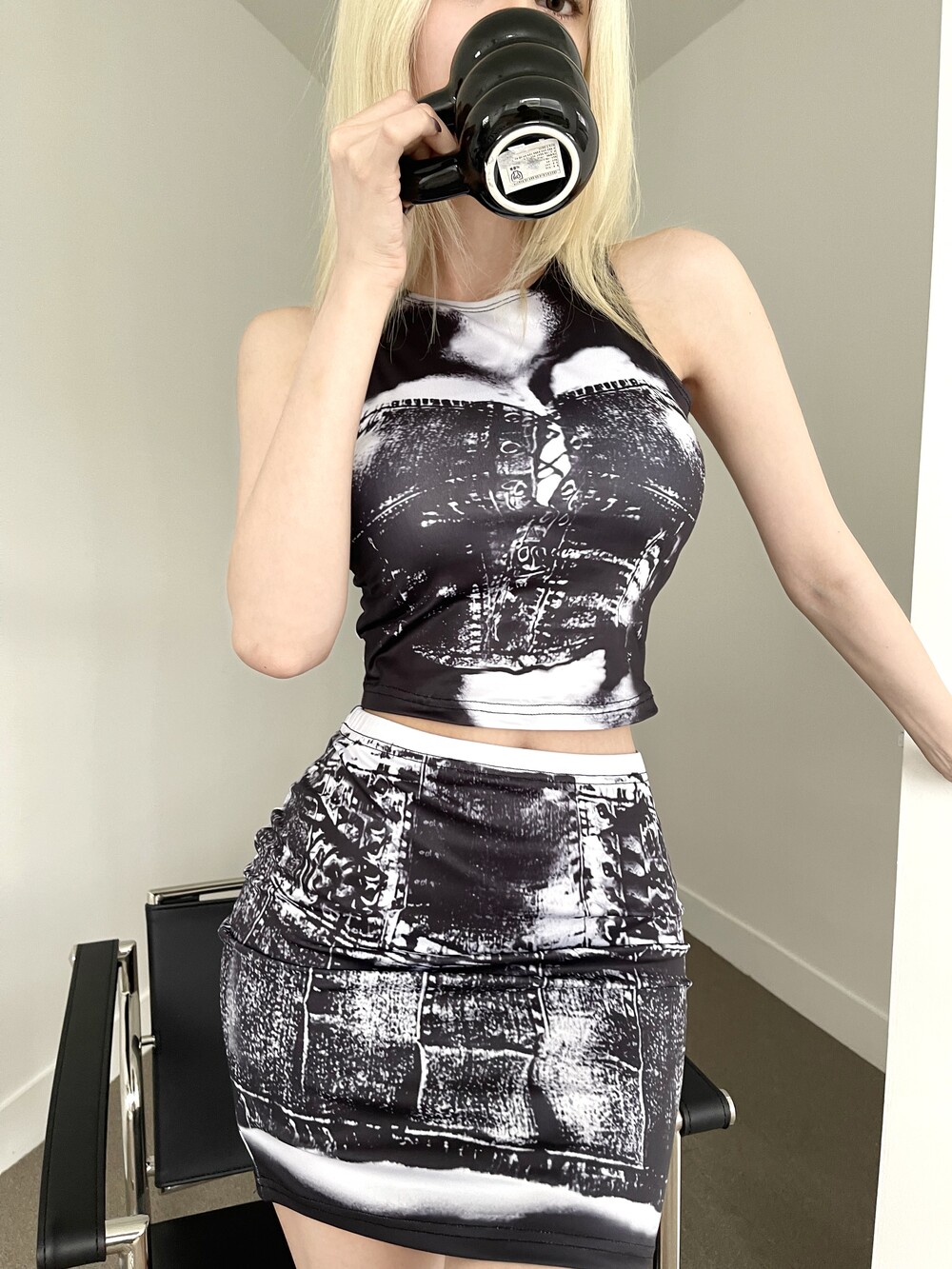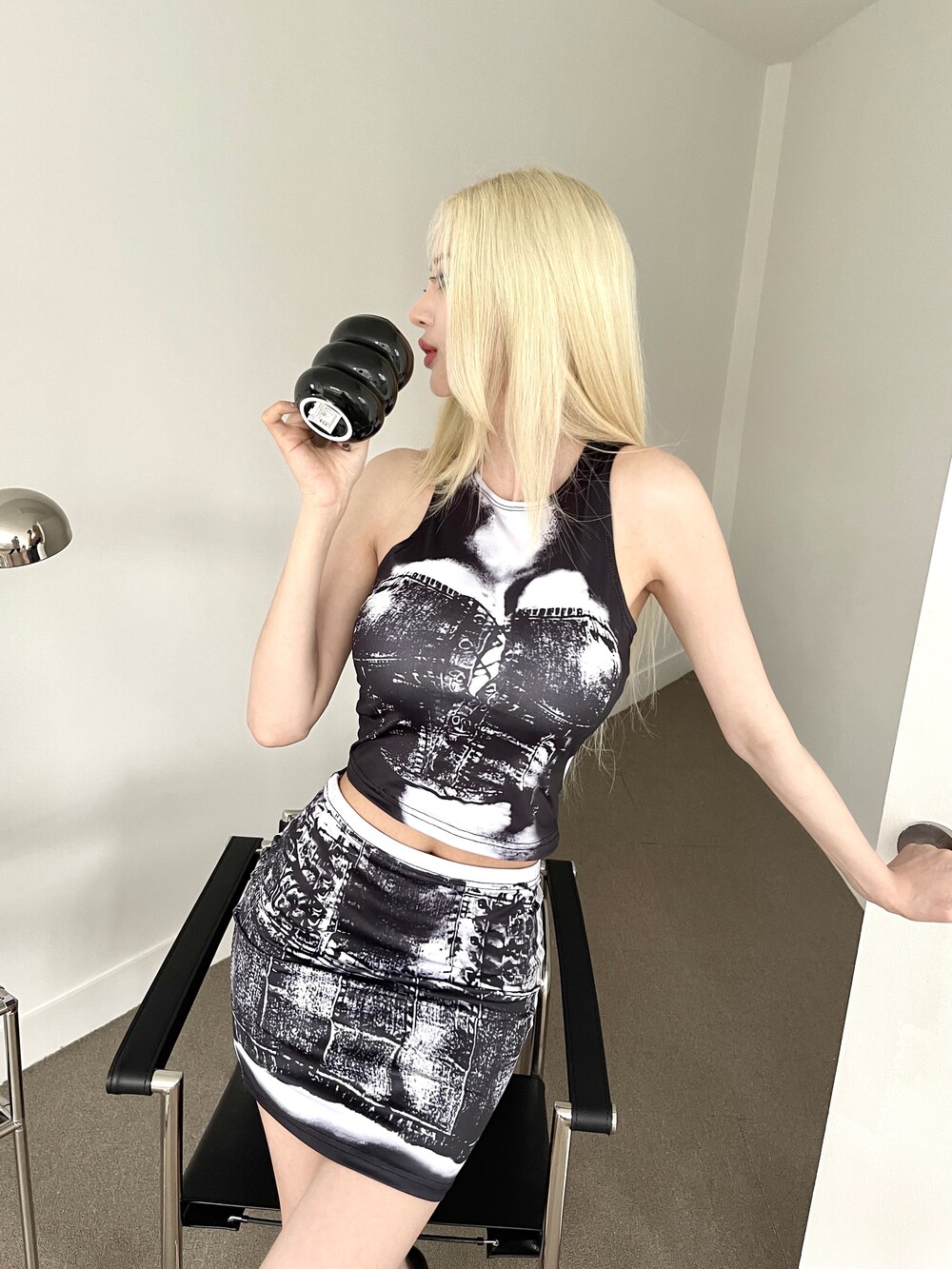 코르셋 디테일의 탑과 스커트를 프린팅한 투피스