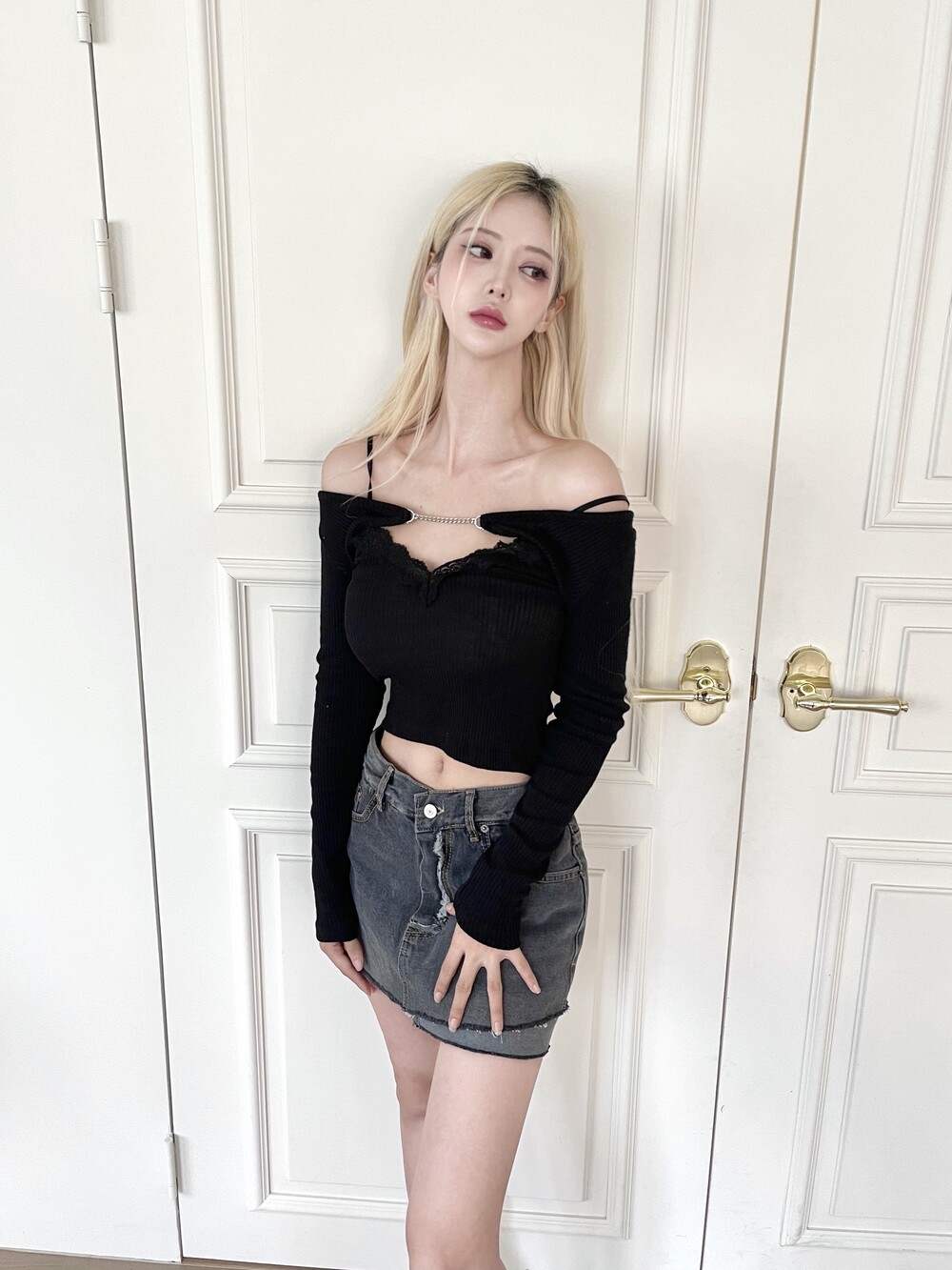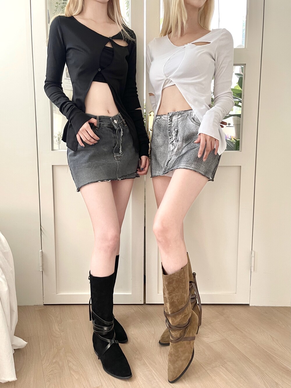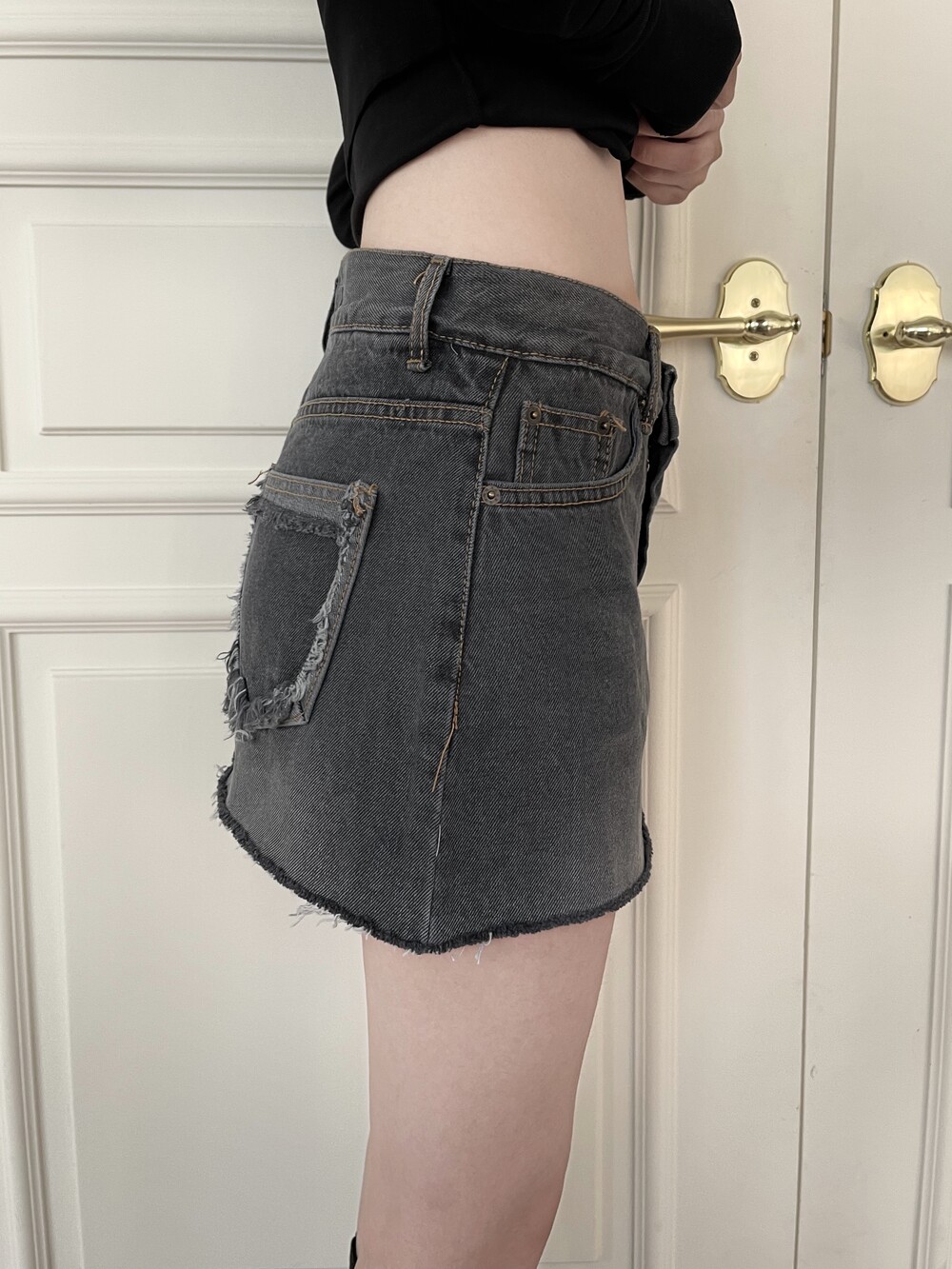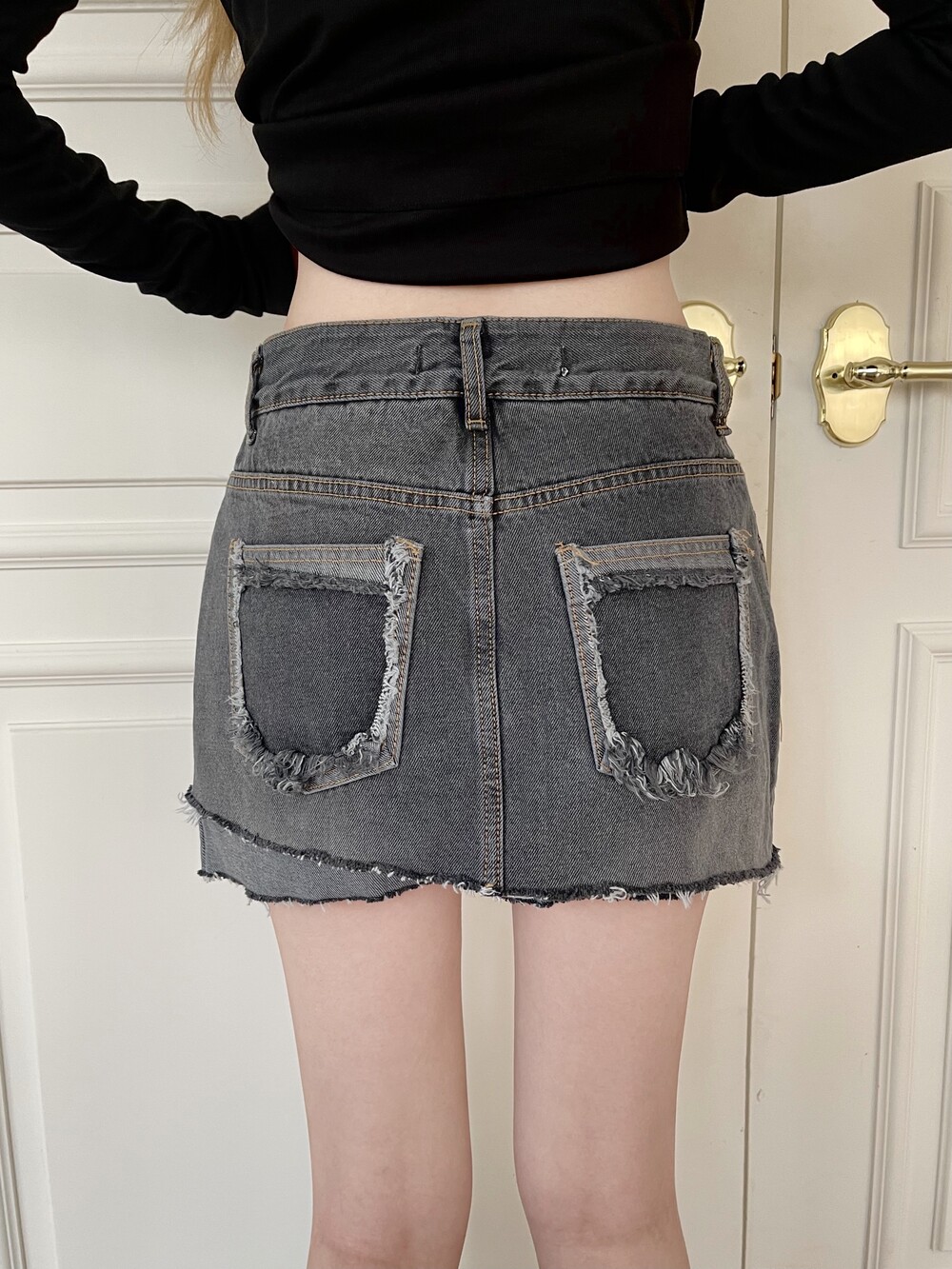 그레이 워싱 데미지 더블 미니 로우 스커트