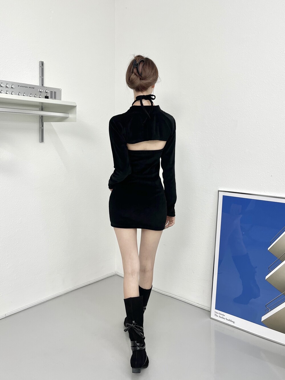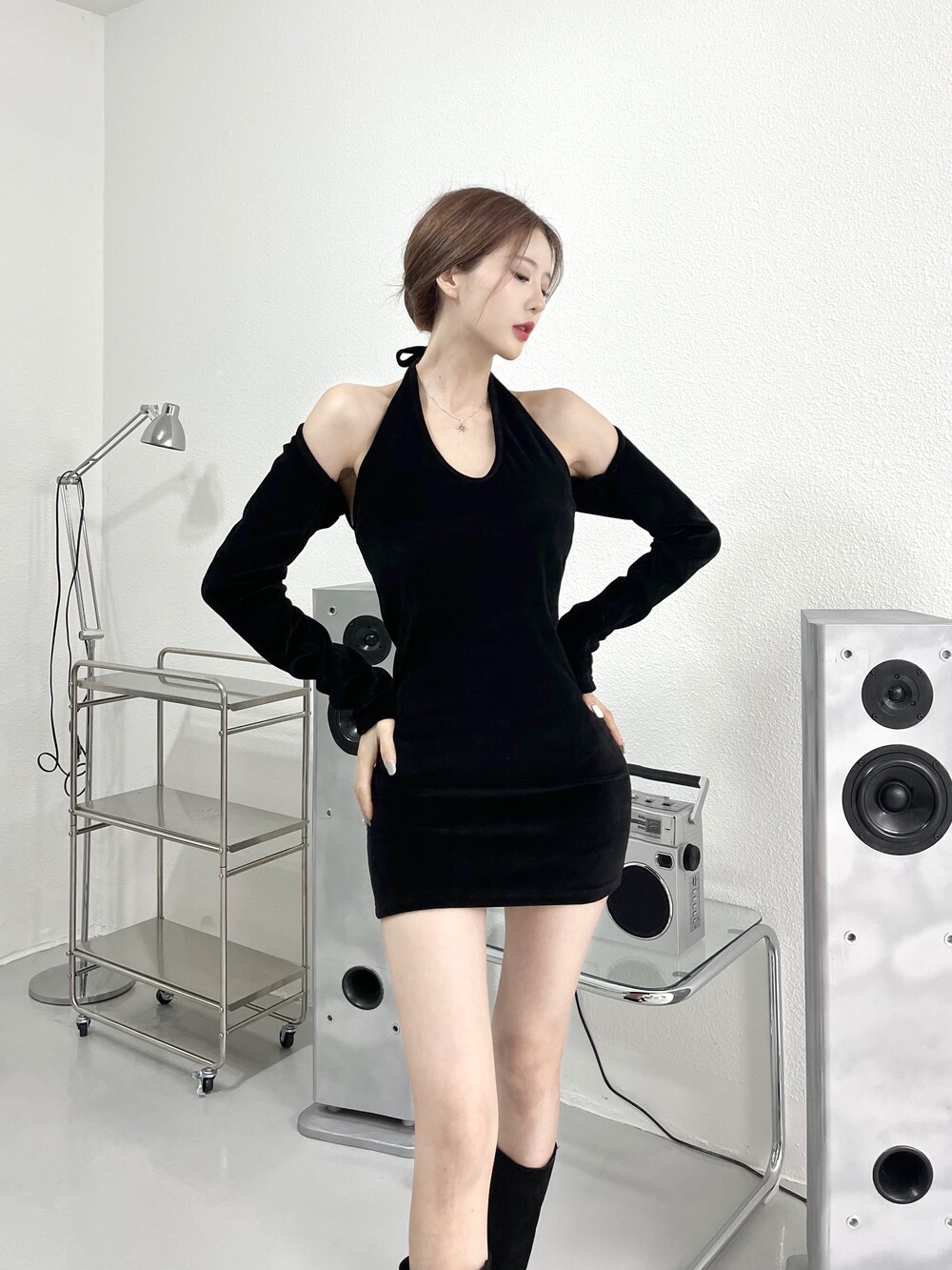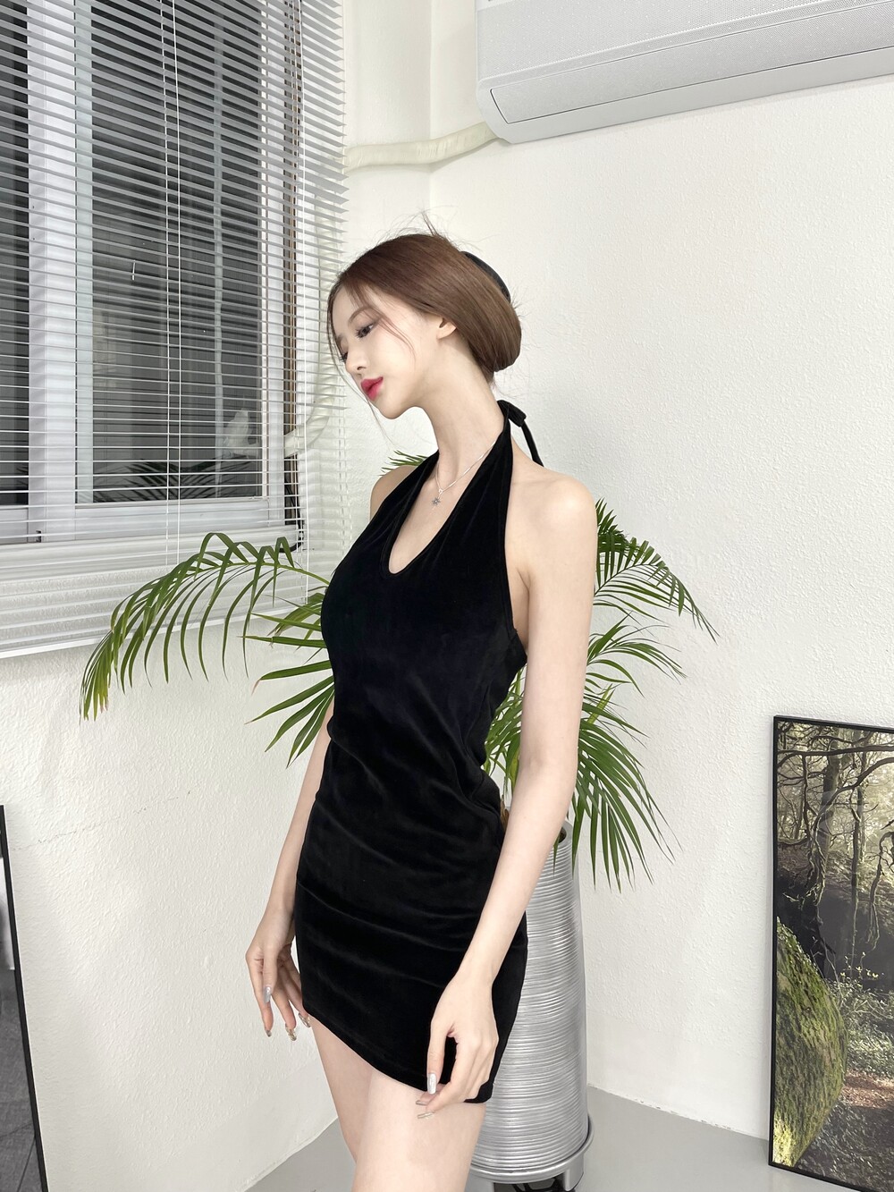 벨벳 소재로 원피스는 홀터넥에