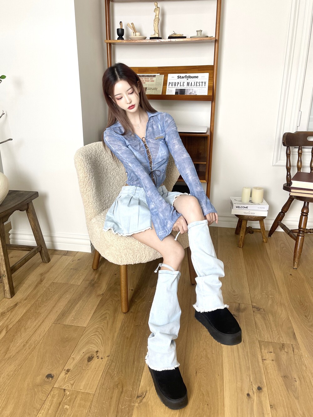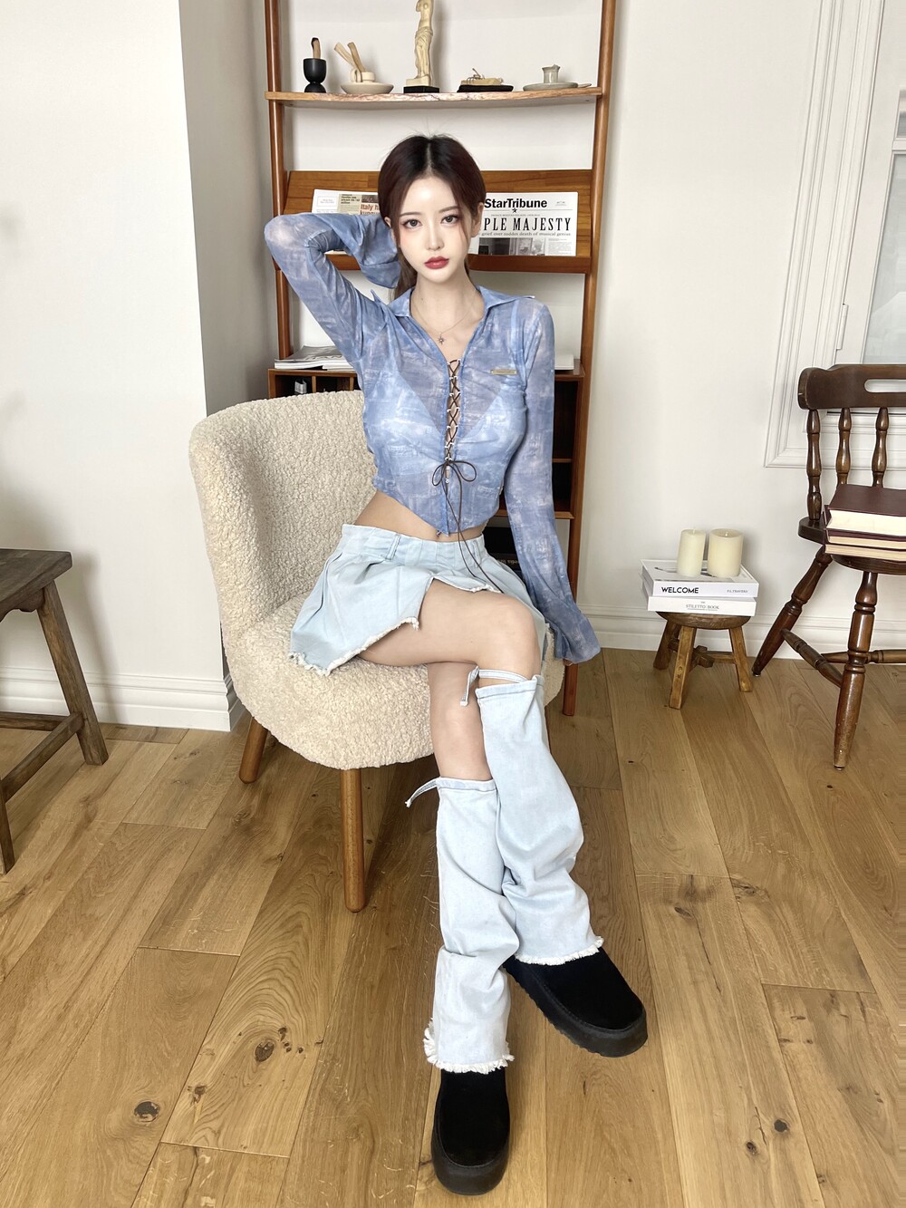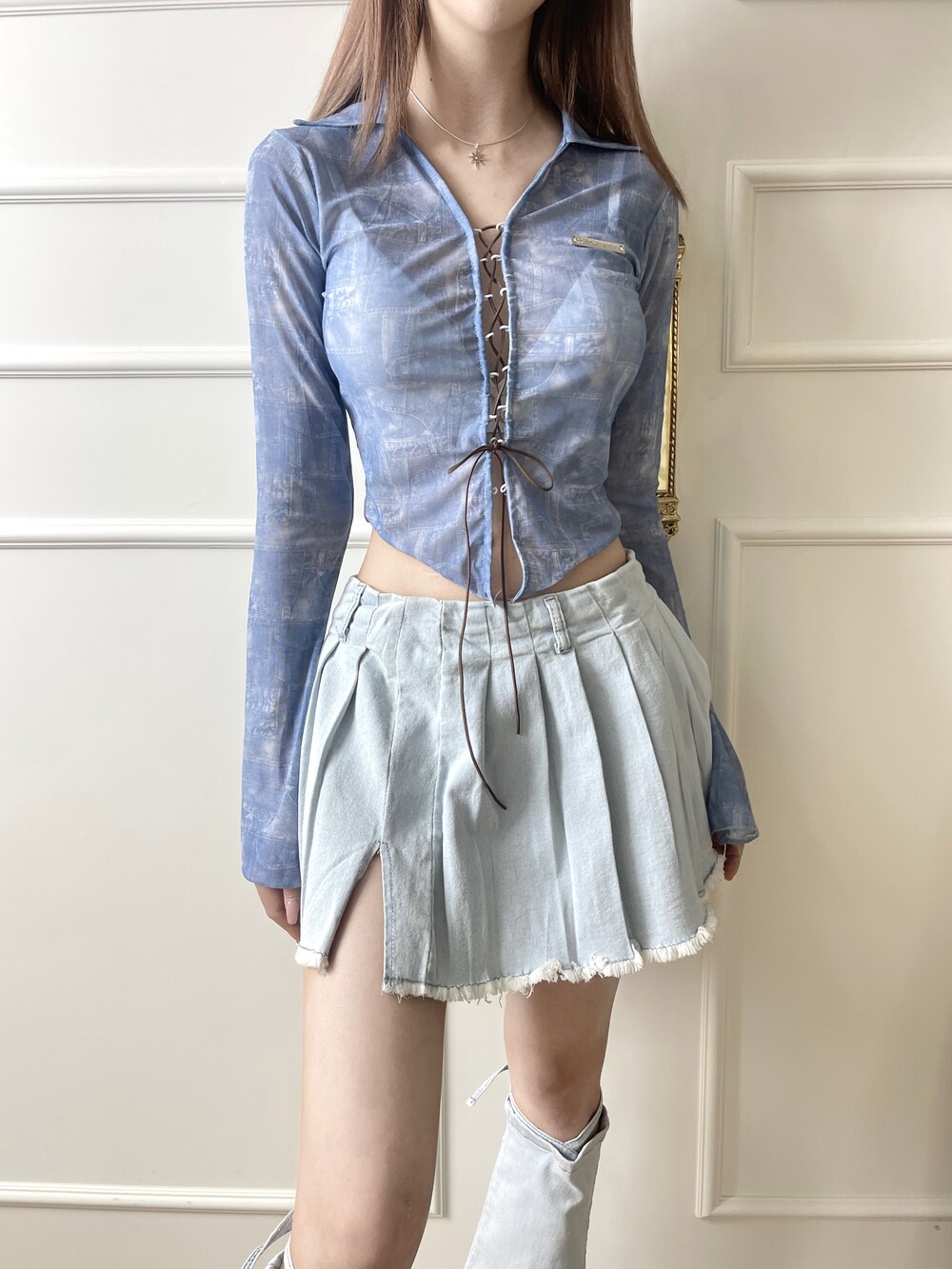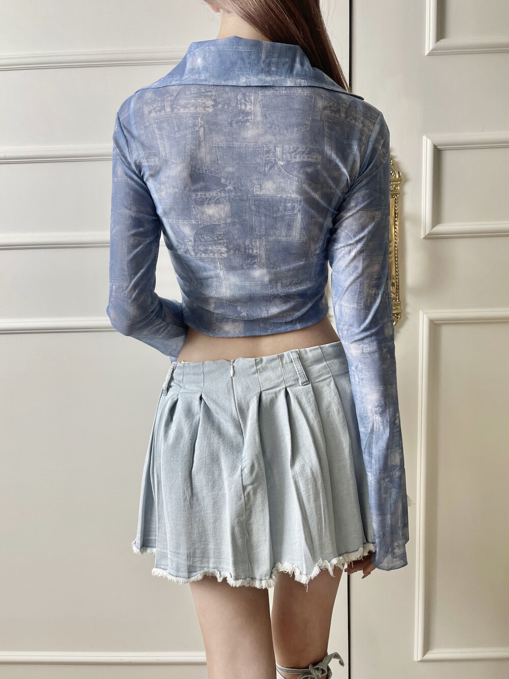 데님진 포켓 프린팅 시스루 아일렛 셔츠