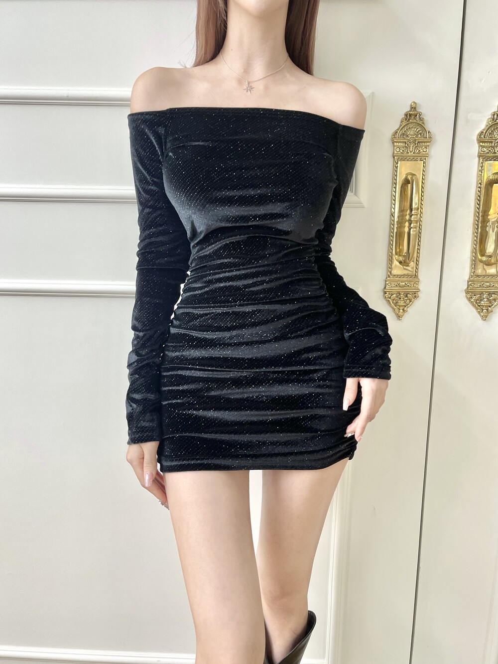 펄 벨벳 오프숄더 셔링 미니 원피스