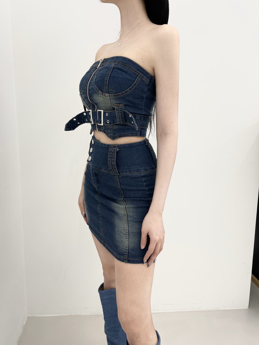 856. Y2K belt denim top sk 2pc