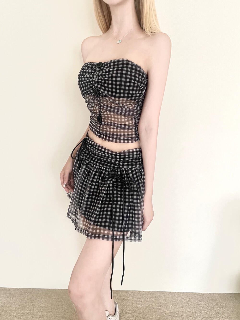 탑의 경우 스트랩리스 상의로 매력적인 체크 패턴 포인트