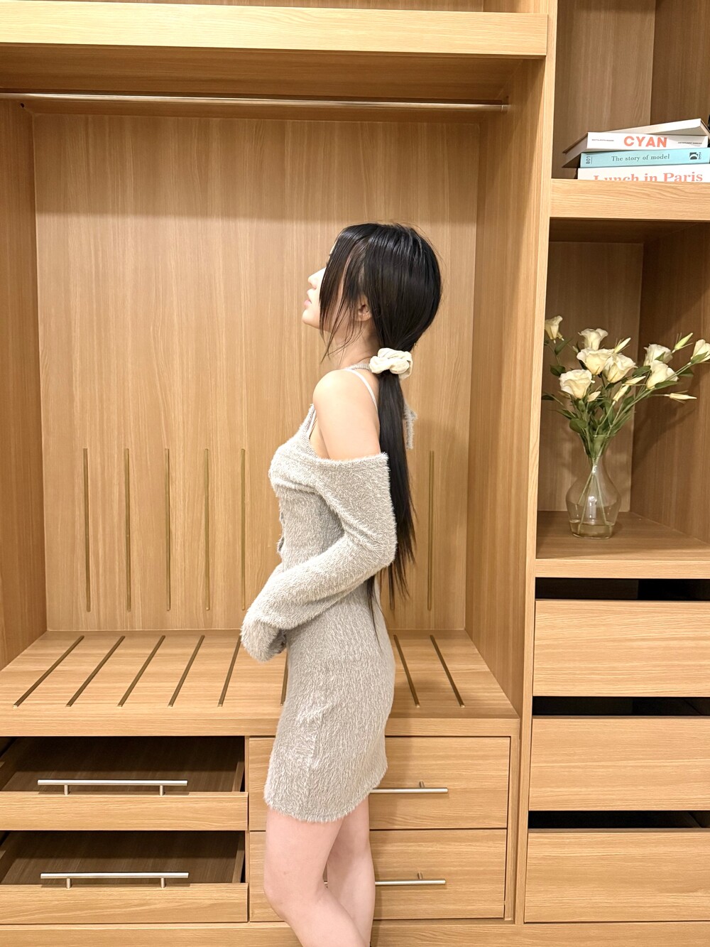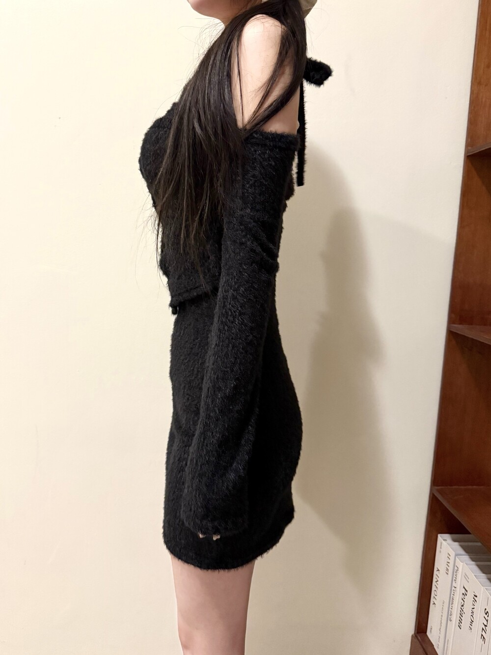 오프숄더 디테일로 여리한 아웃핏 연출