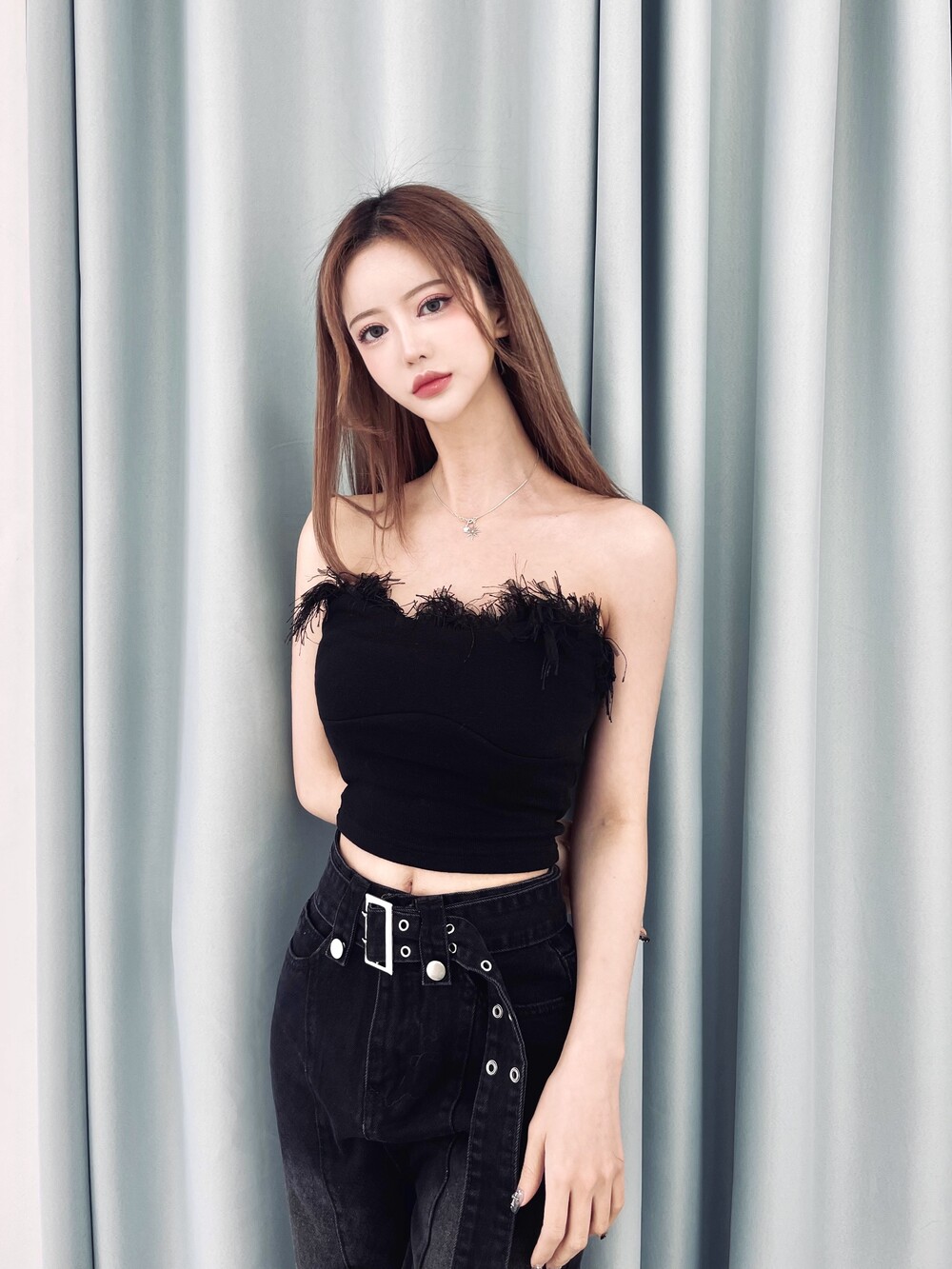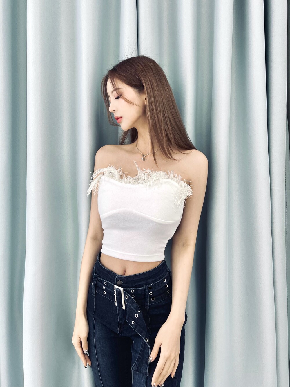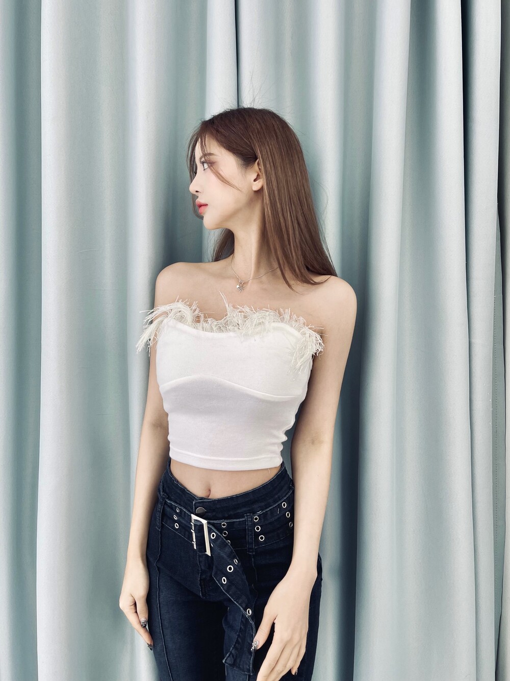 믹싱 퍼 트리밍 크롭 튜브 탑