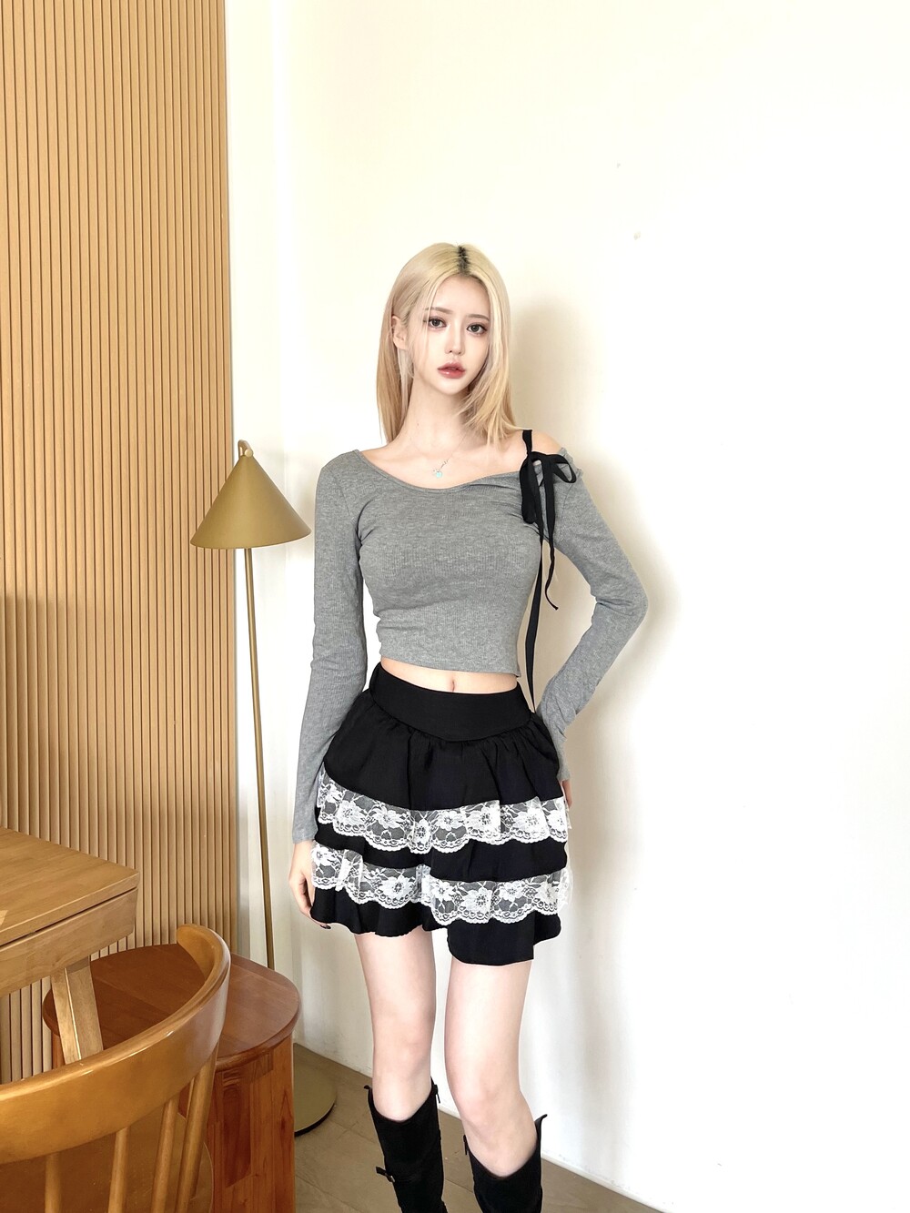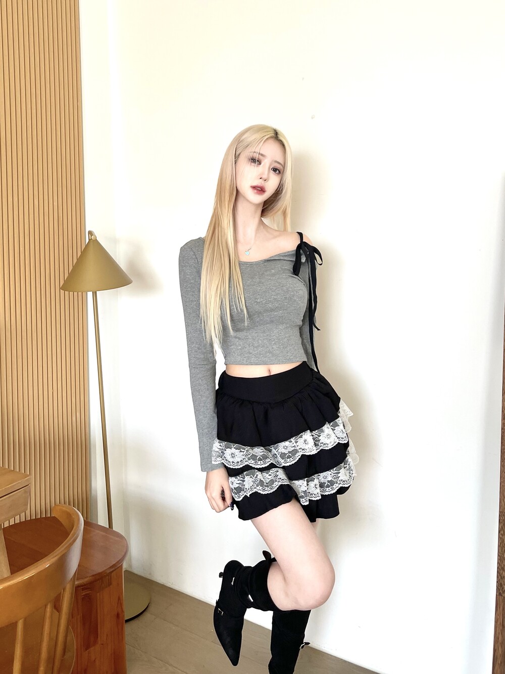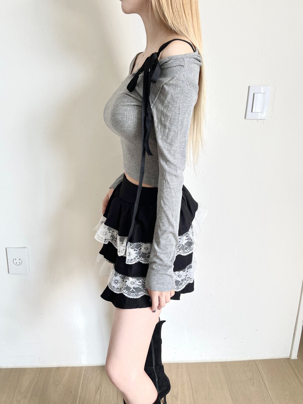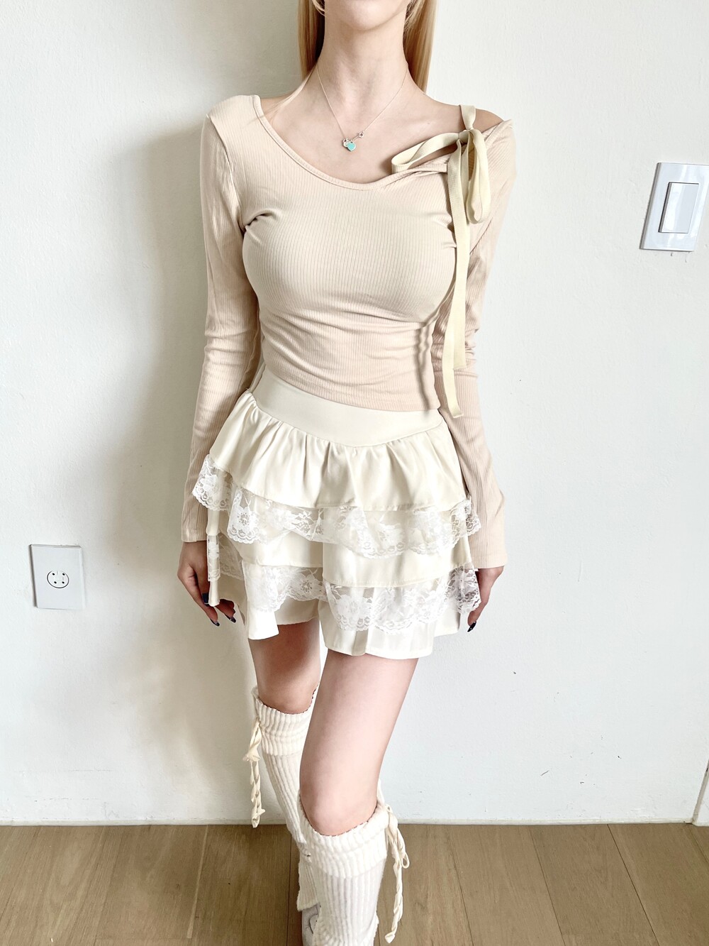 언발 리본 티셔츠 - 레이스 캉캉 미니 스커트 세트