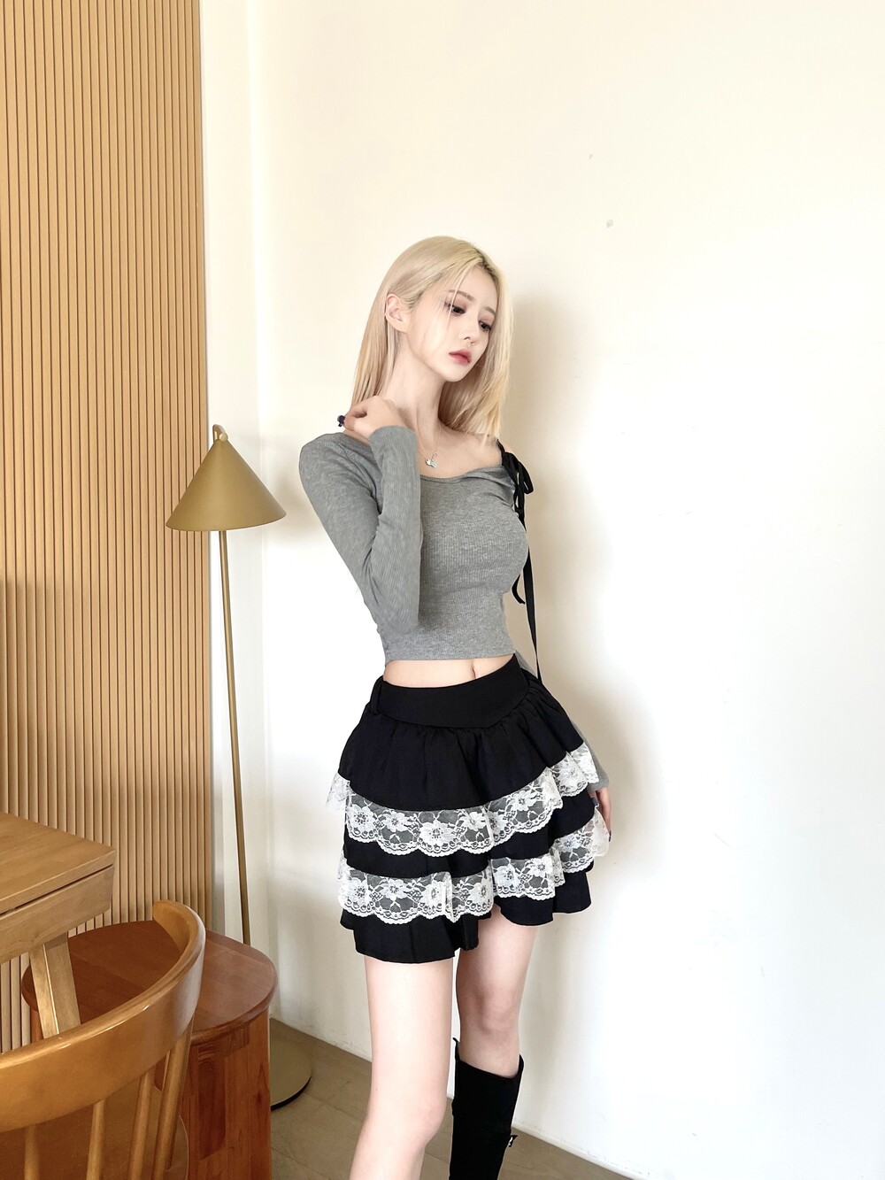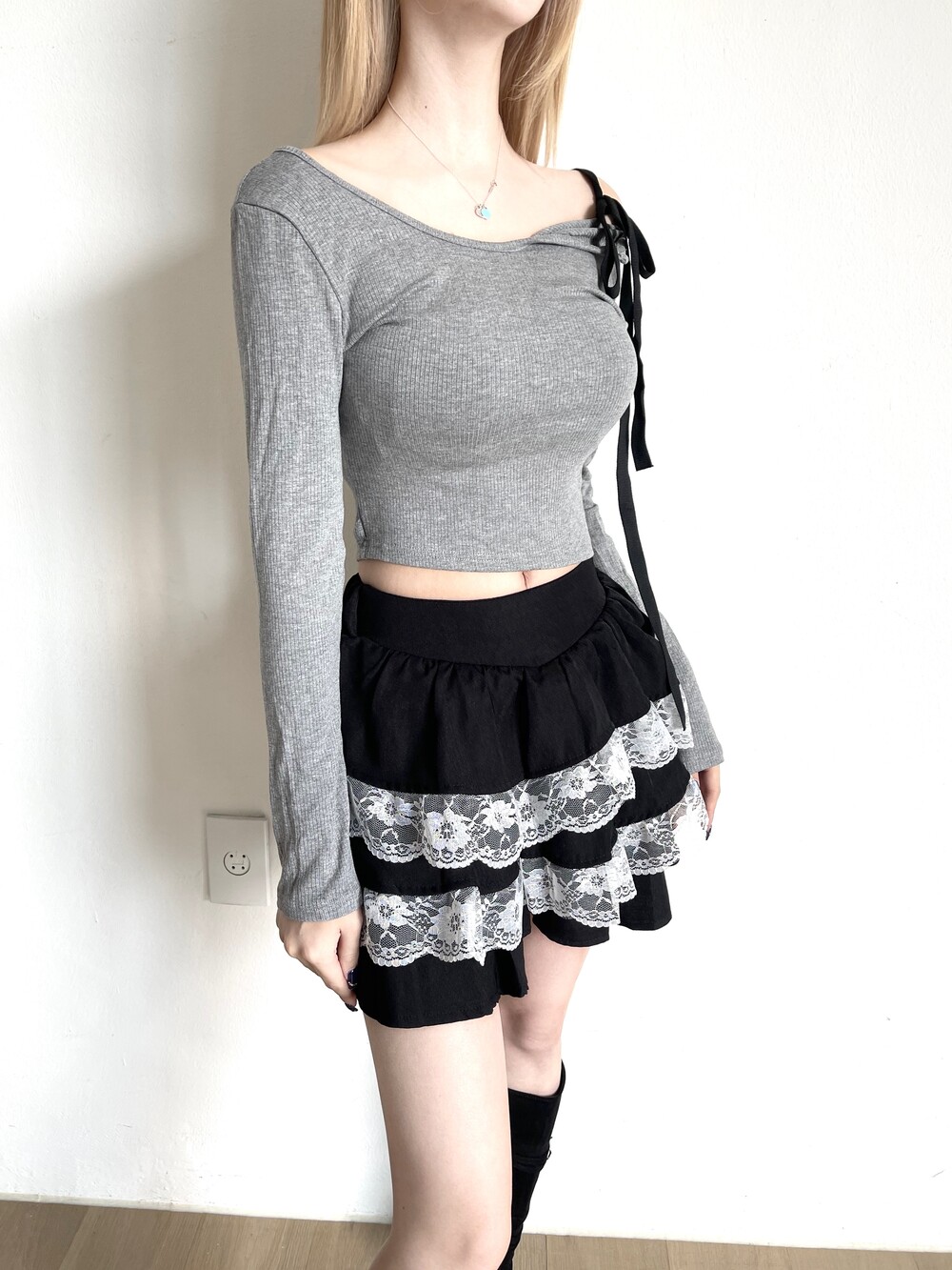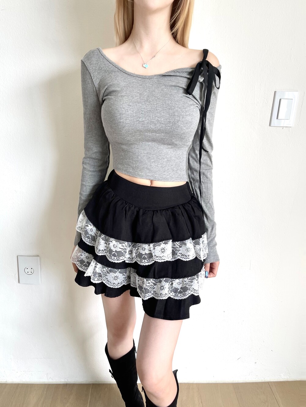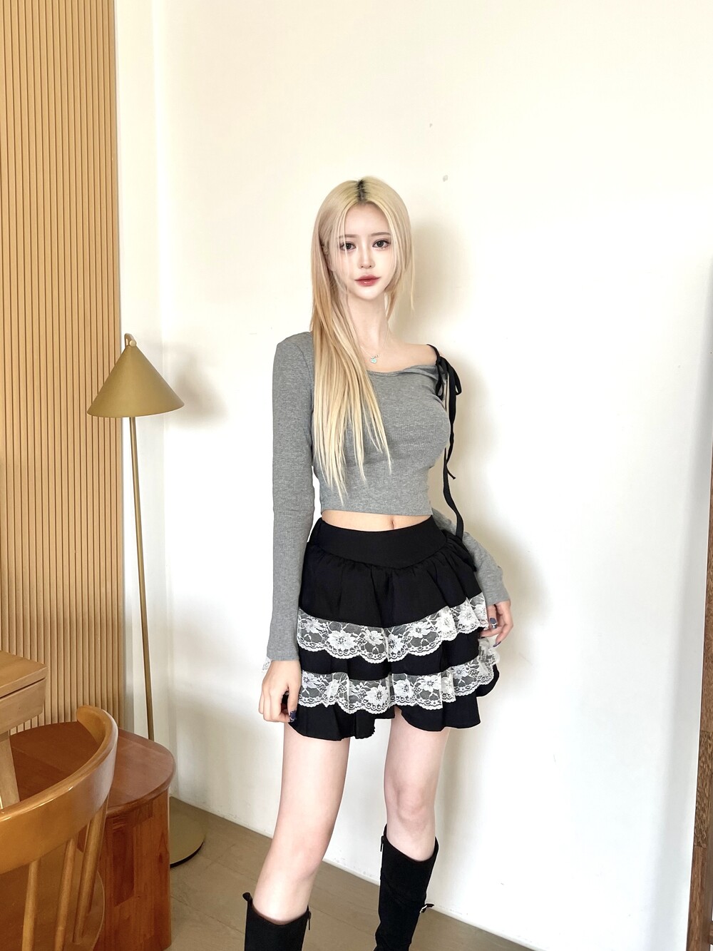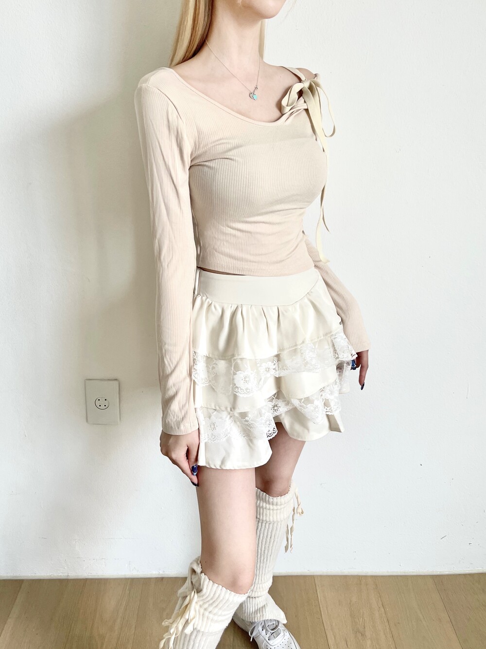언발 리본 티셔츠 - 레이스 캉캉 미니 스커트 세트