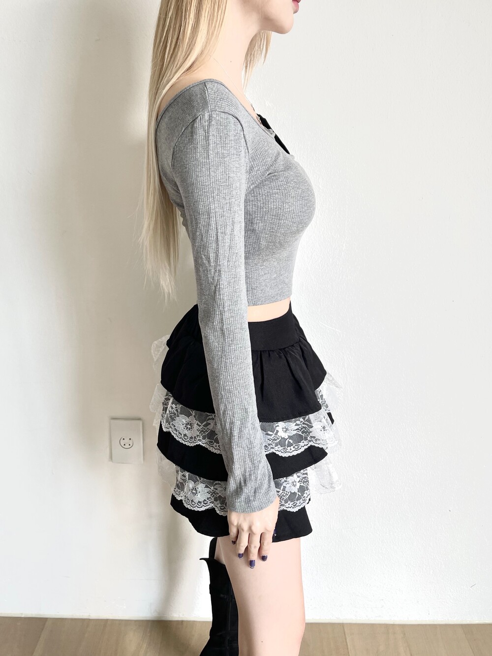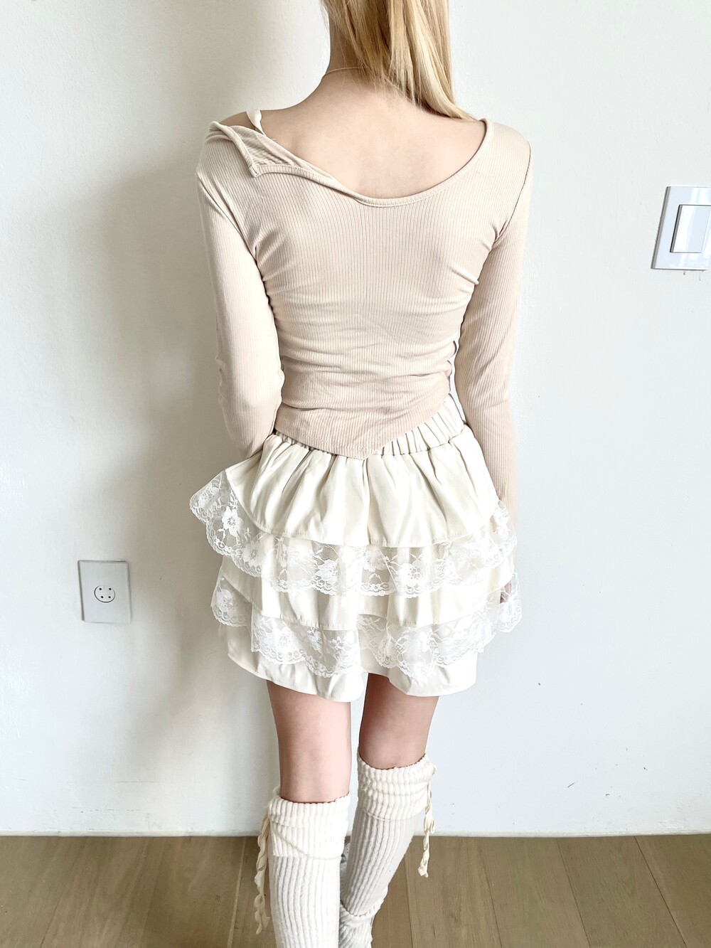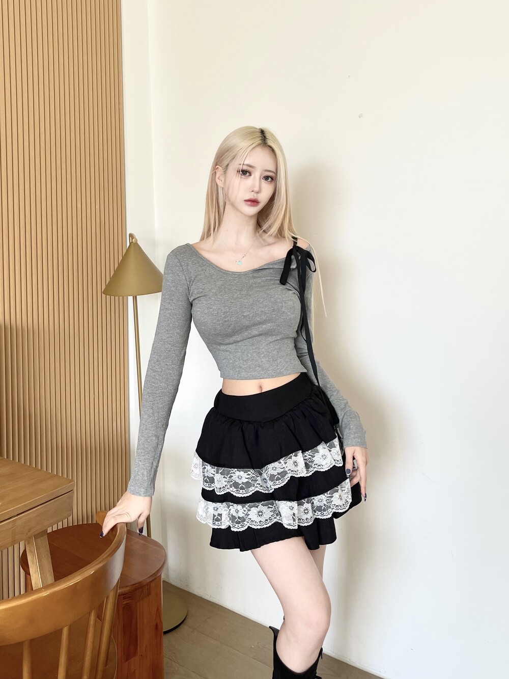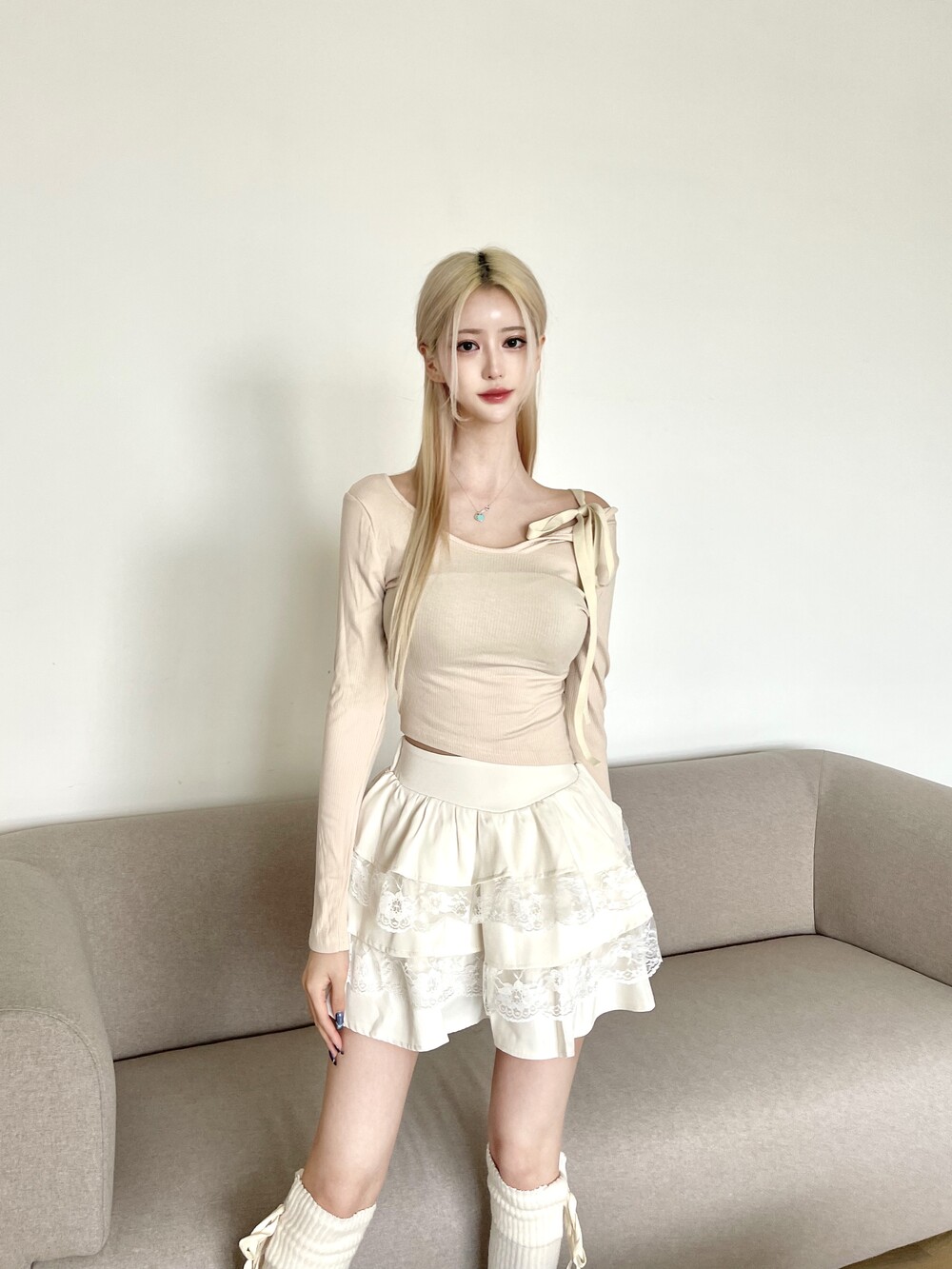 언발 리본 티셔츠 - 레이스 캉캉 미니 스커트 세트