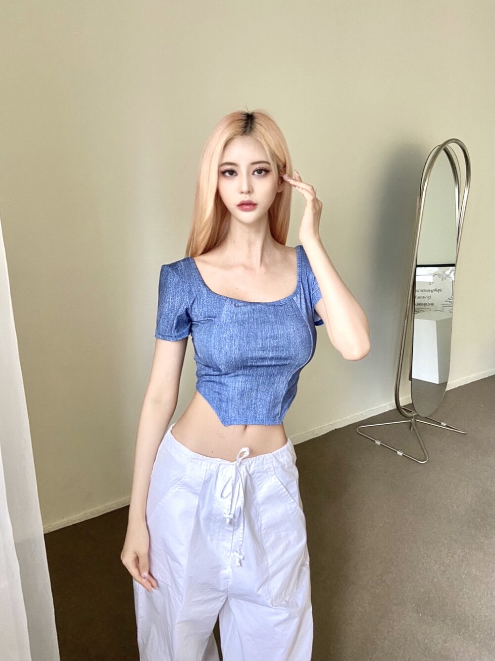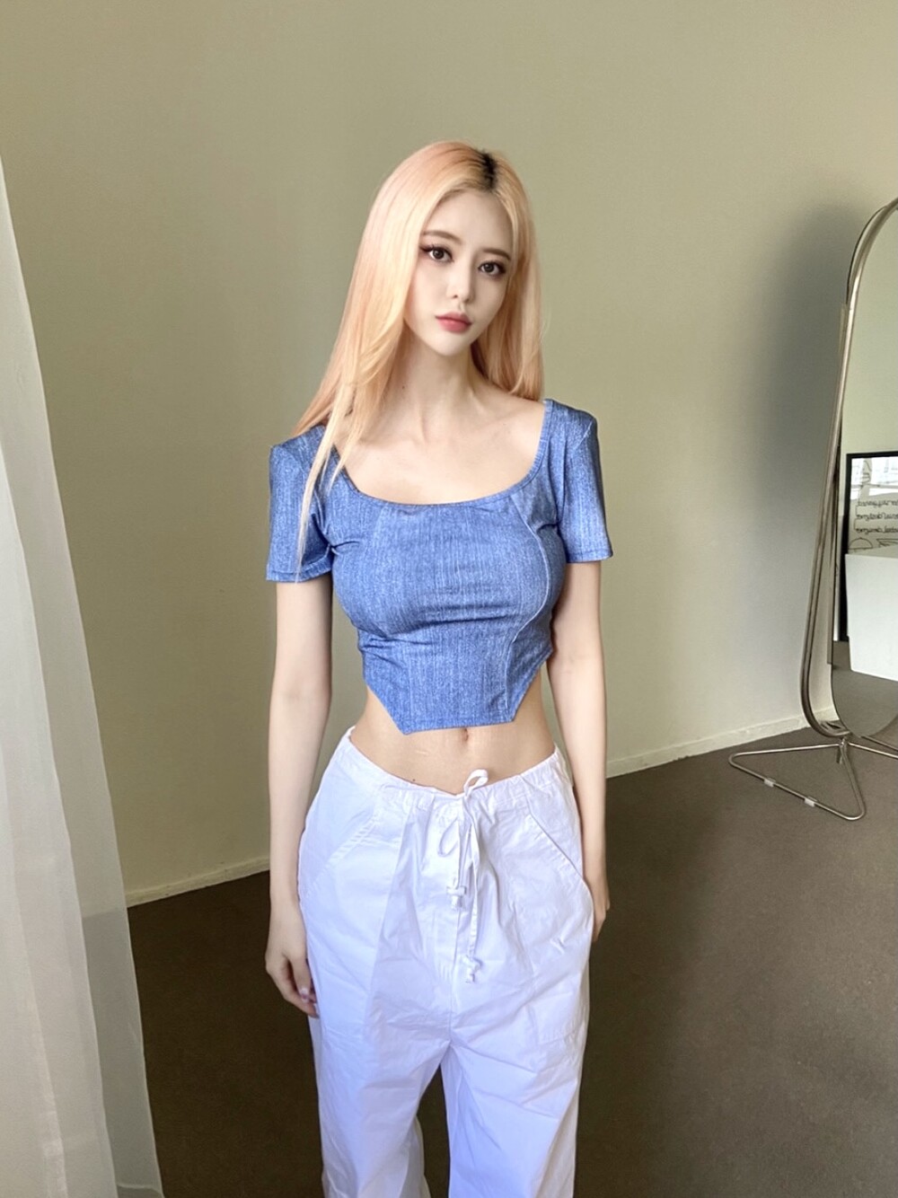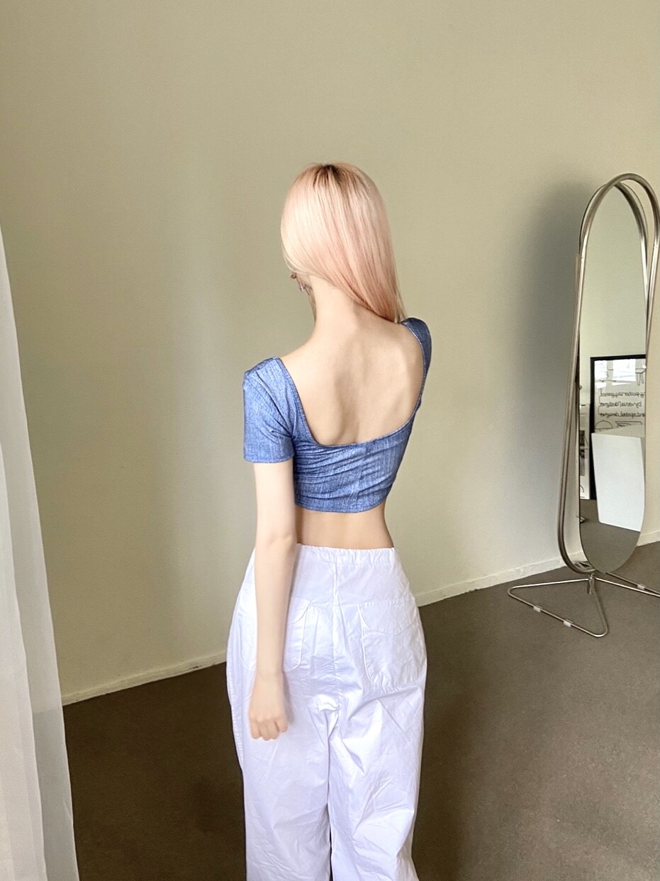 쿨링 데님 프린팅 코르셋라인 크롭 티셔츠