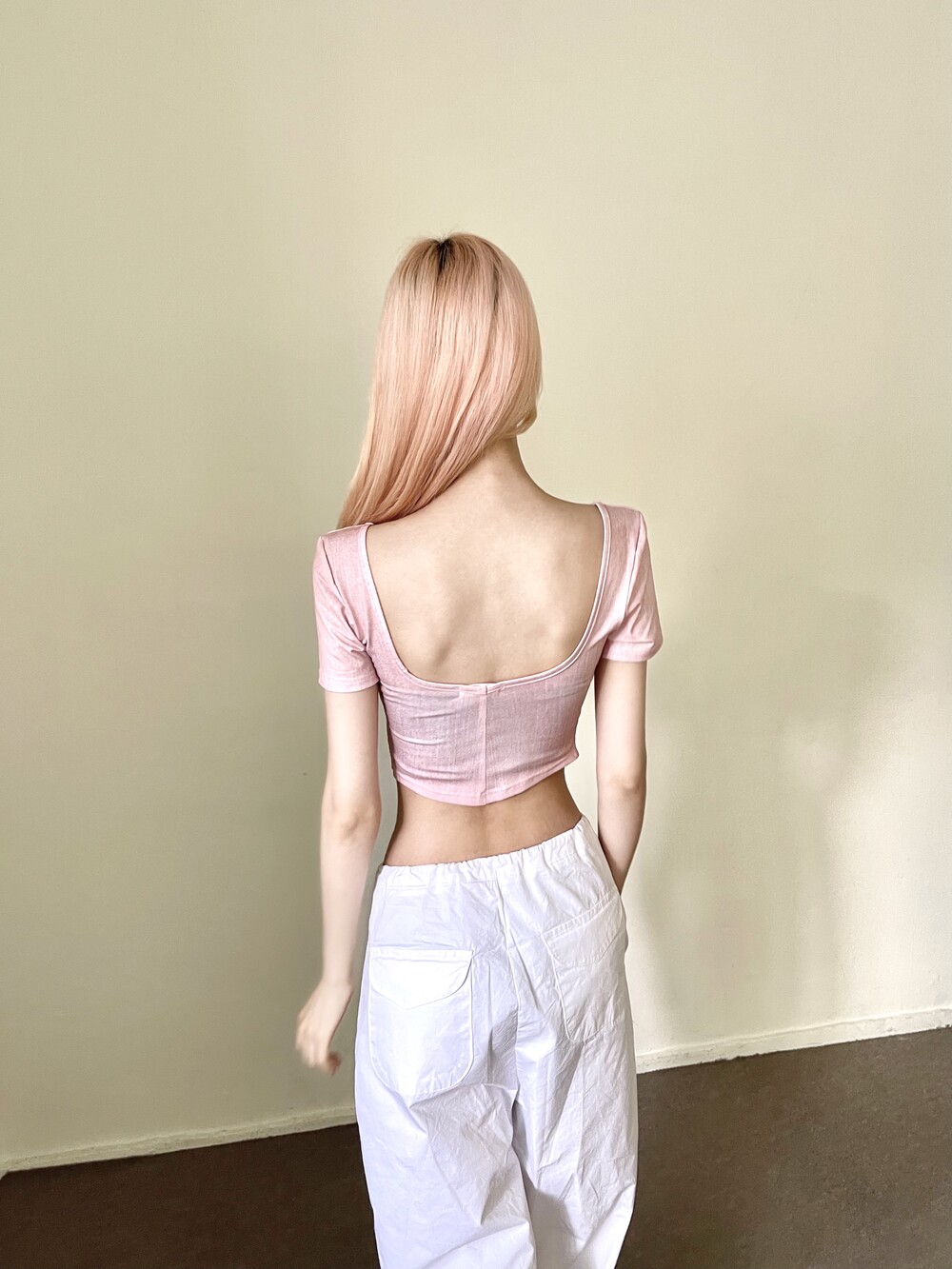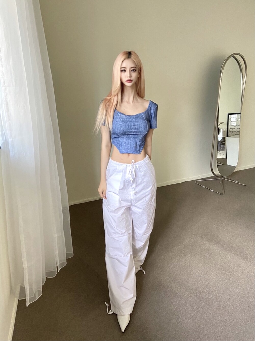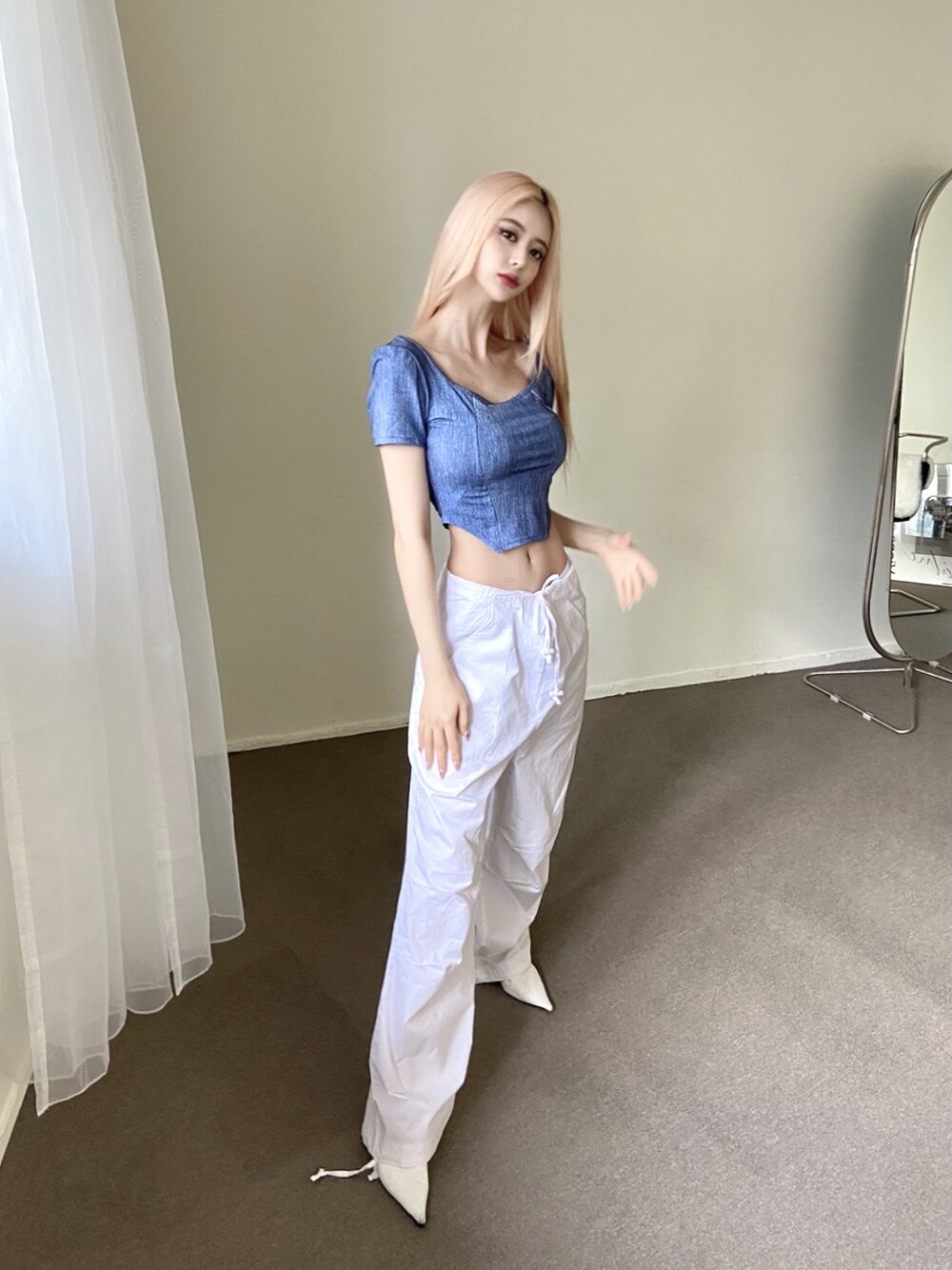 쿨링 데님 프린팅 코르셋라인 크롭 티셔츠