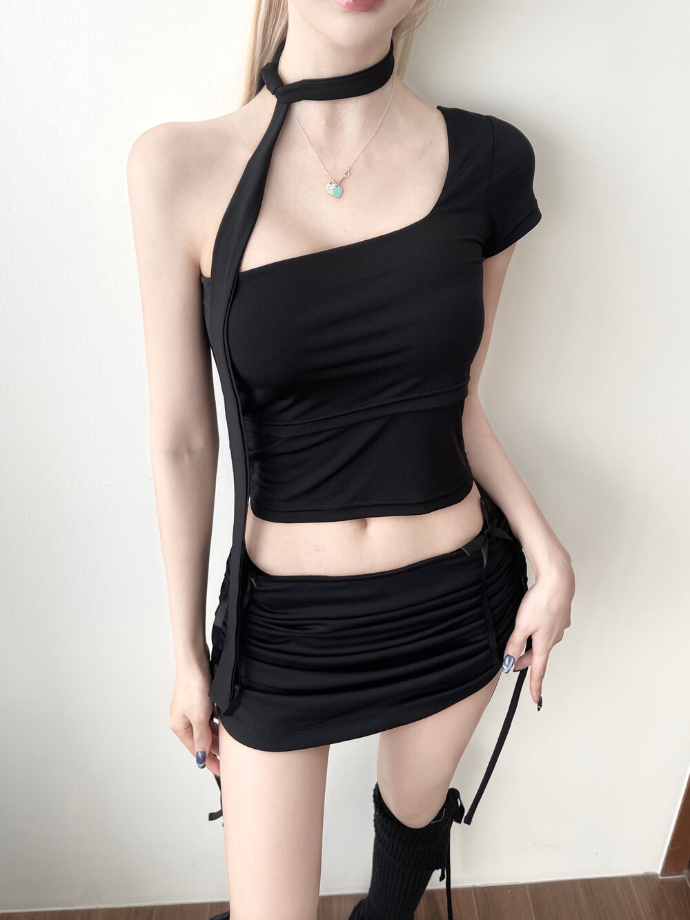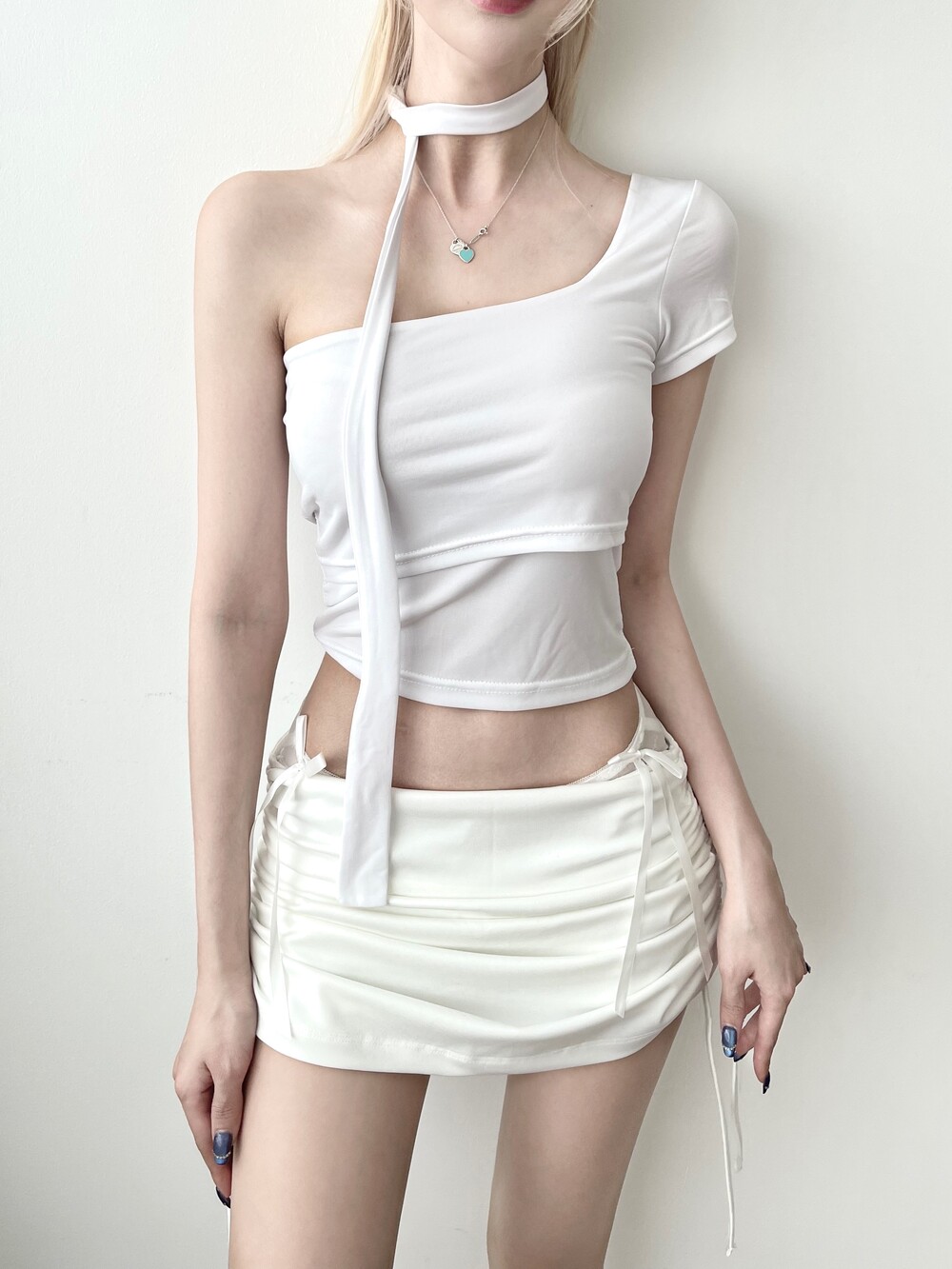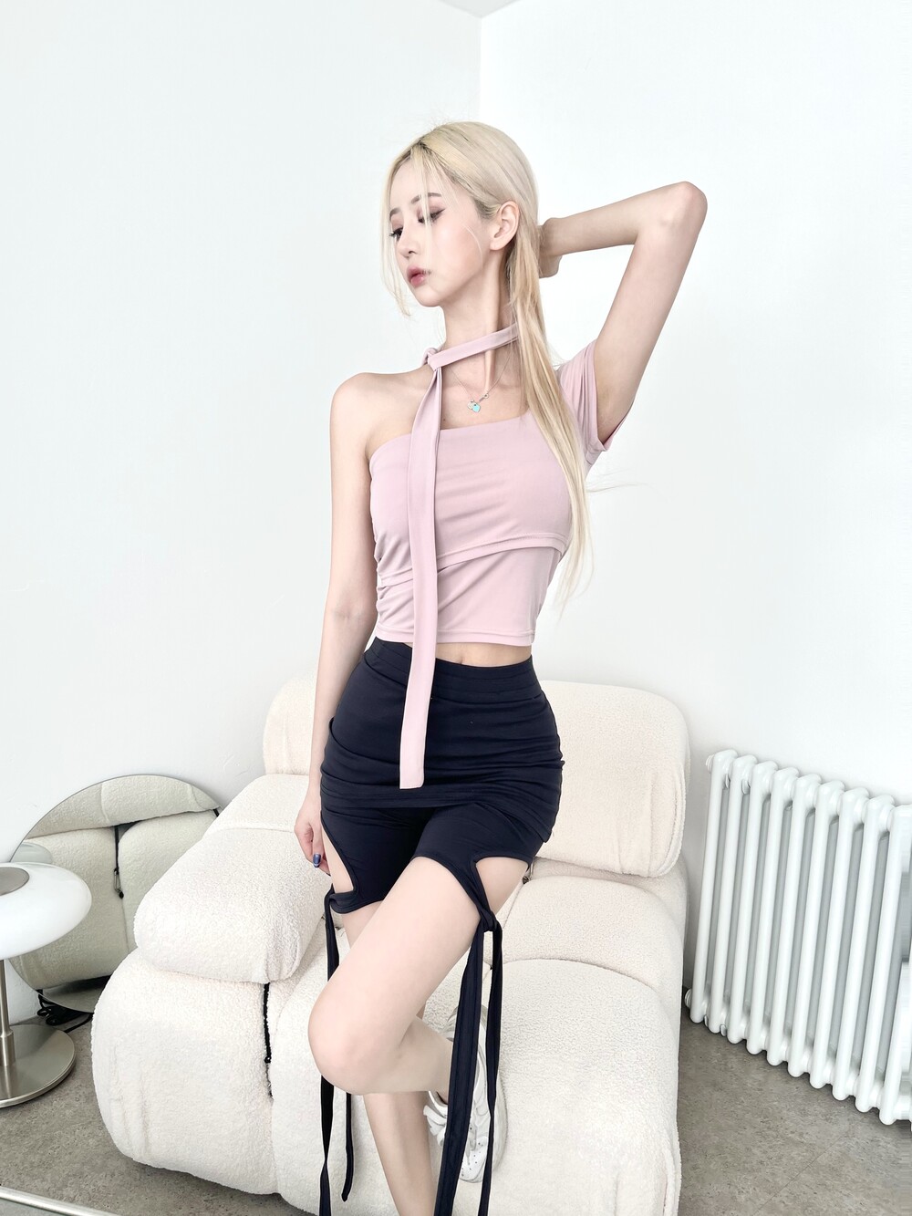 언발 원숄더 스퀘어 스판 스카프 티셔츠 탑 세트