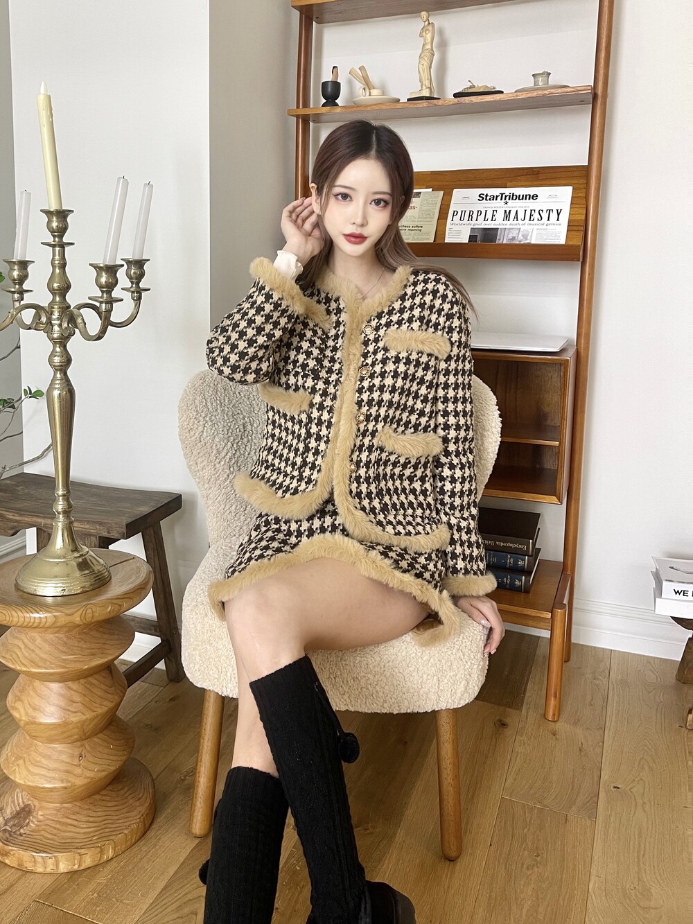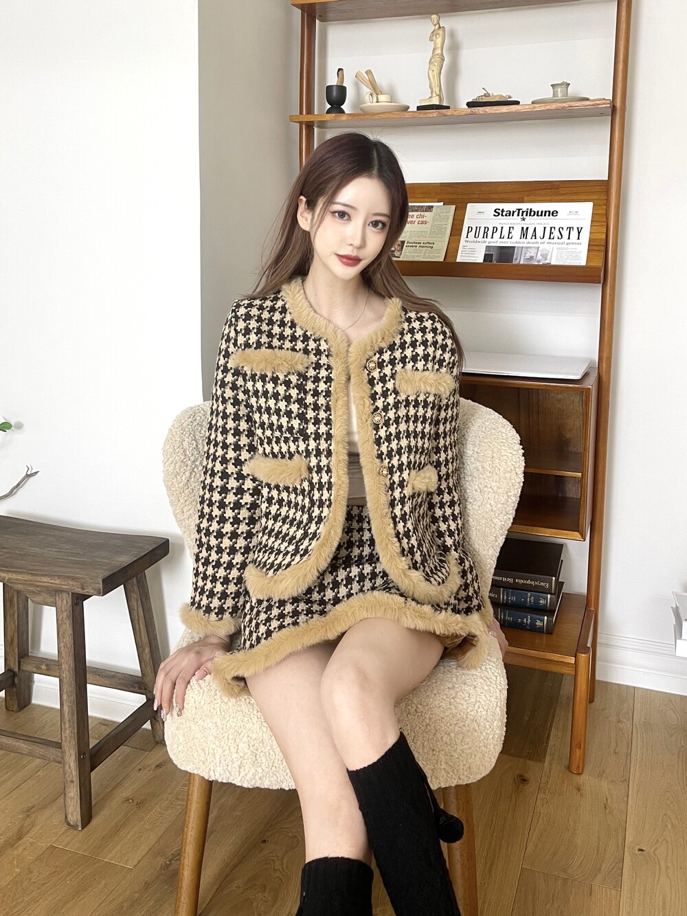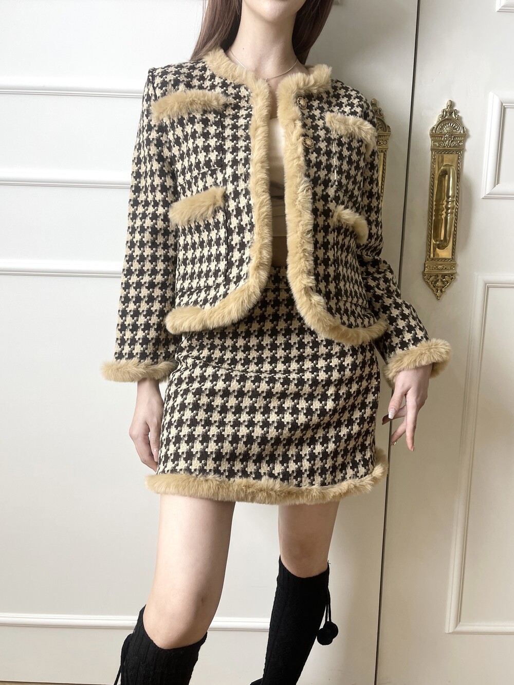 자켓과 스커트 모두 소프트한 텍스쳐의 융안감 처리로