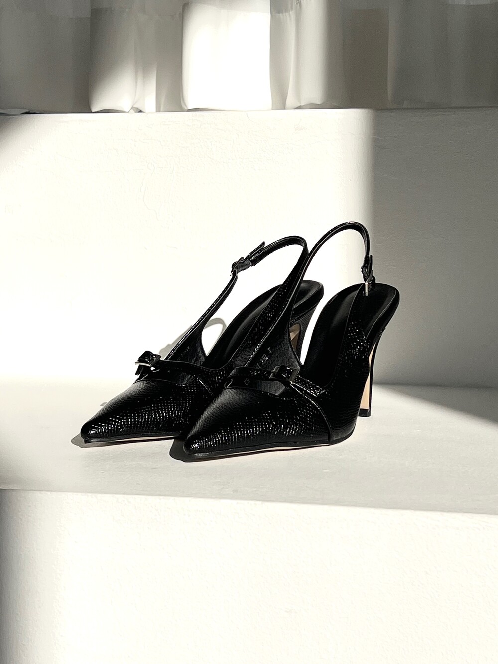 시크하면서도 미니멀한 실버 버클이 매력적인 슬링백