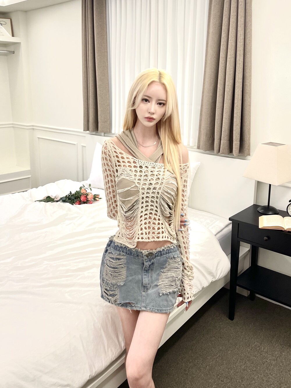 데미지 컷아웃 데님 로우 미니 스커트