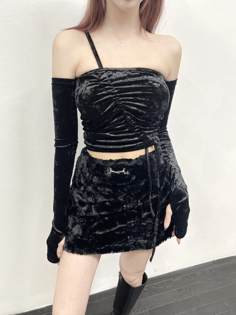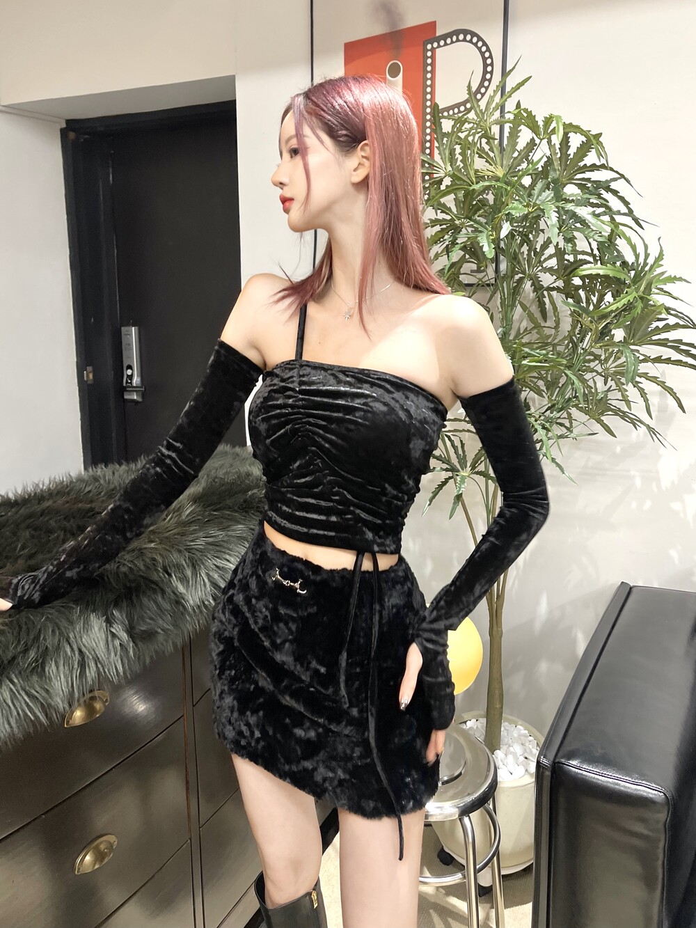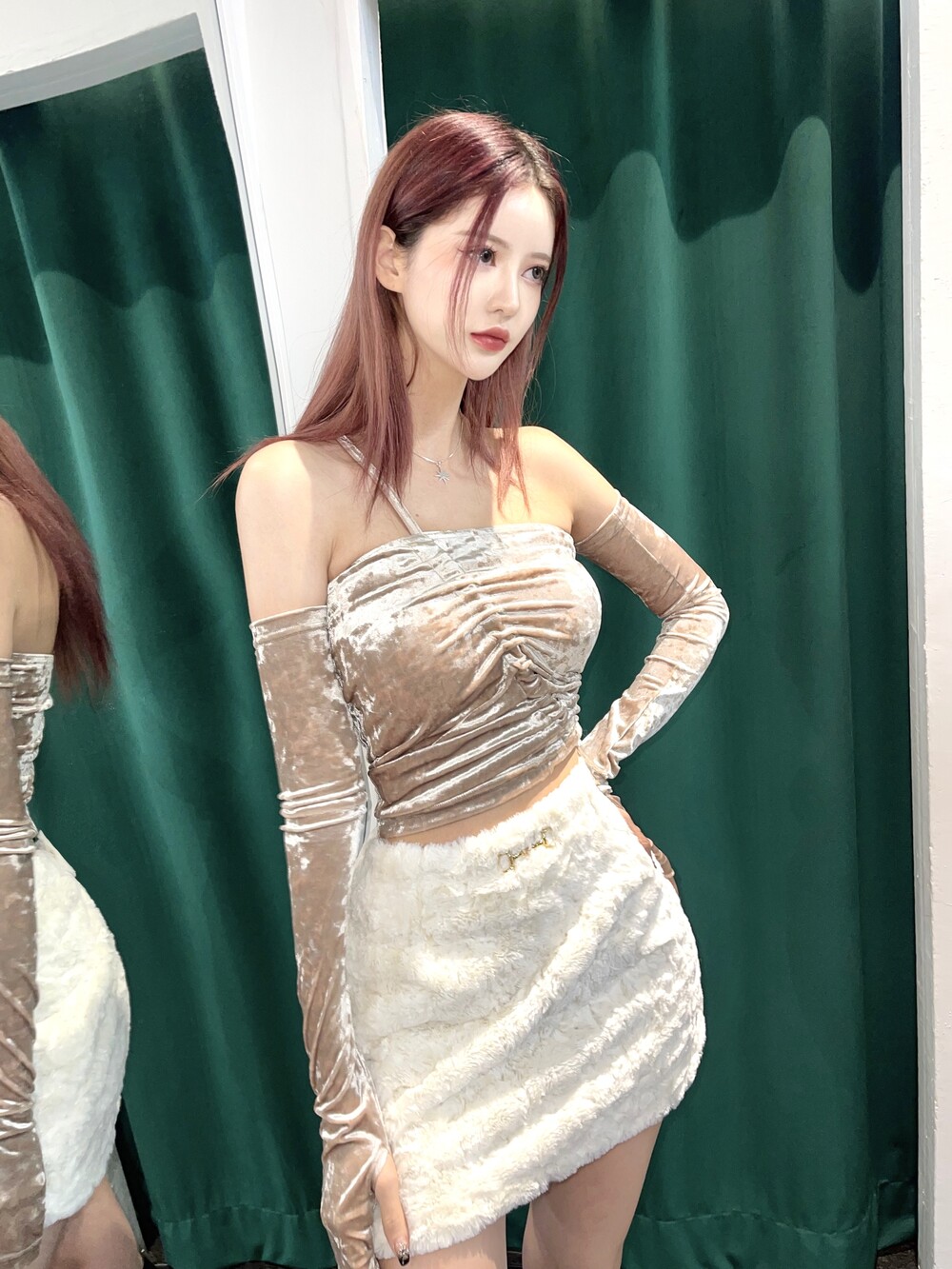 벨벳 원단으로 제작된 언발 디자인의 탑 워머 세트