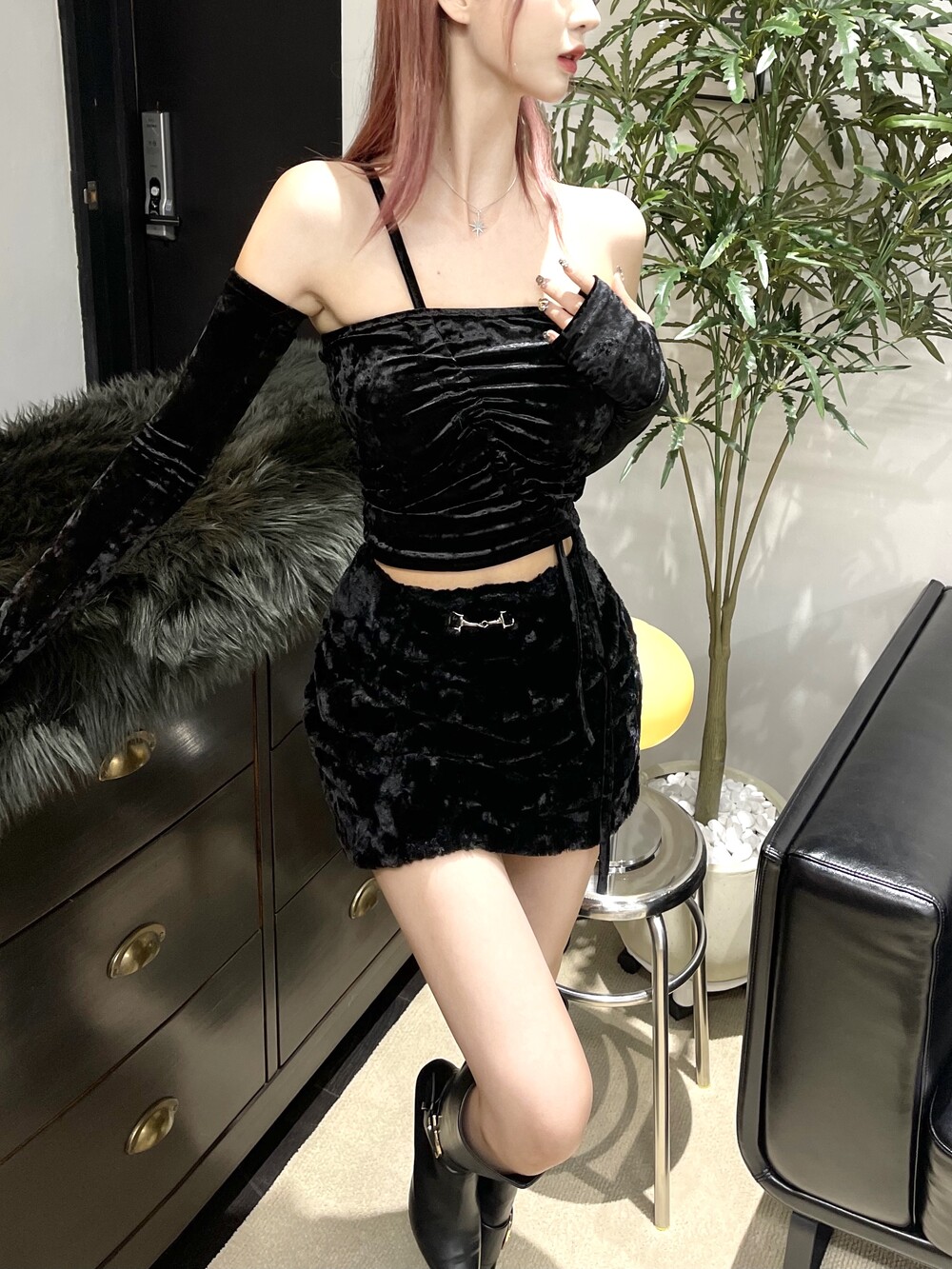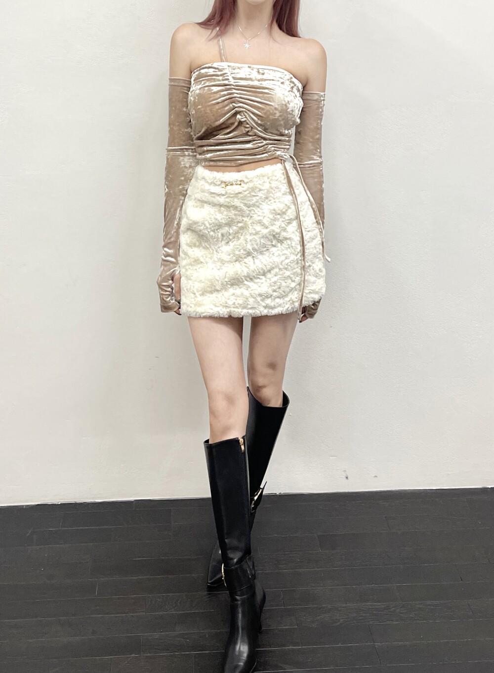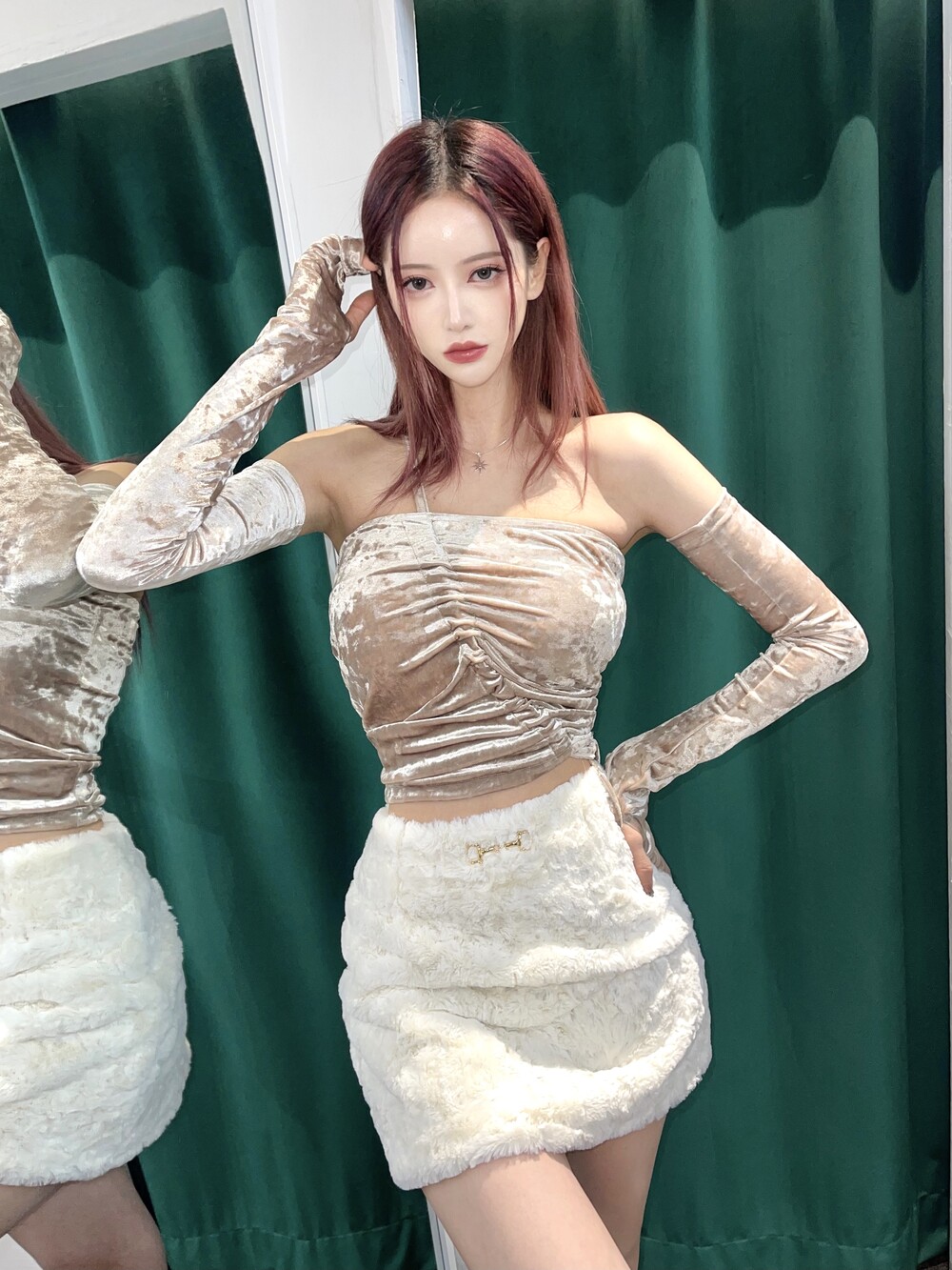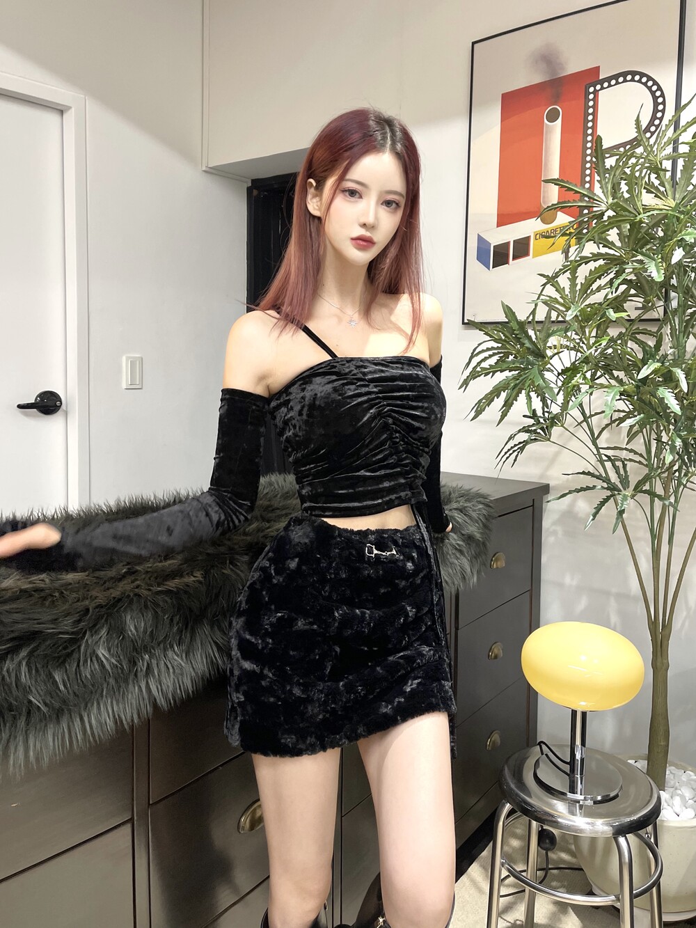 벨벳 원단으로 제작된 언발 디자인의 탑 워머 세트
