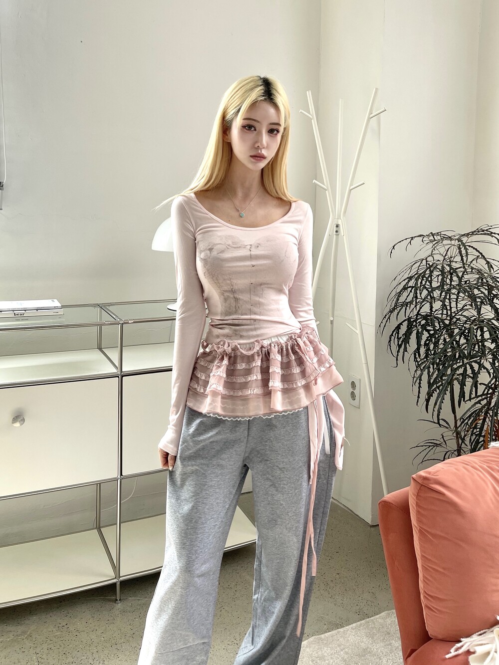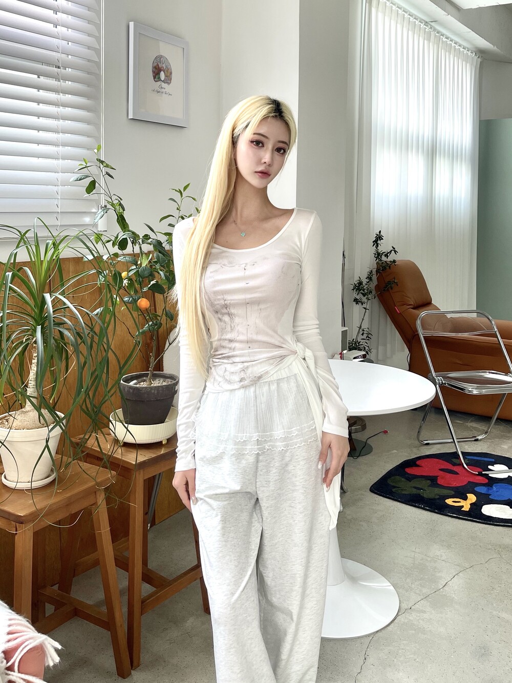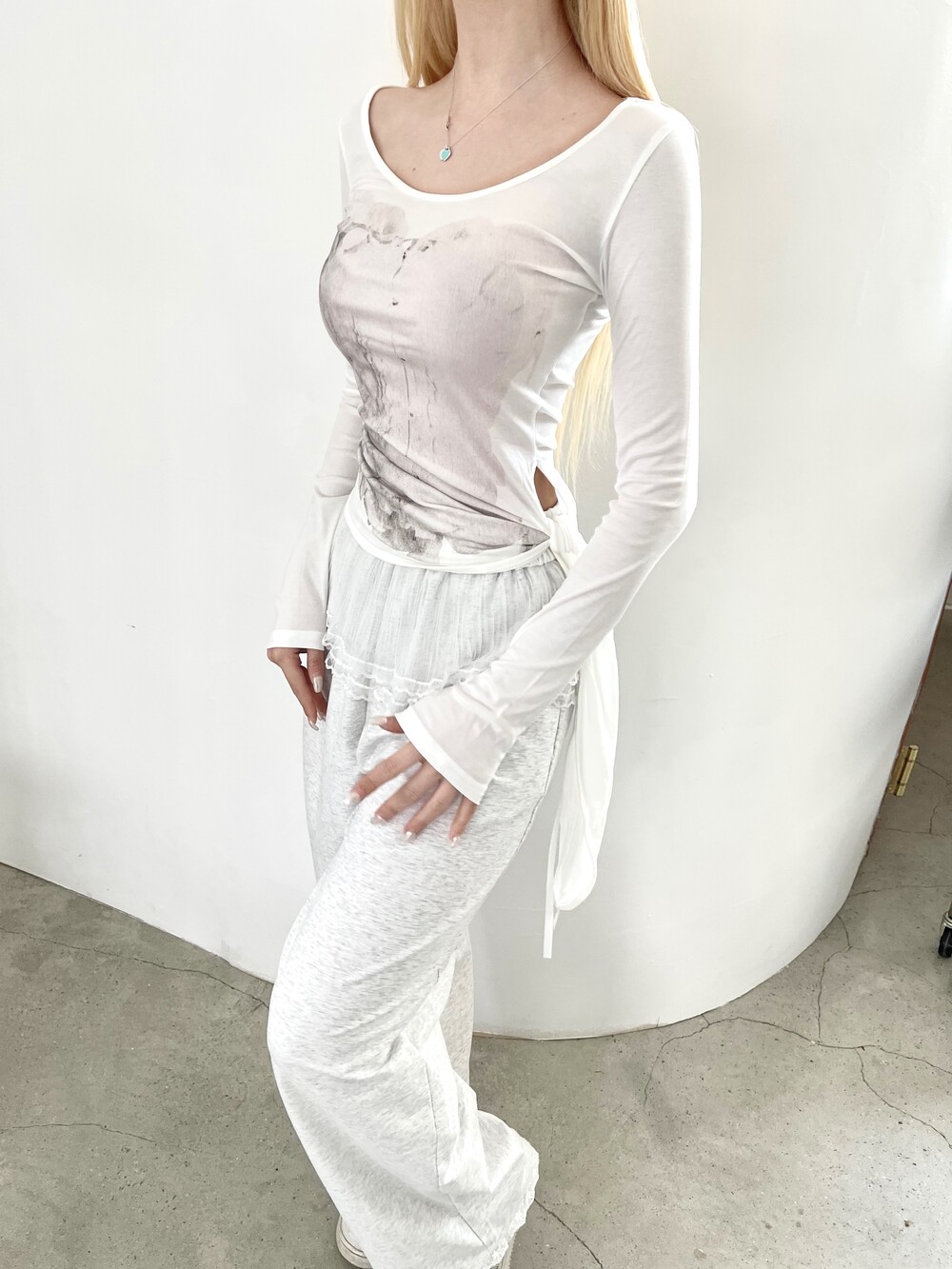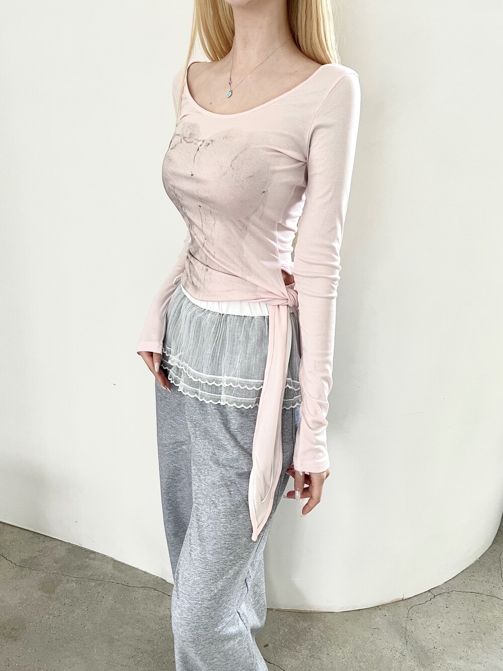 코르셋 프린팅 포인트 스판 리본 롱 슬리브 티셔츠