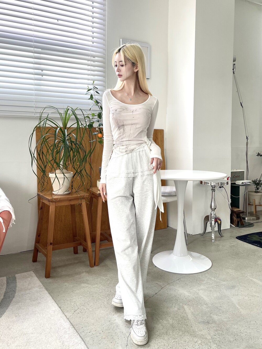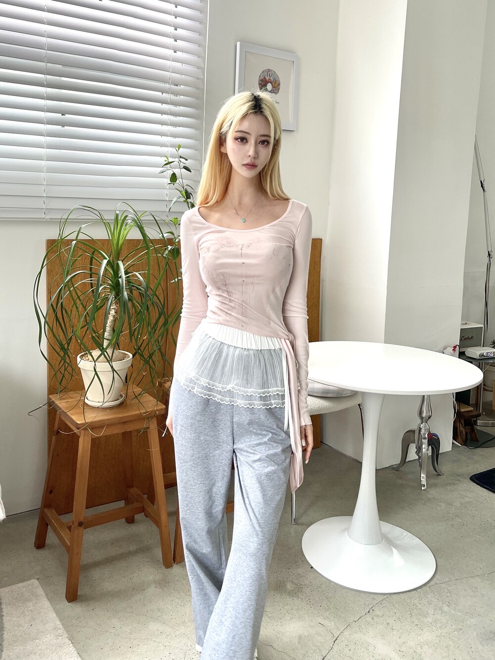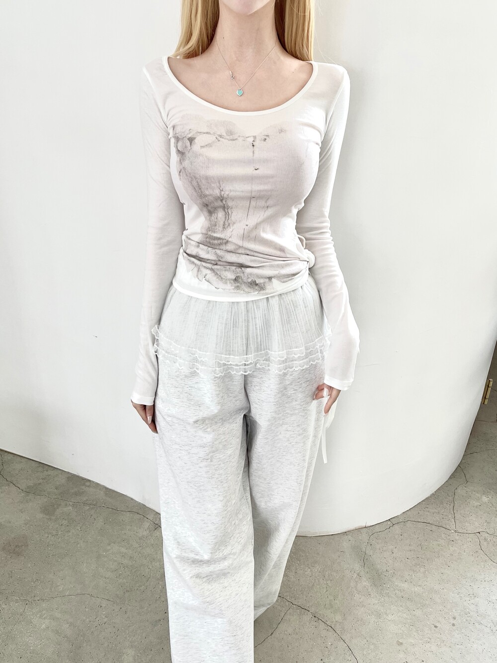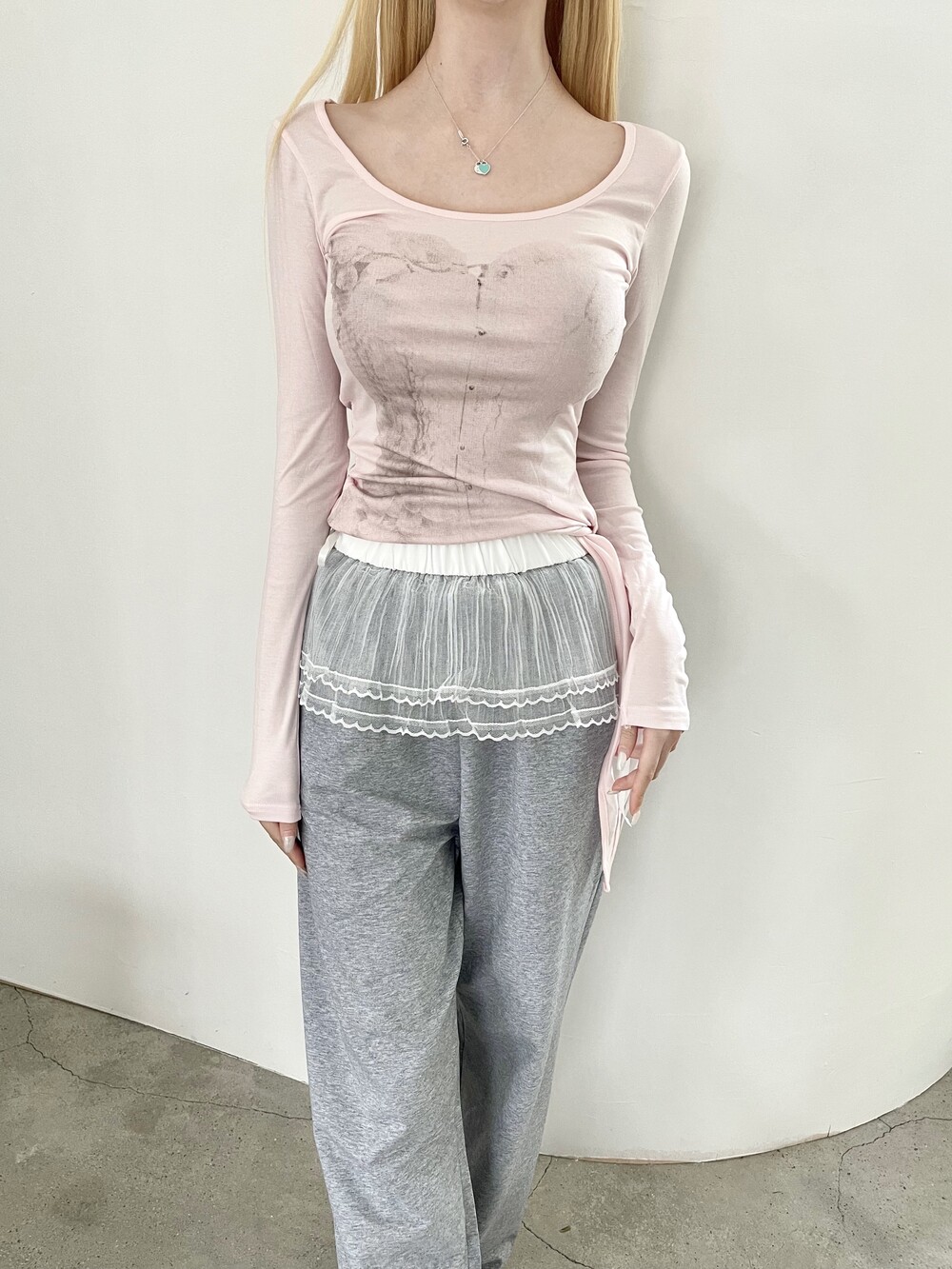 코르셋 프린팅 포인트 스판 리본 롱 슬리브 티셔츠