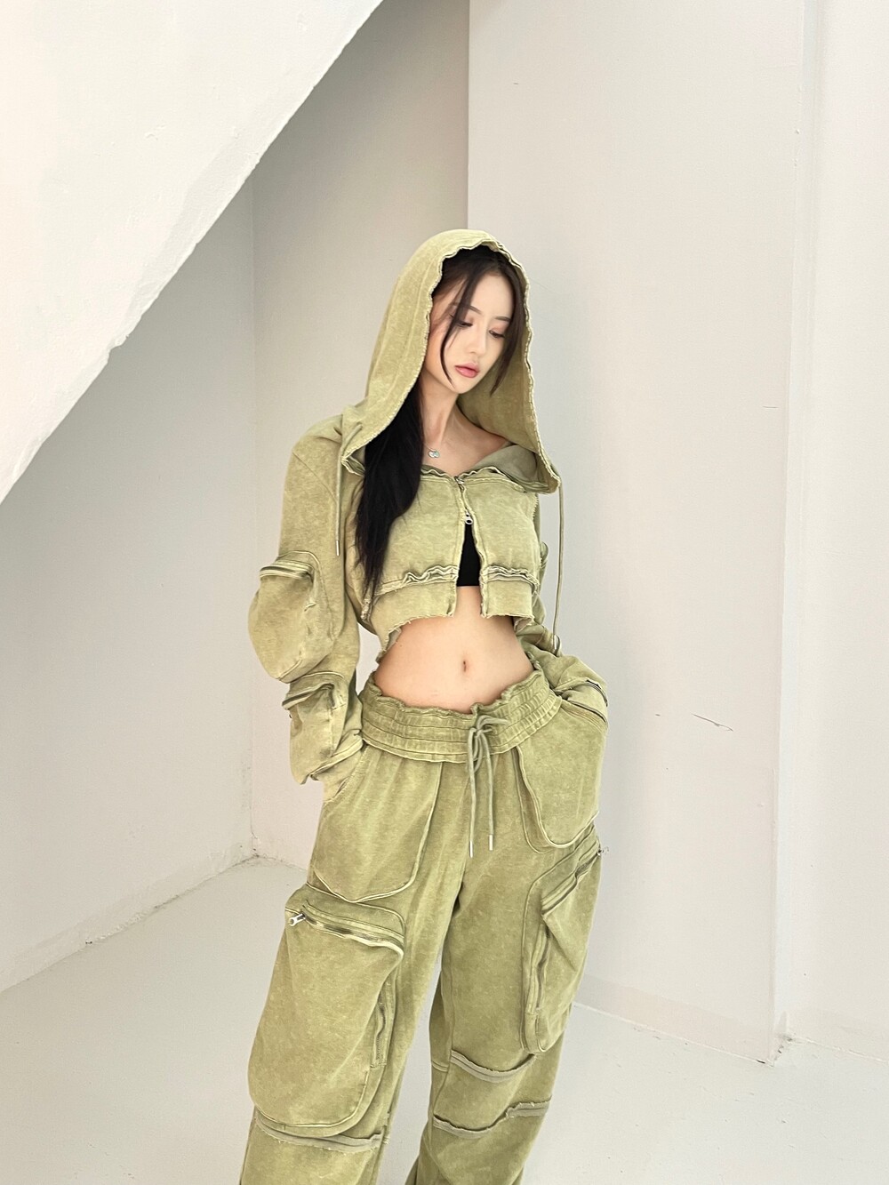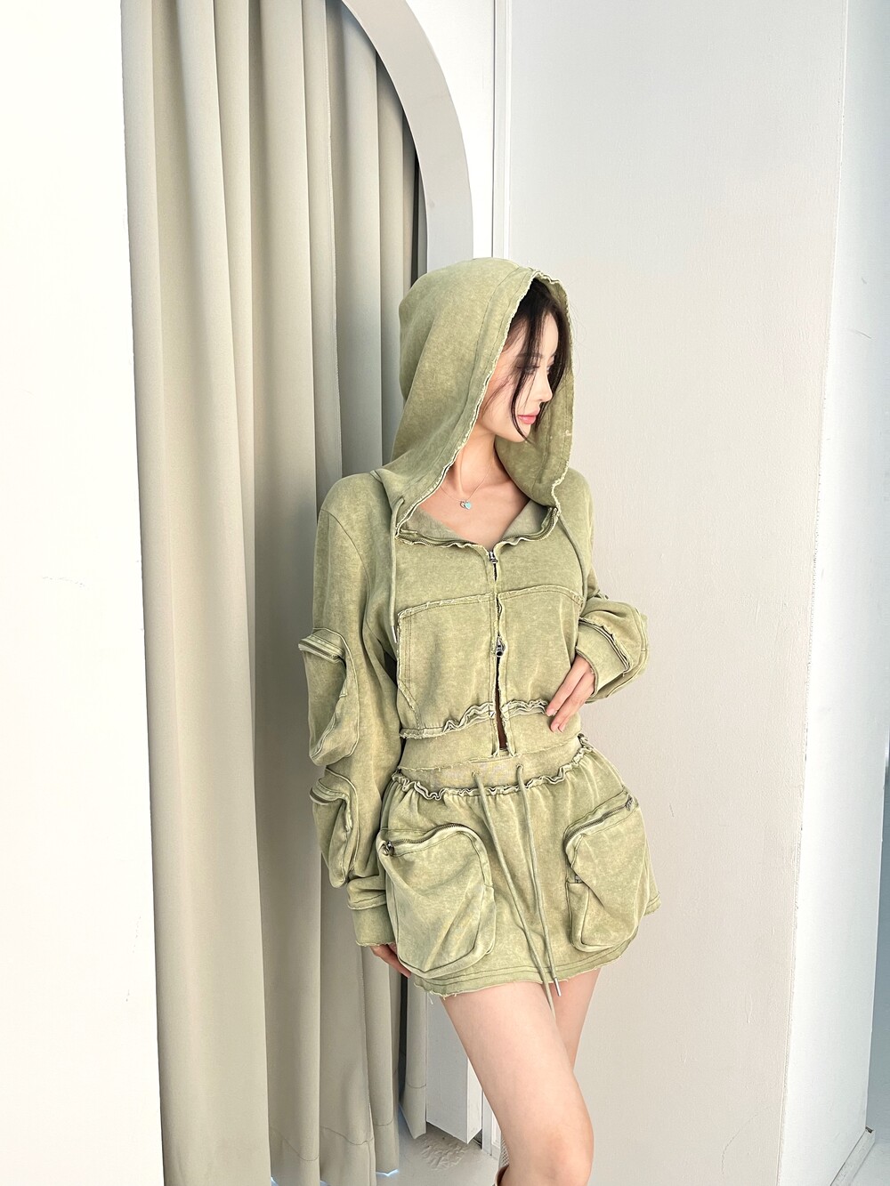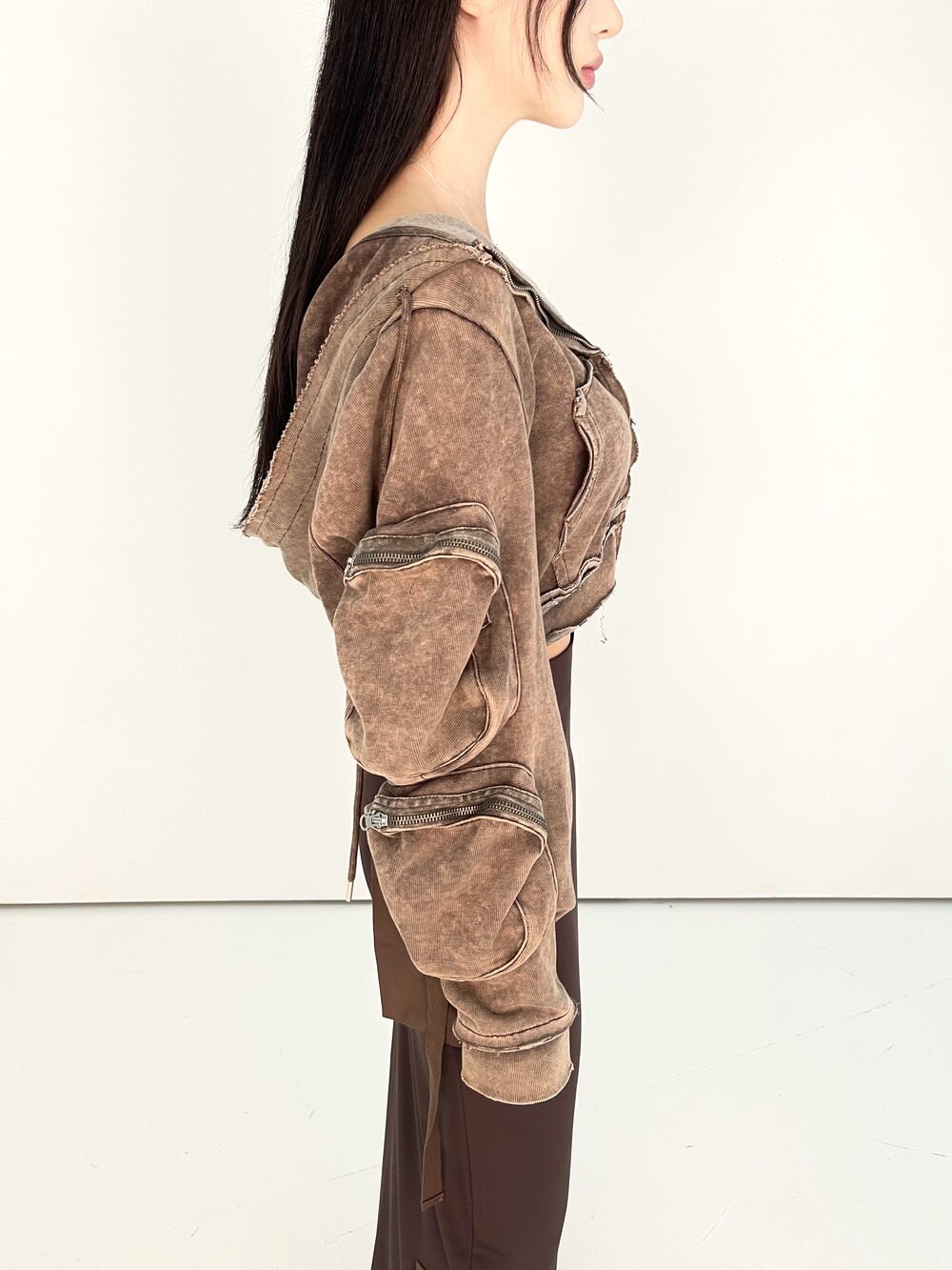 피그먼트 워싱 카고 크롭 후드집업