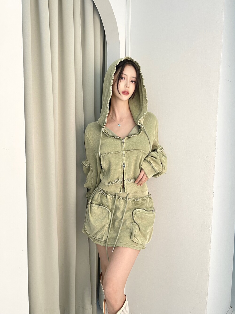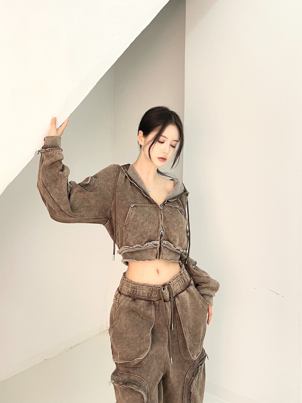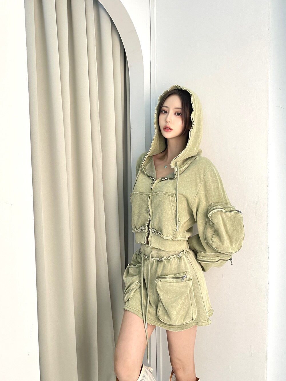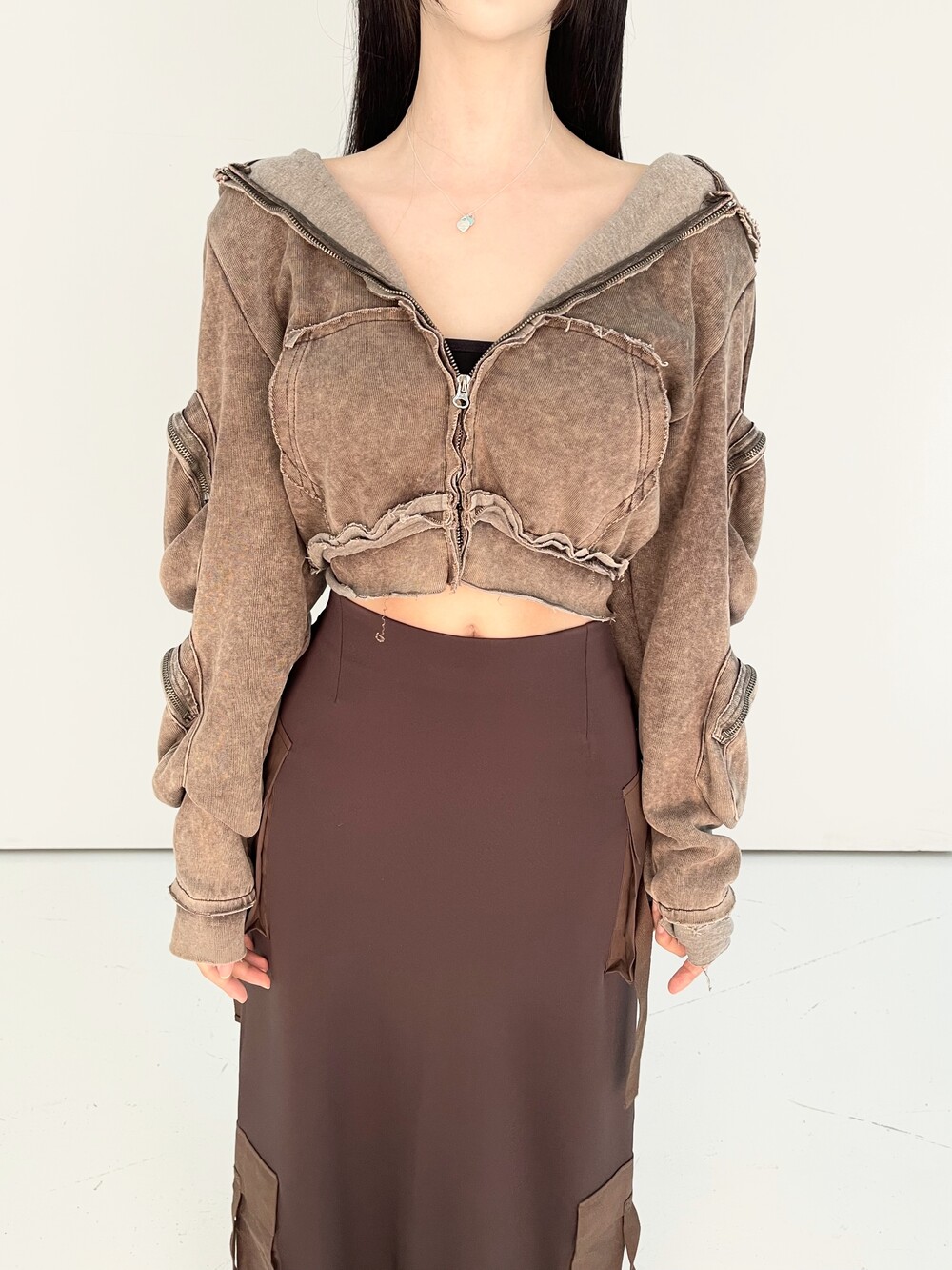 1026. Pigment Washing cargo crop hood zipup (2color)