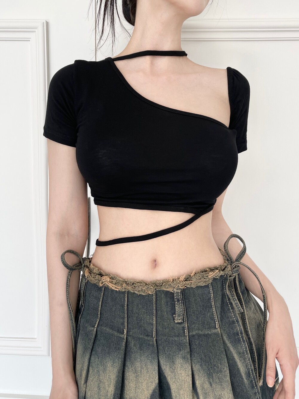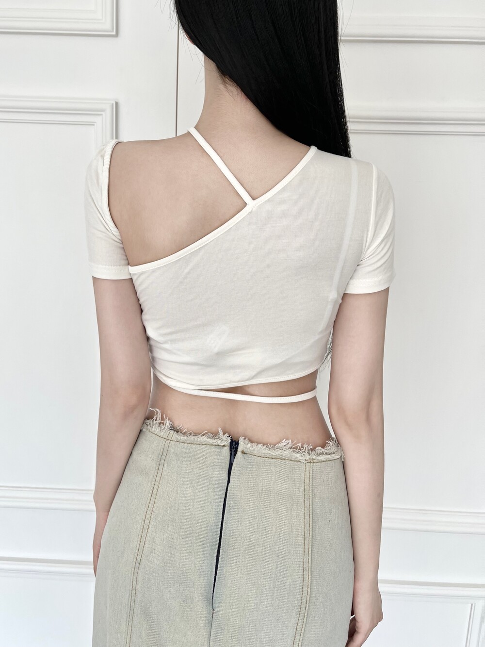 투 스트링 언발 숄더 티