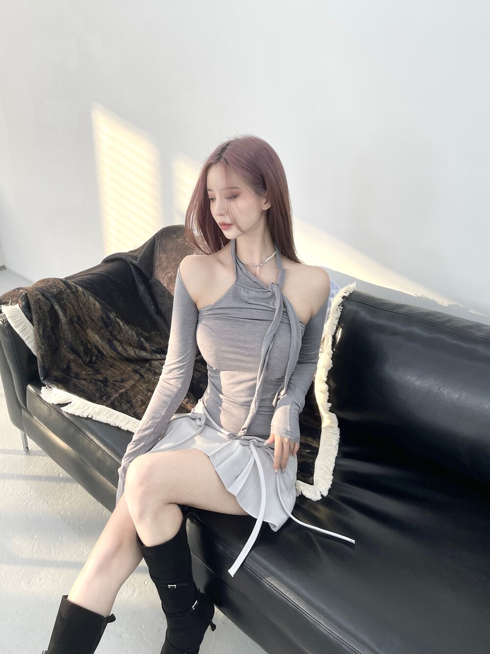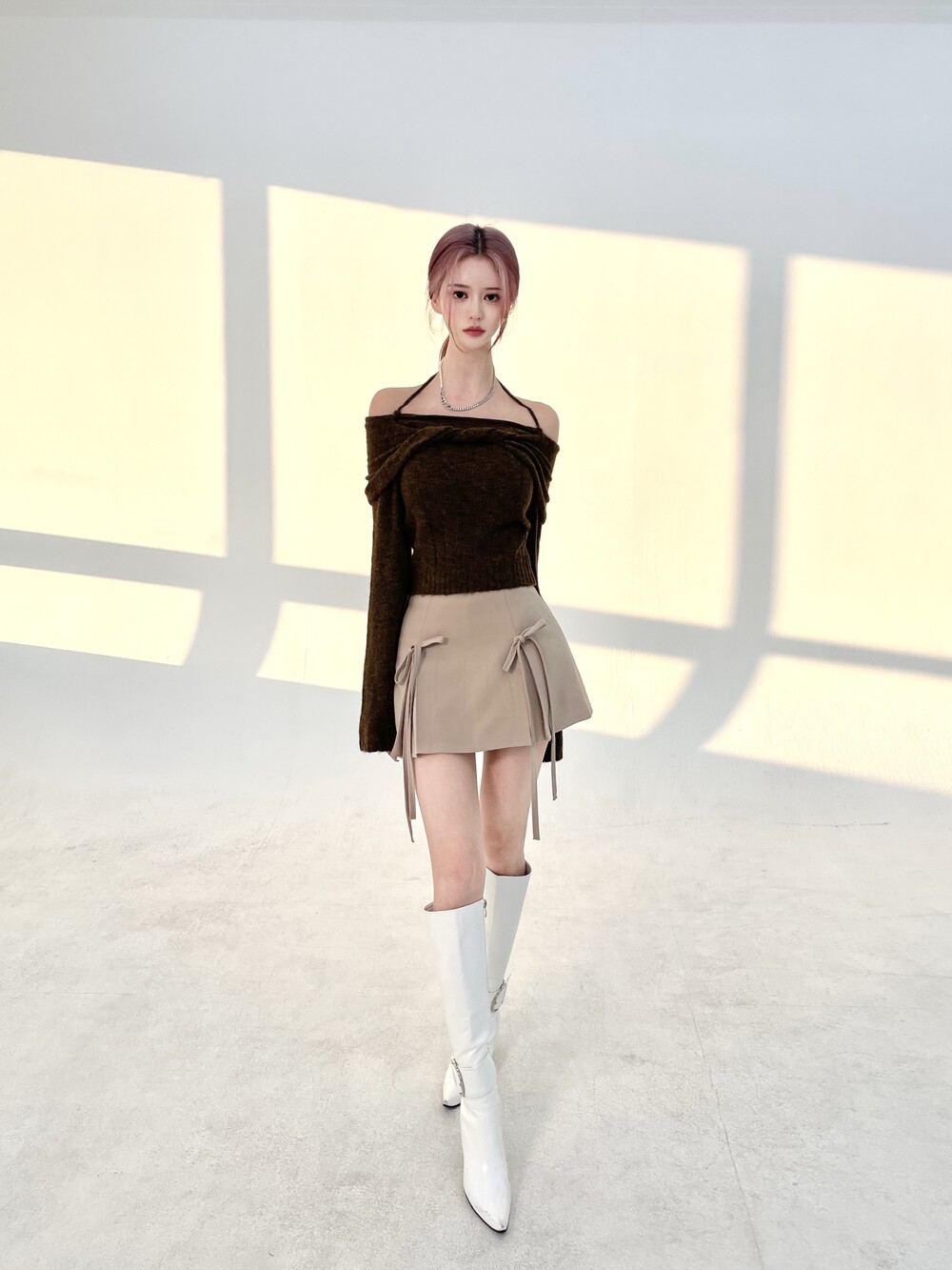 앞판에 리본 스트랩이 더블로 길게 내려와 있어