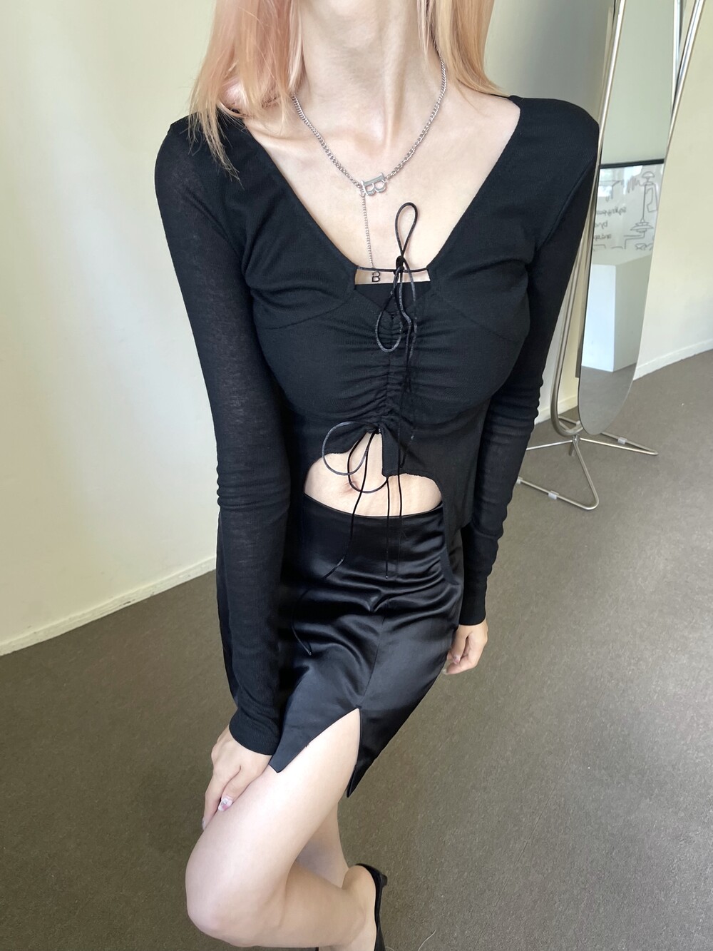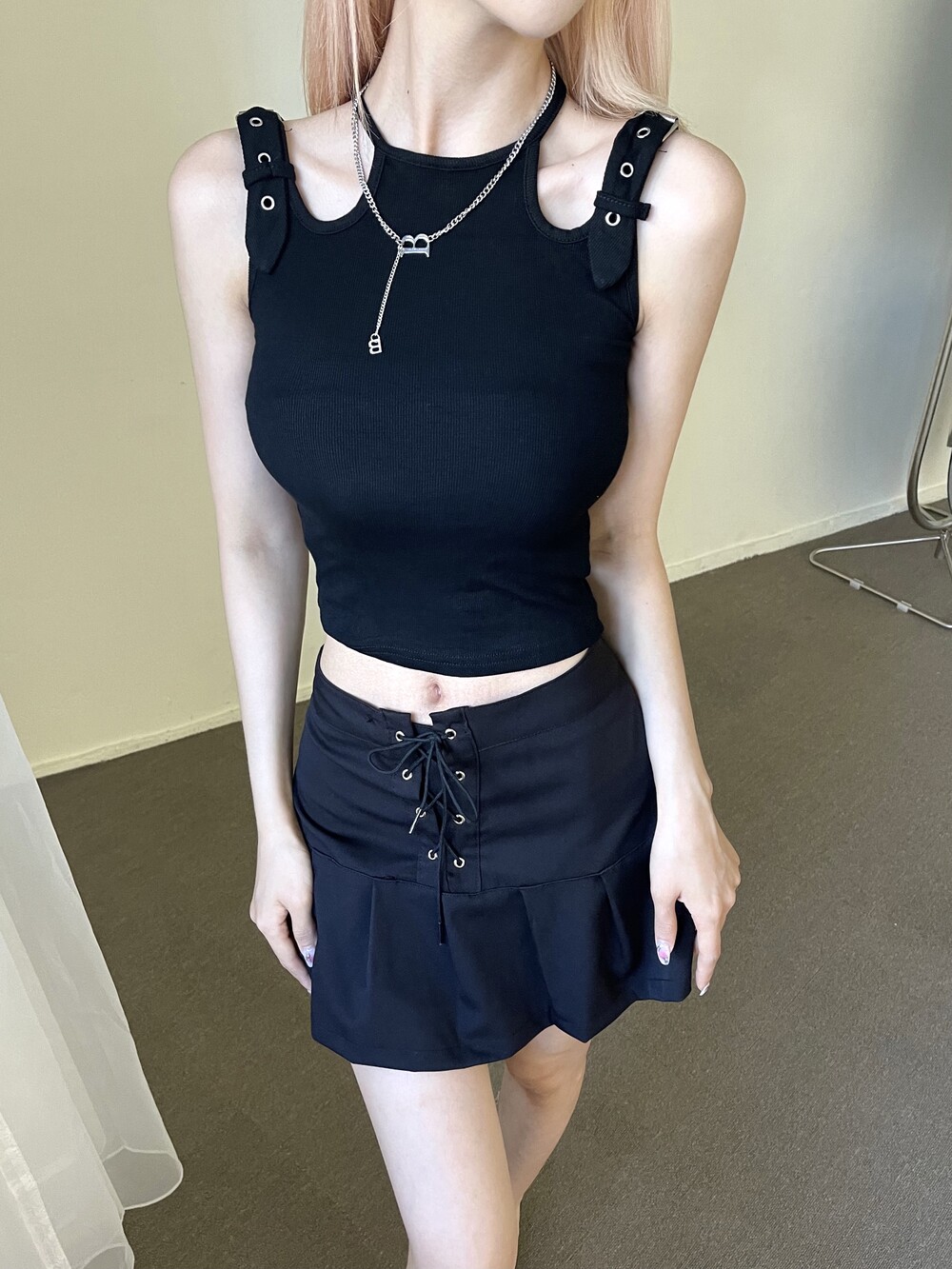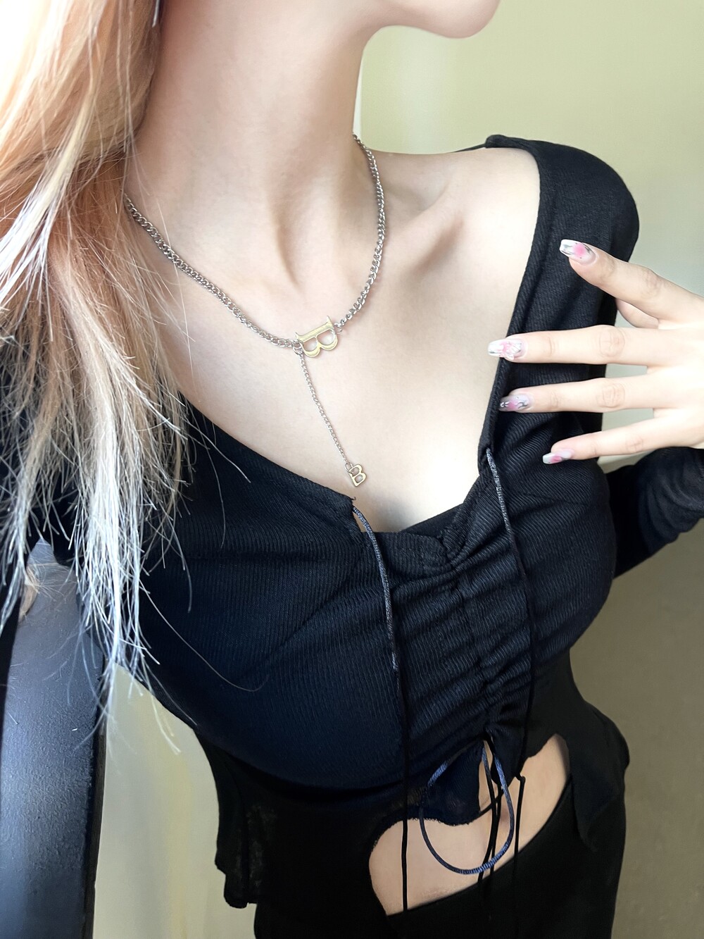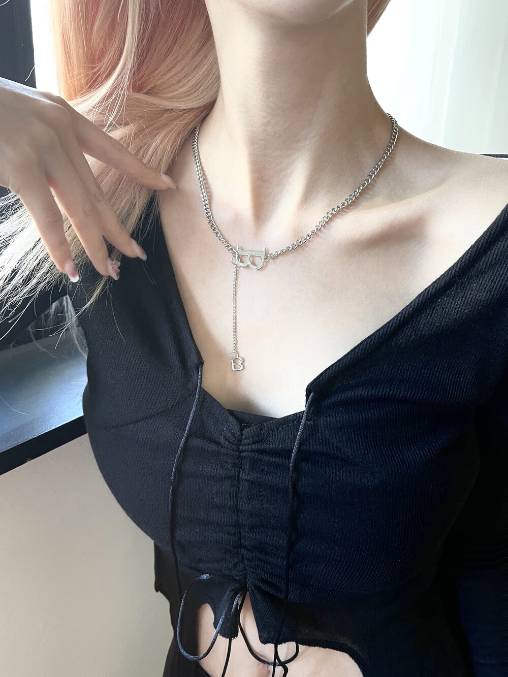B이니셜 참과 체인이 콤비된 디테일