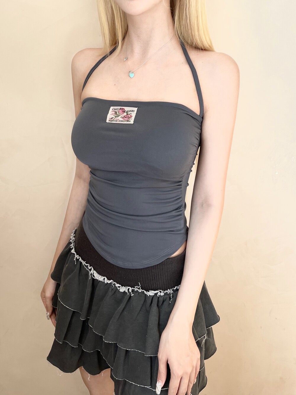 빈치지 무드의 로즈 패치 셔링탑