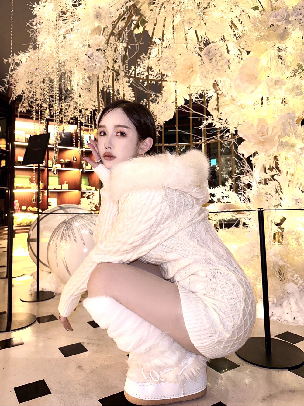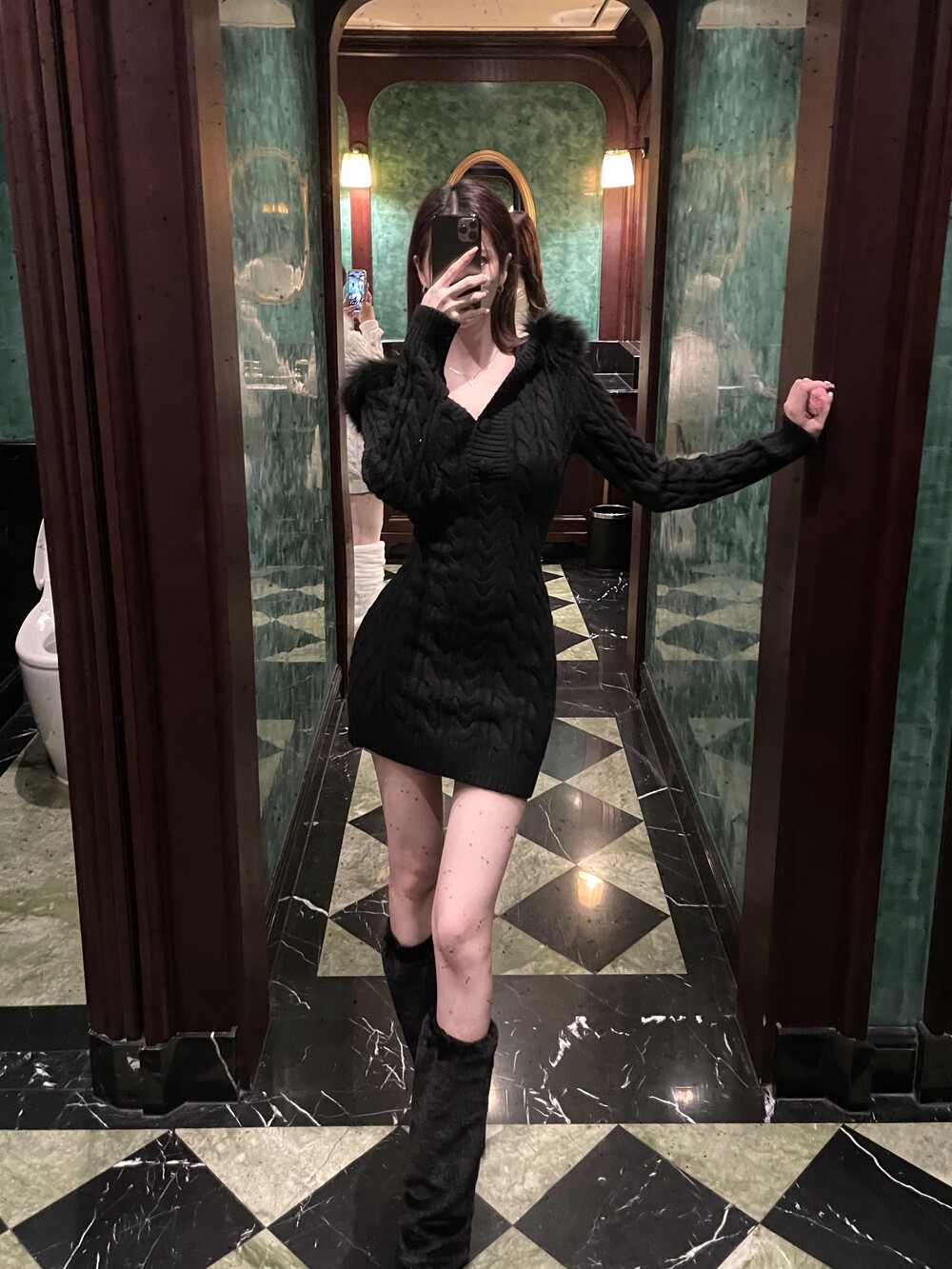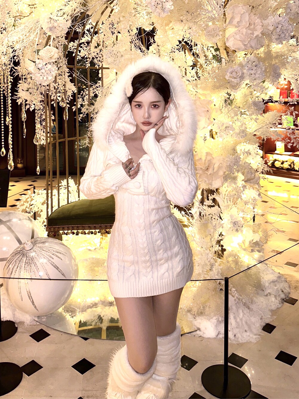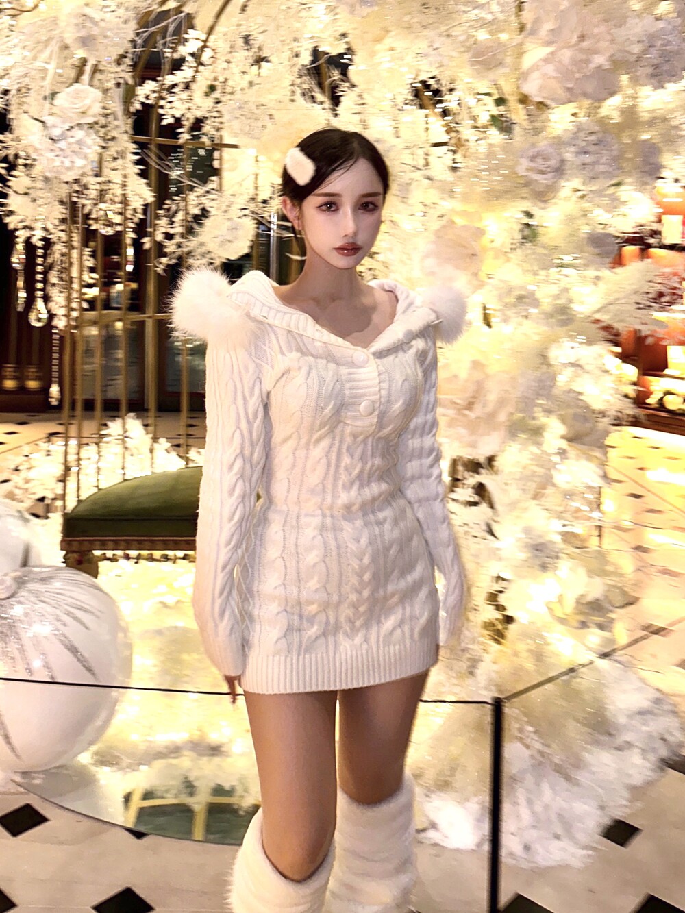 후드 꽈배기 니트 미니 원피스