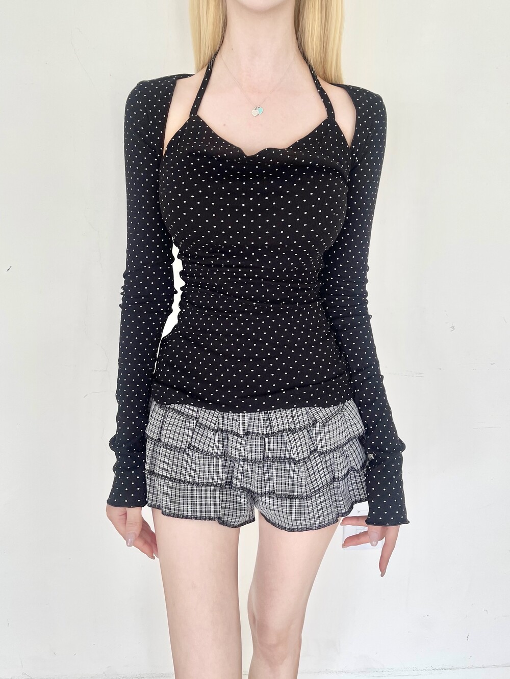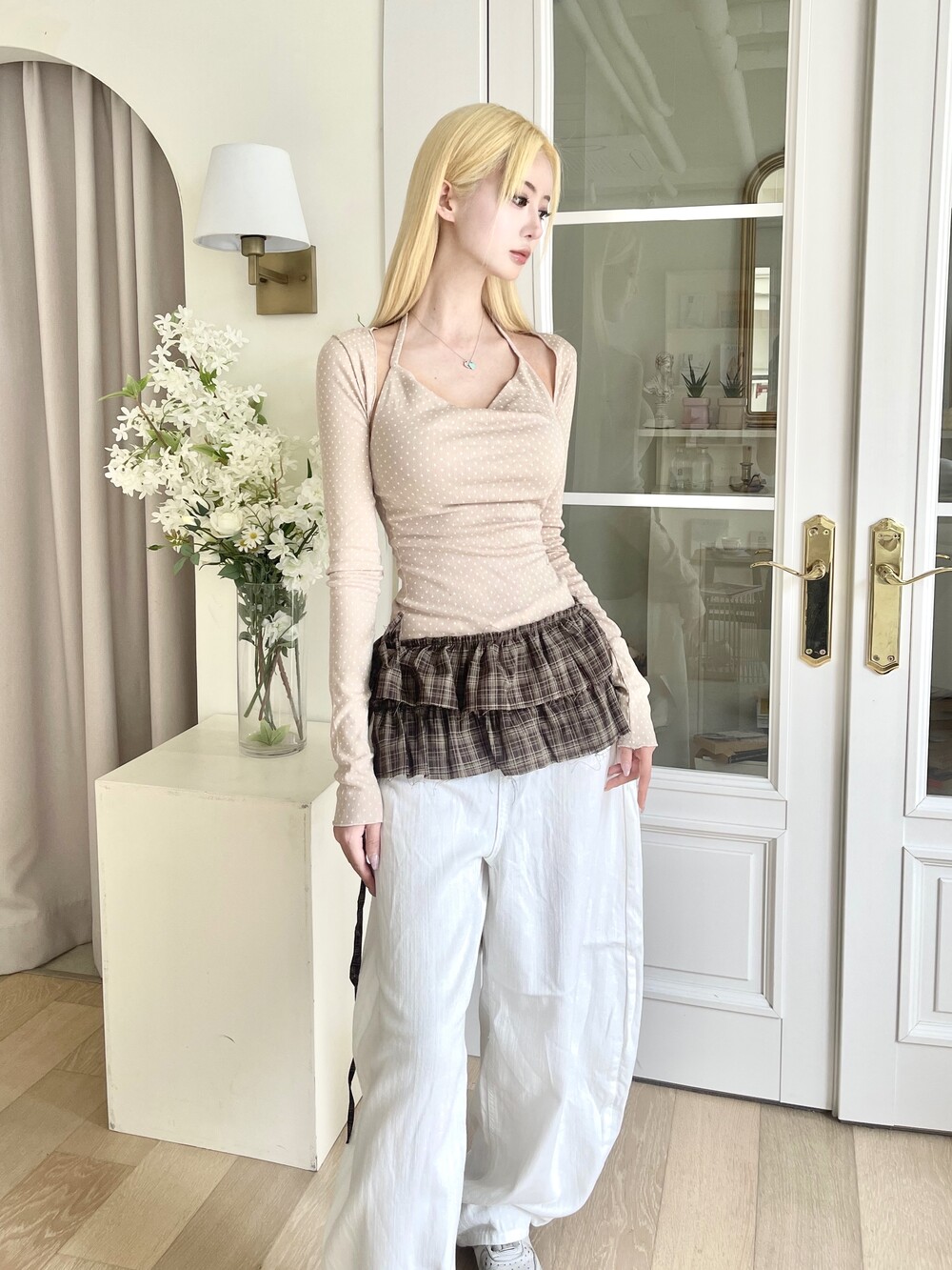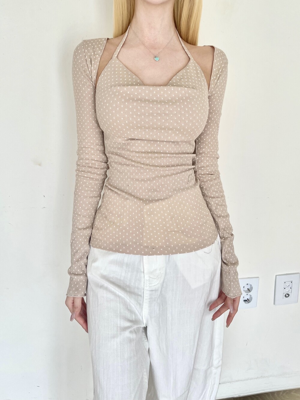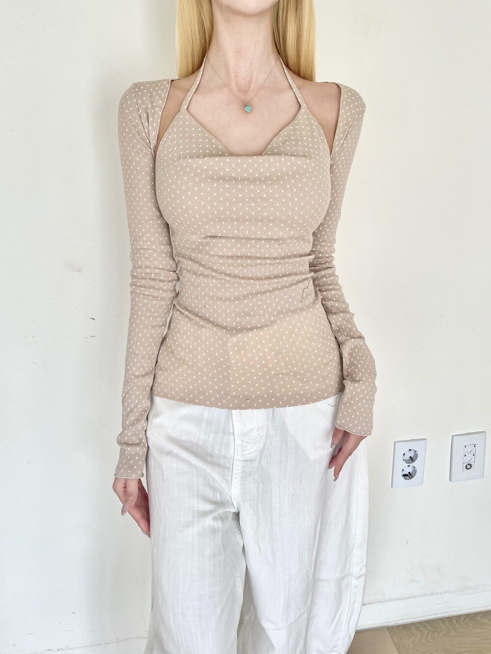 도트 홀터 슬리브리스는 끈을 자유롭게 묶어 착용