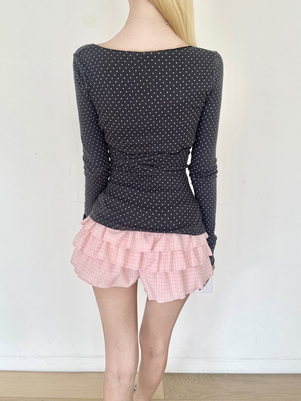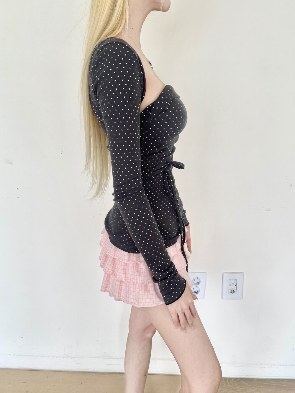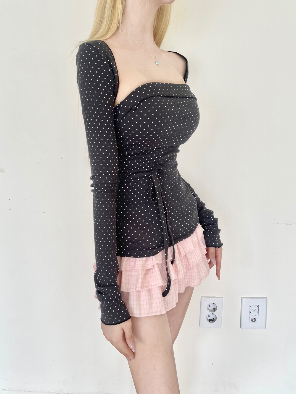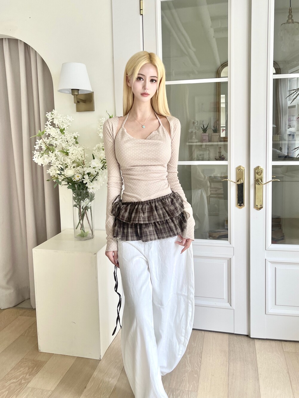 도트 홀터 슬리브리스는 끈을 자유롭게 묶어 착용