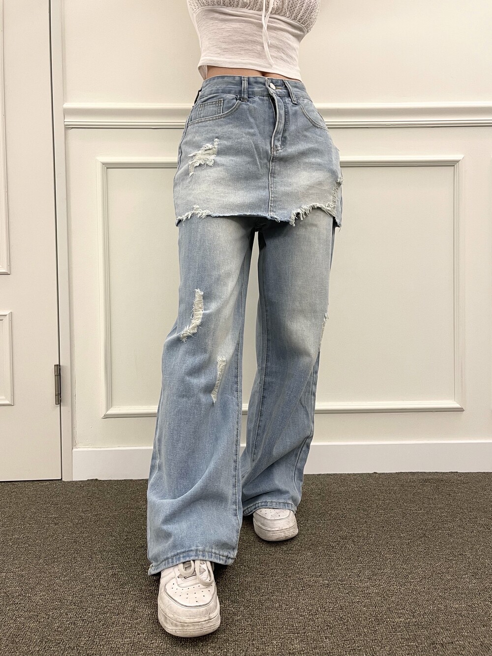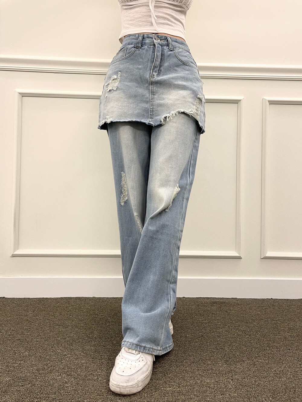 데님 데미지 와이드 레이어드 스커트 팬츠