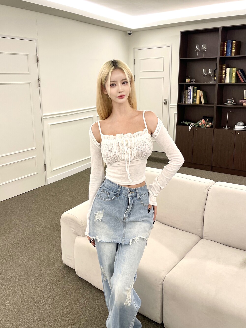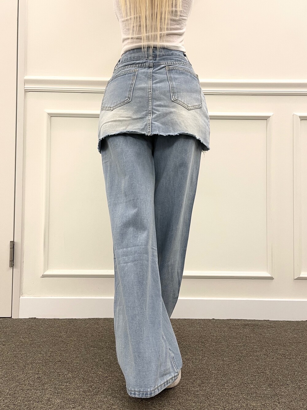와이드 팬츠에 데님 스커트를 레이어드한 듯 한 디자인의
