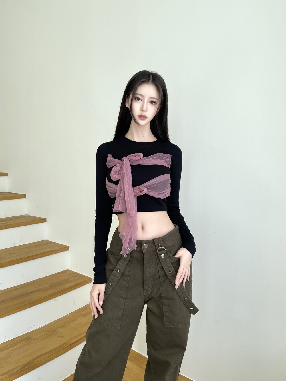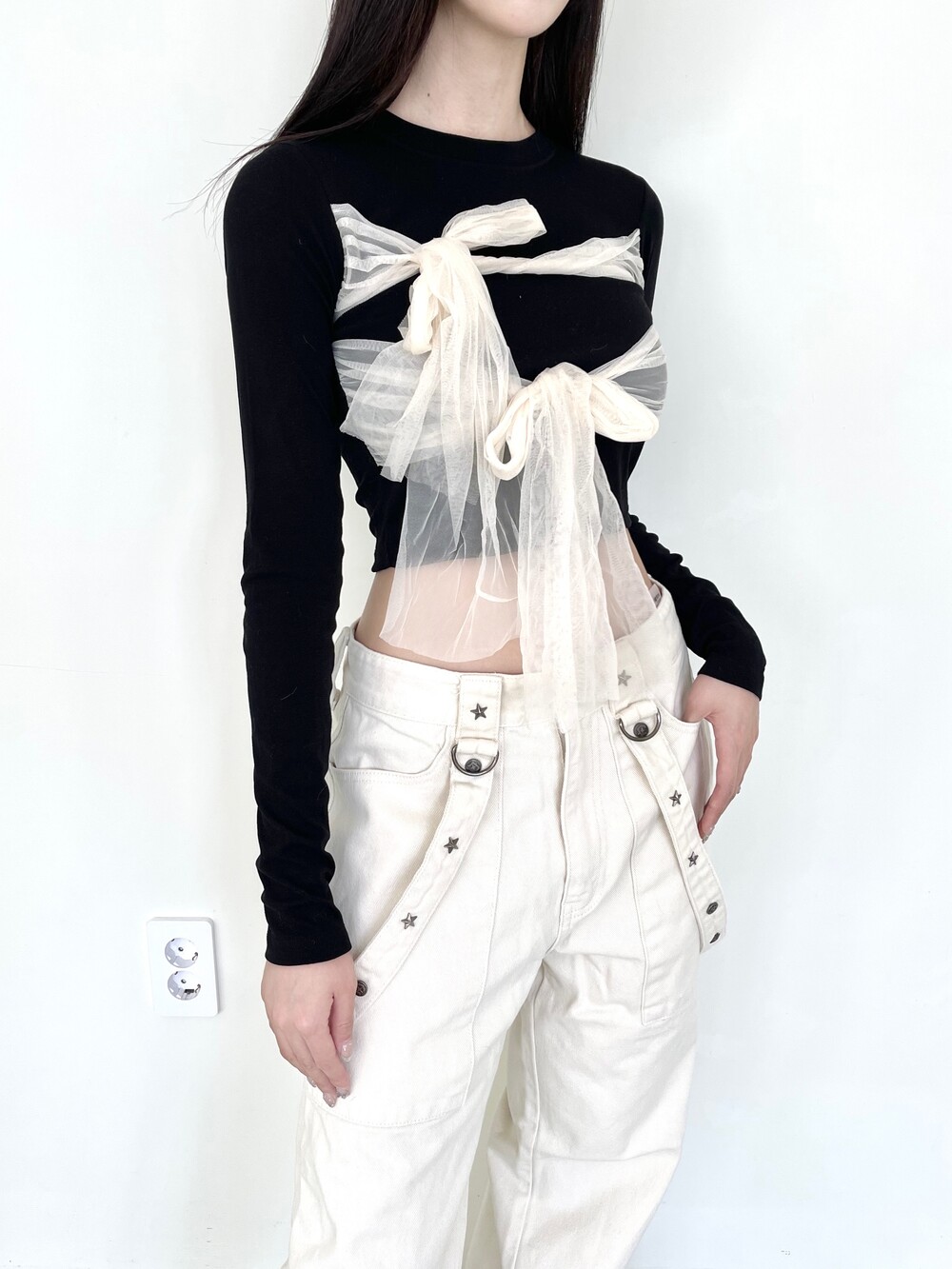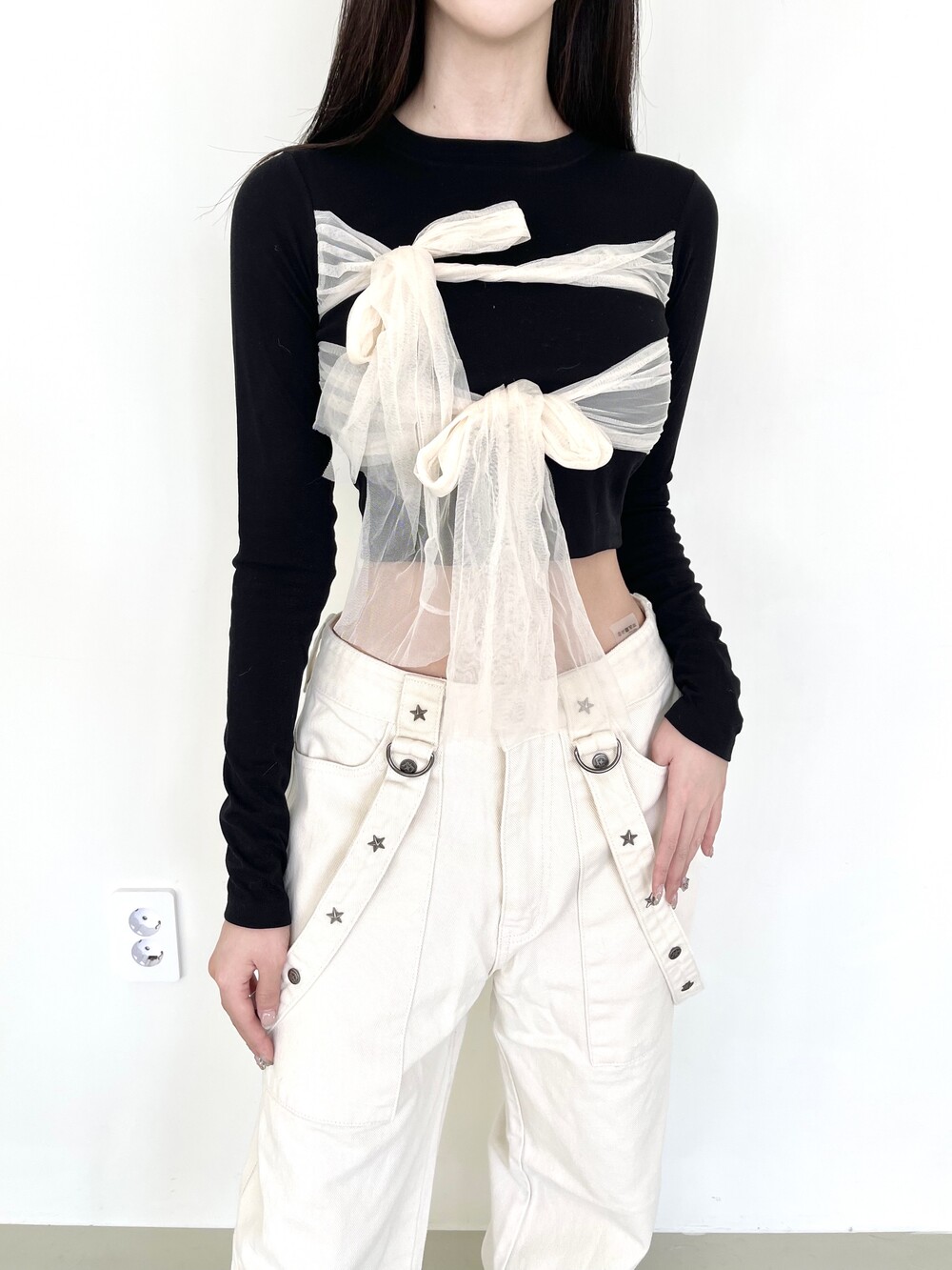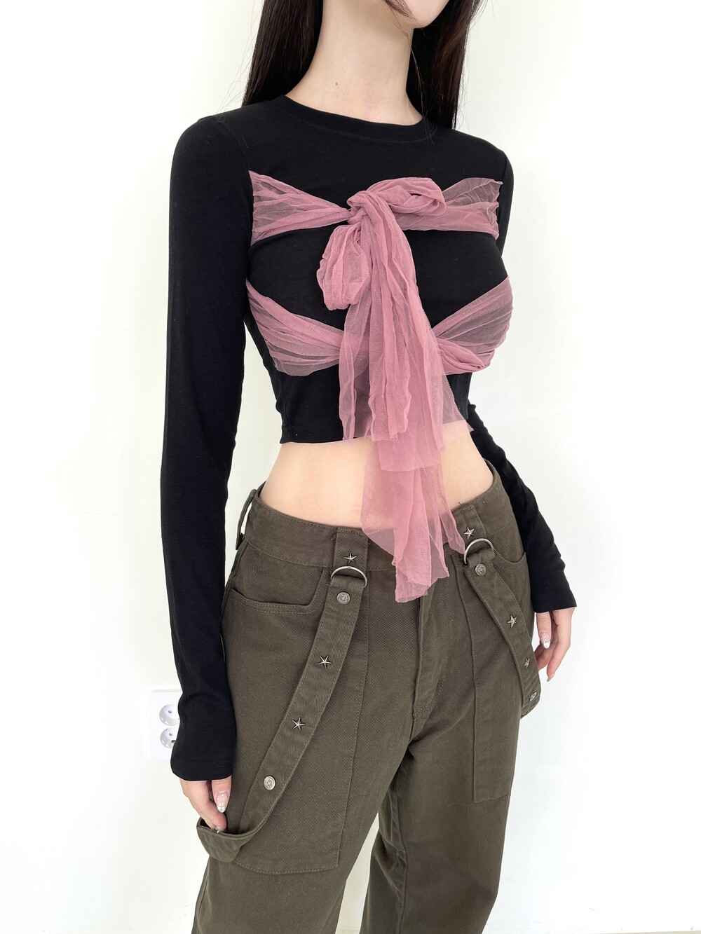 쉬폰 리본 크롭 티셔츠