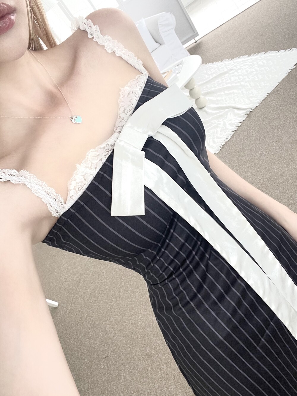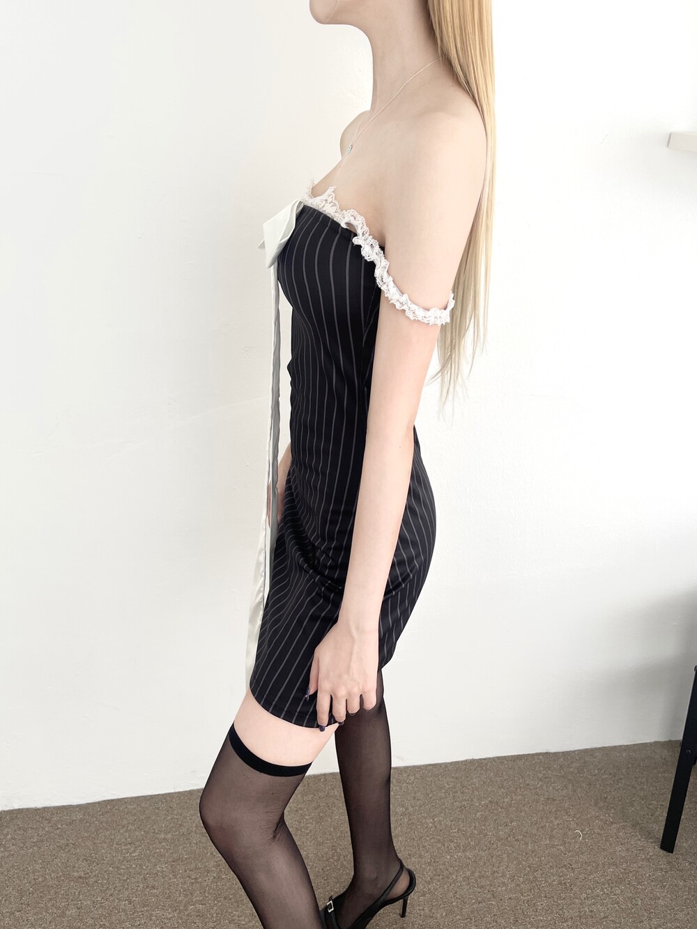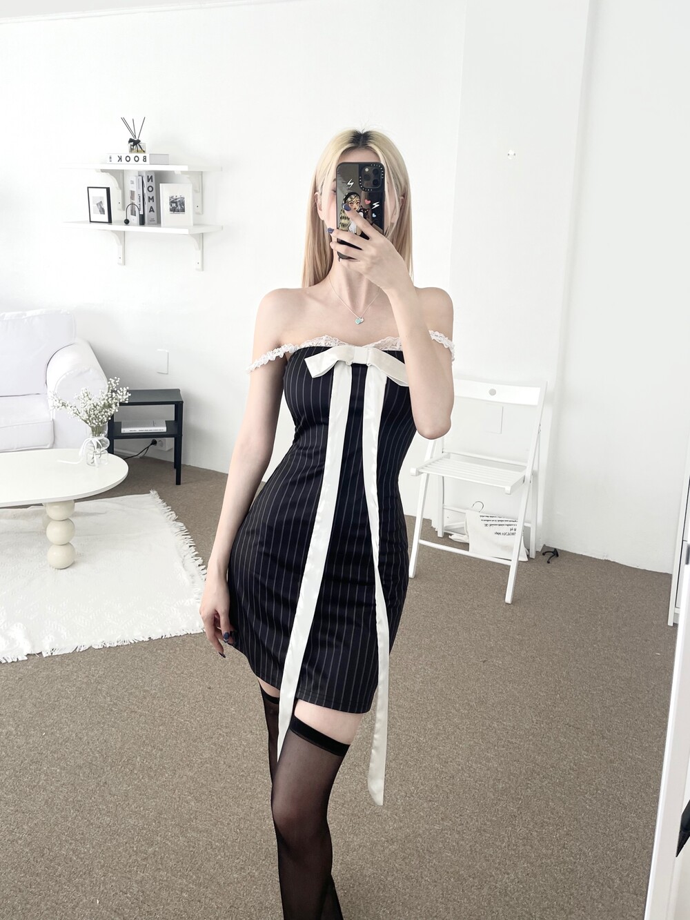 새틴 롱 리본 스트라이프 레이스 미니 원피스