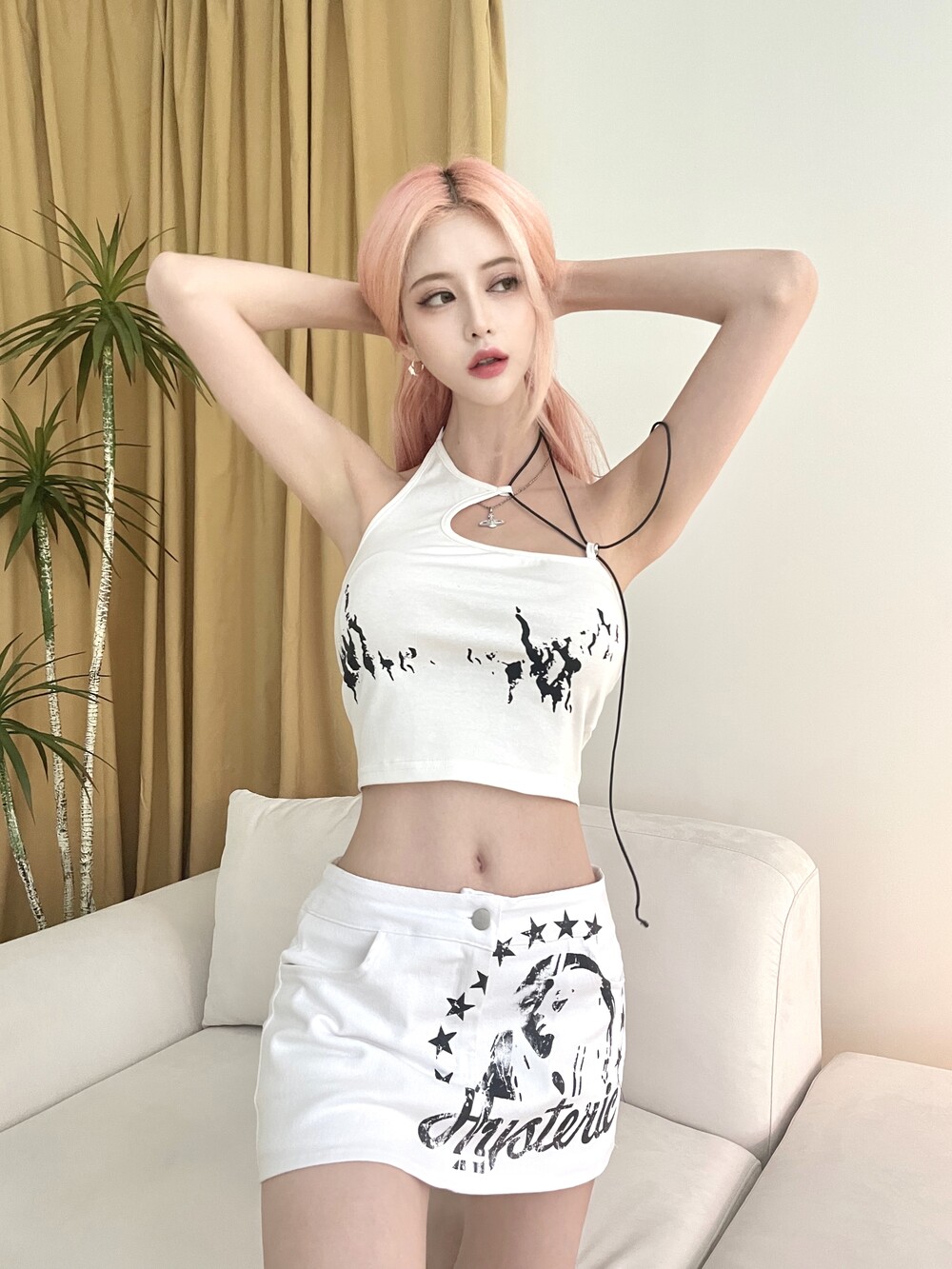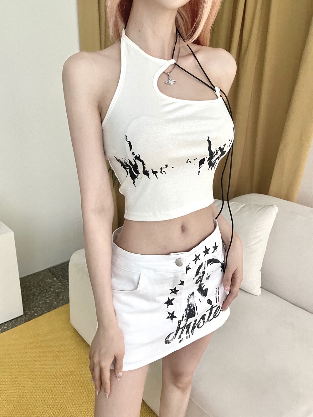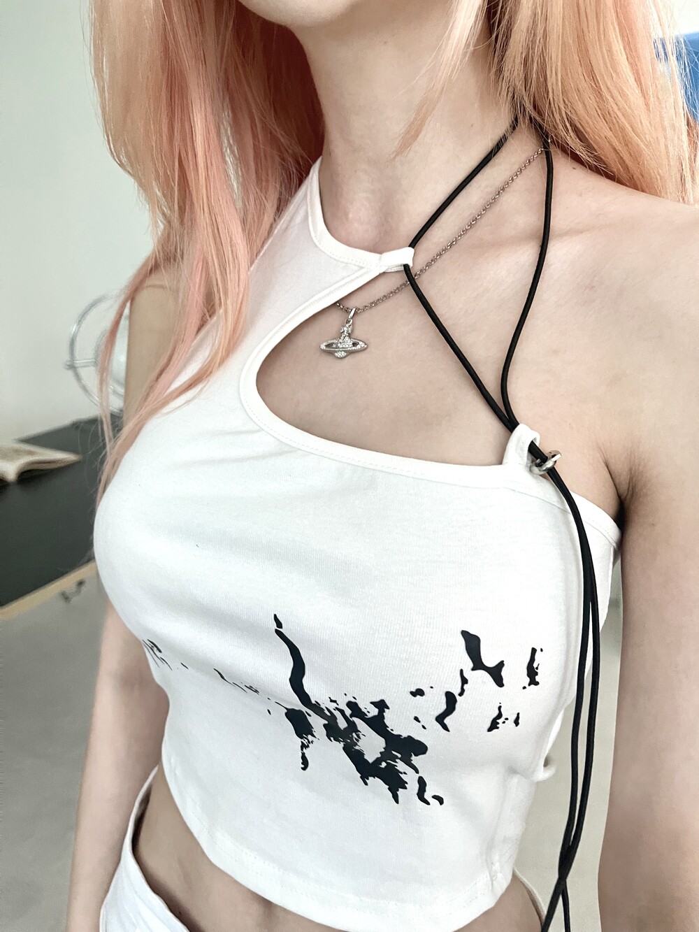 그래픽 프린팅 스트링 크롭 슬리브리스