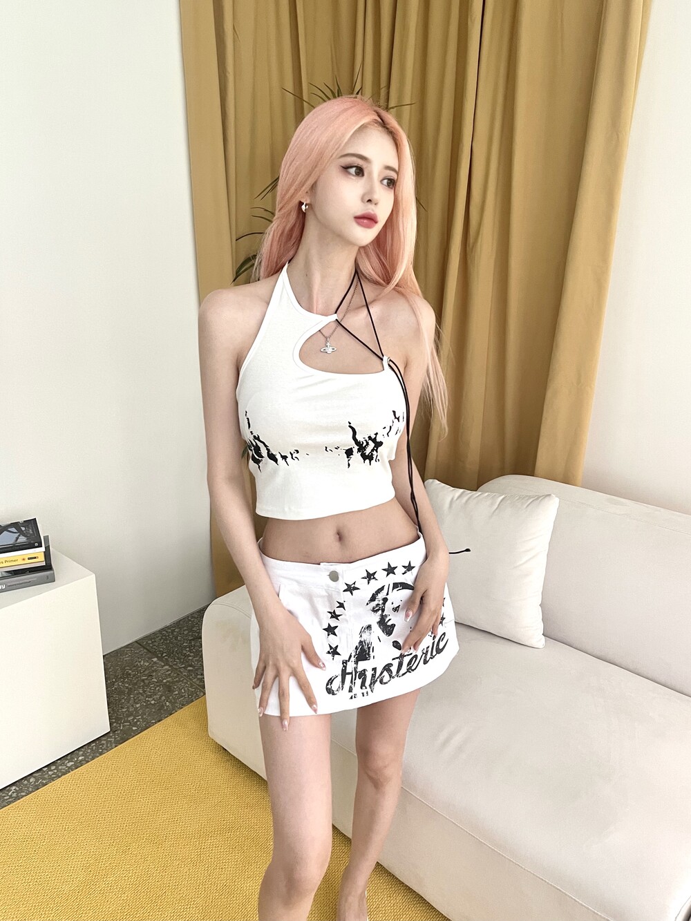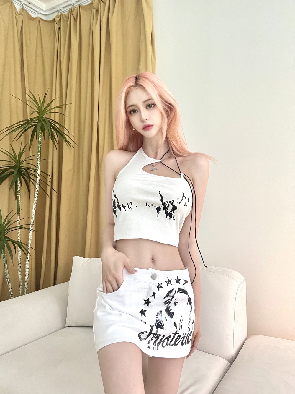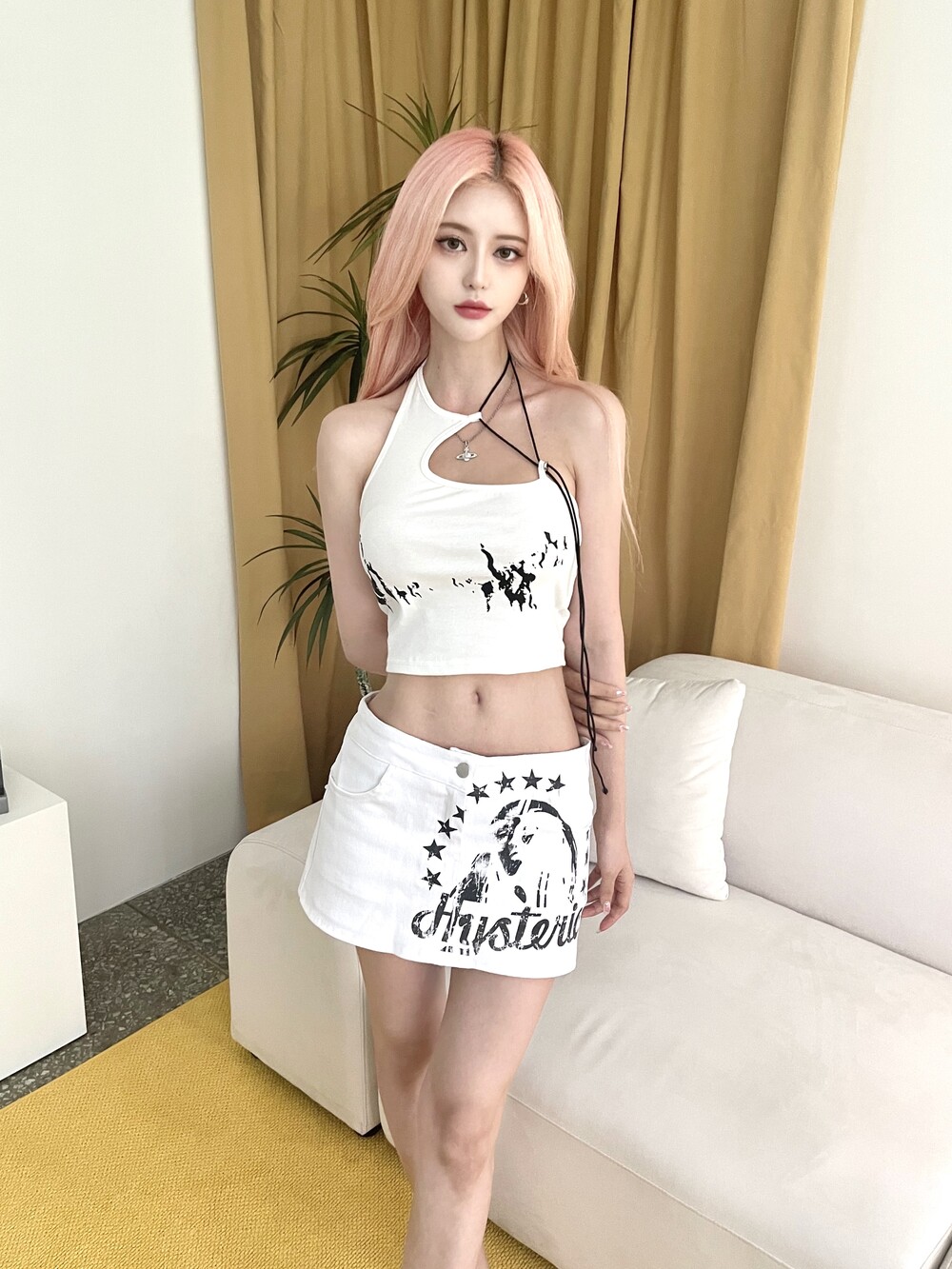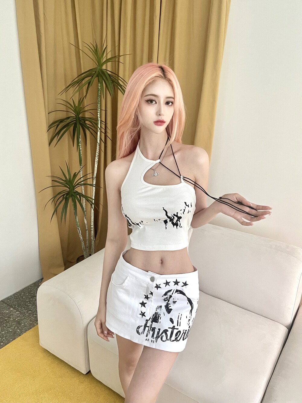 그래픽 프린팅 스트링 크롭 슬리브리스