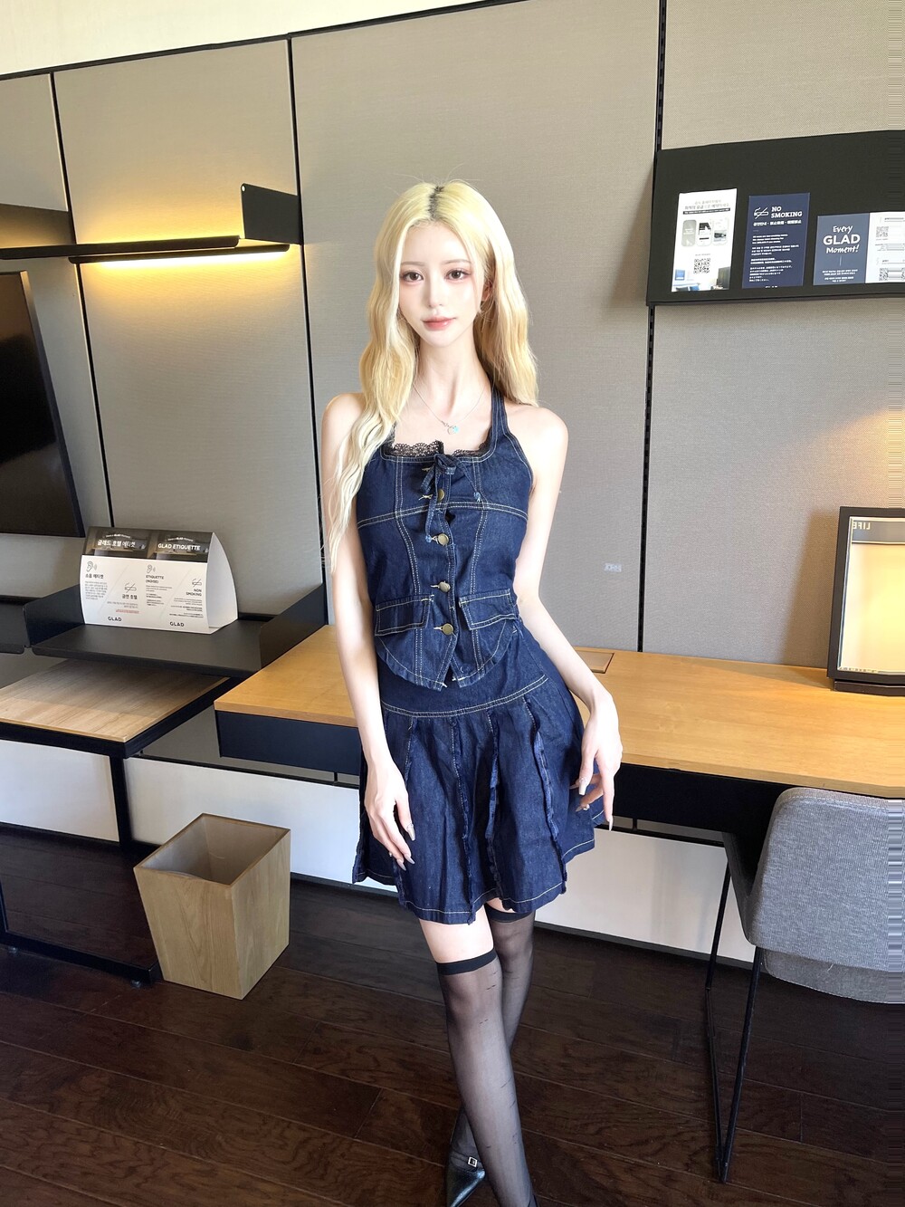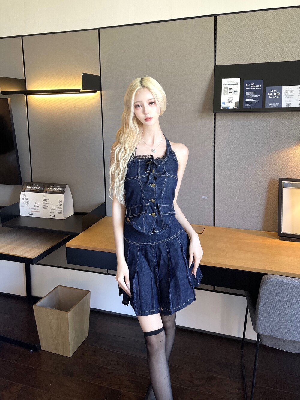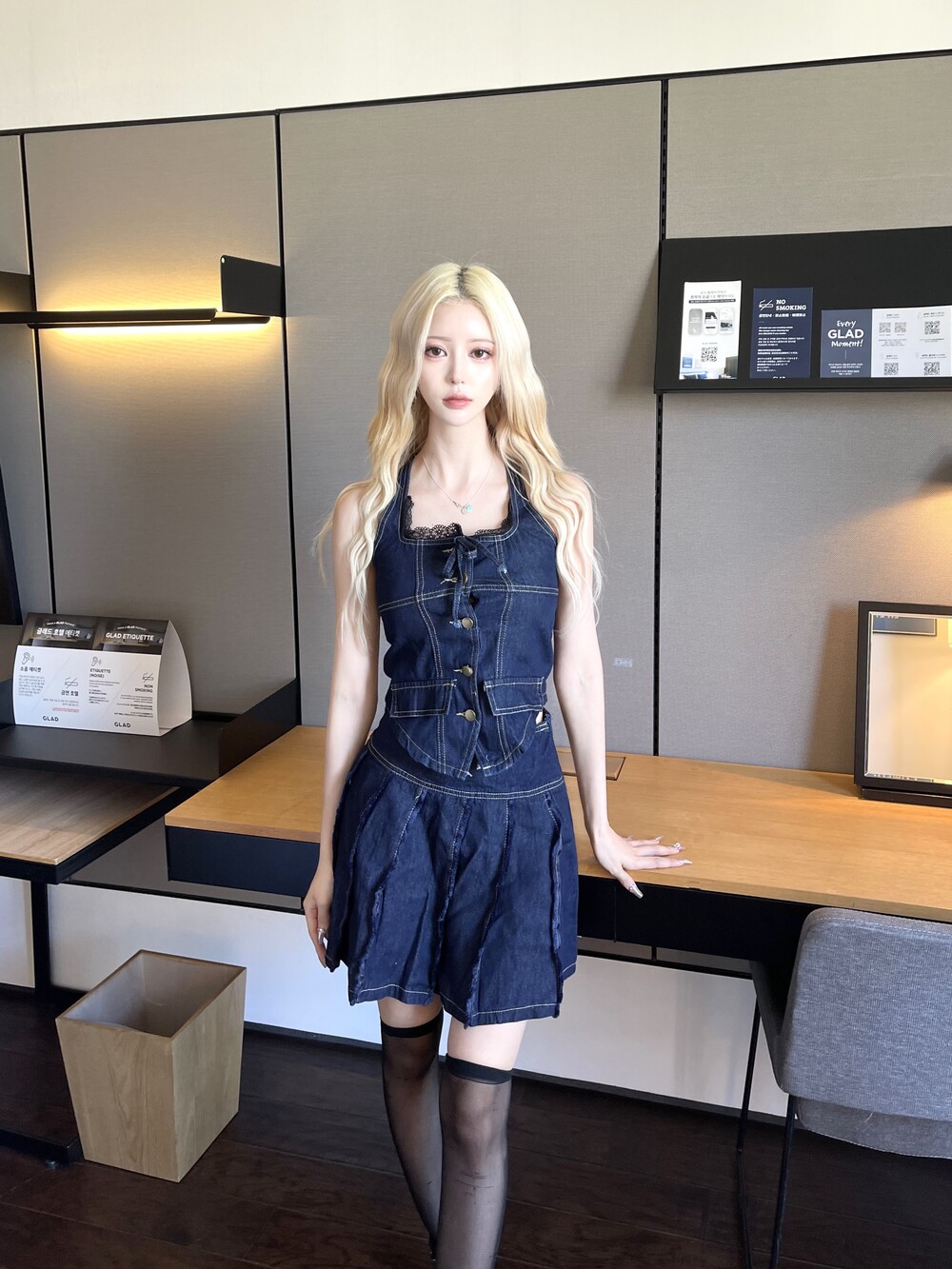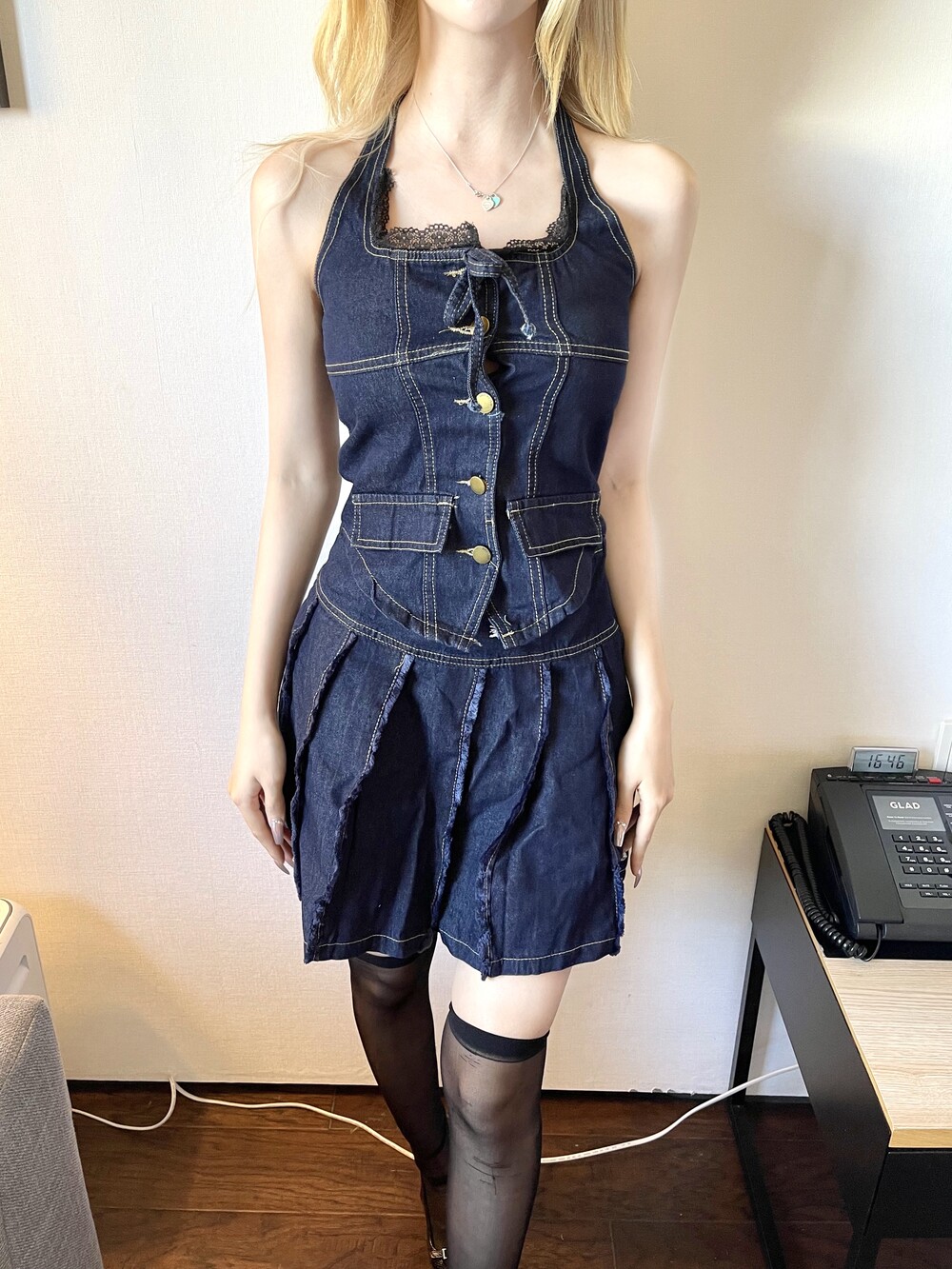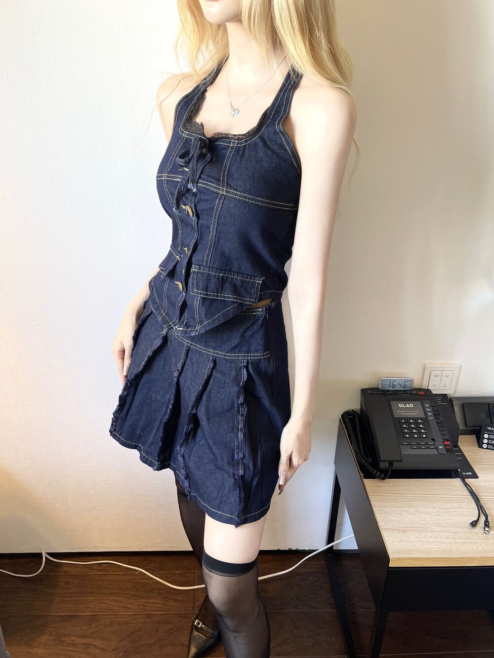 빈티지한 무드감이 돋보이는 데님 투피스 세트