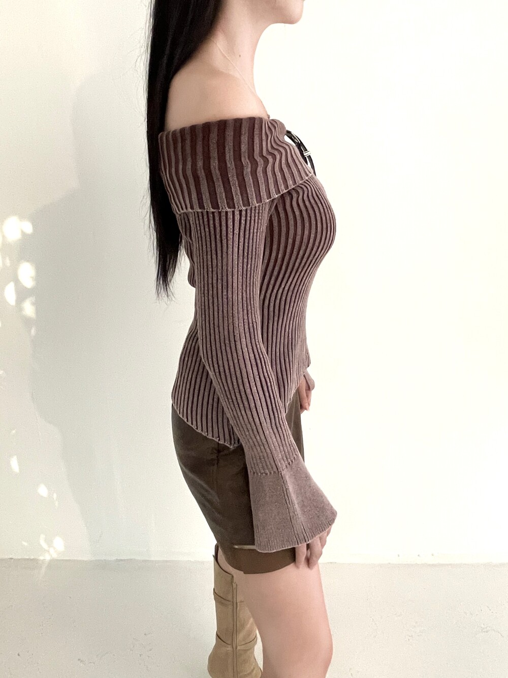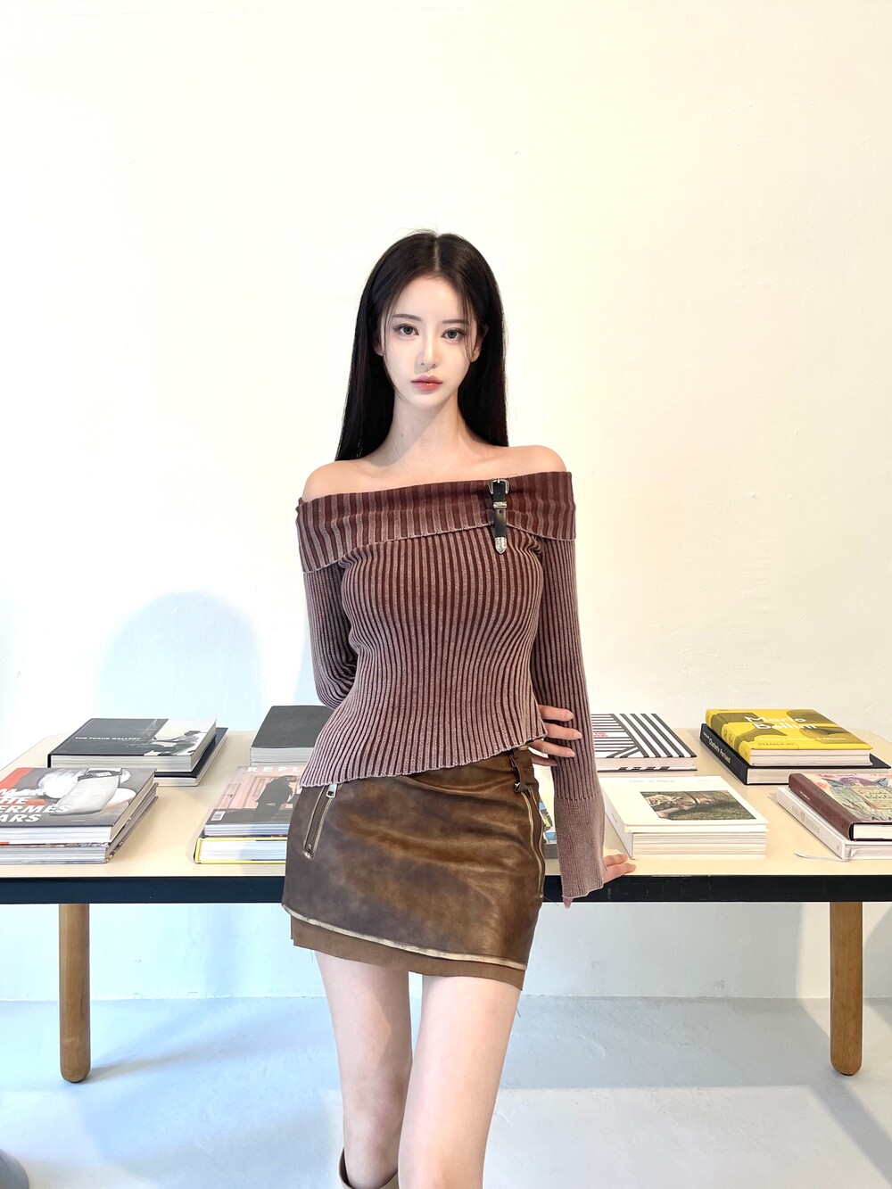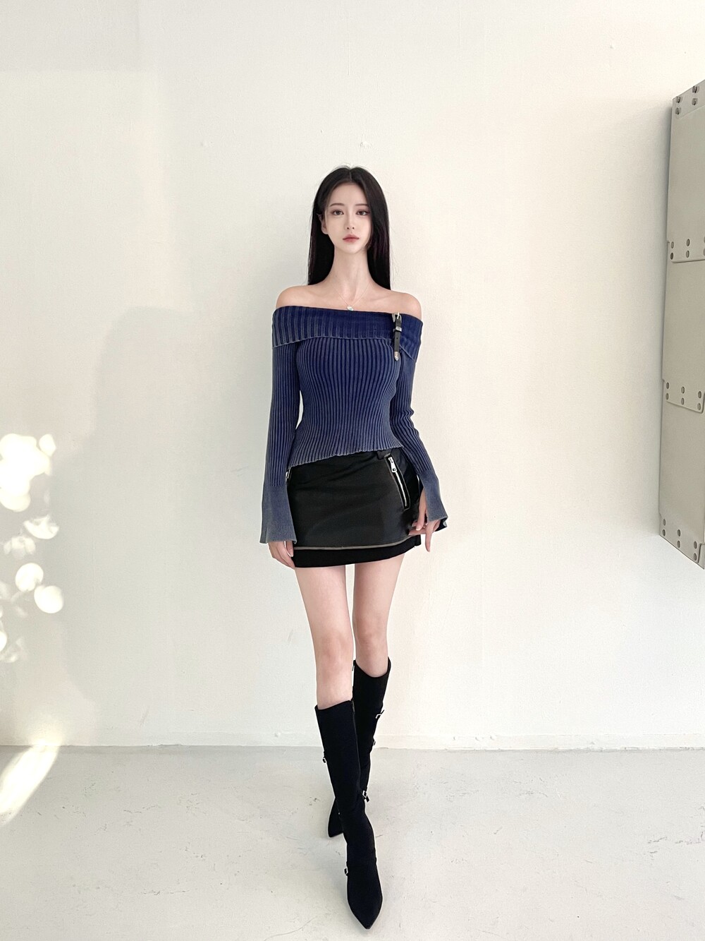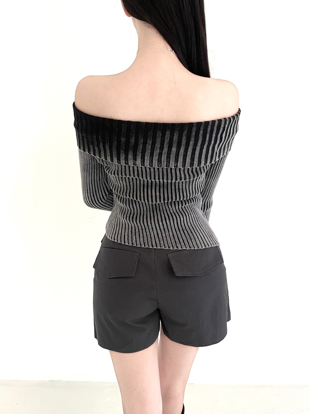 윗단을 플랩하여 접어 입는 오프숄더 상의로