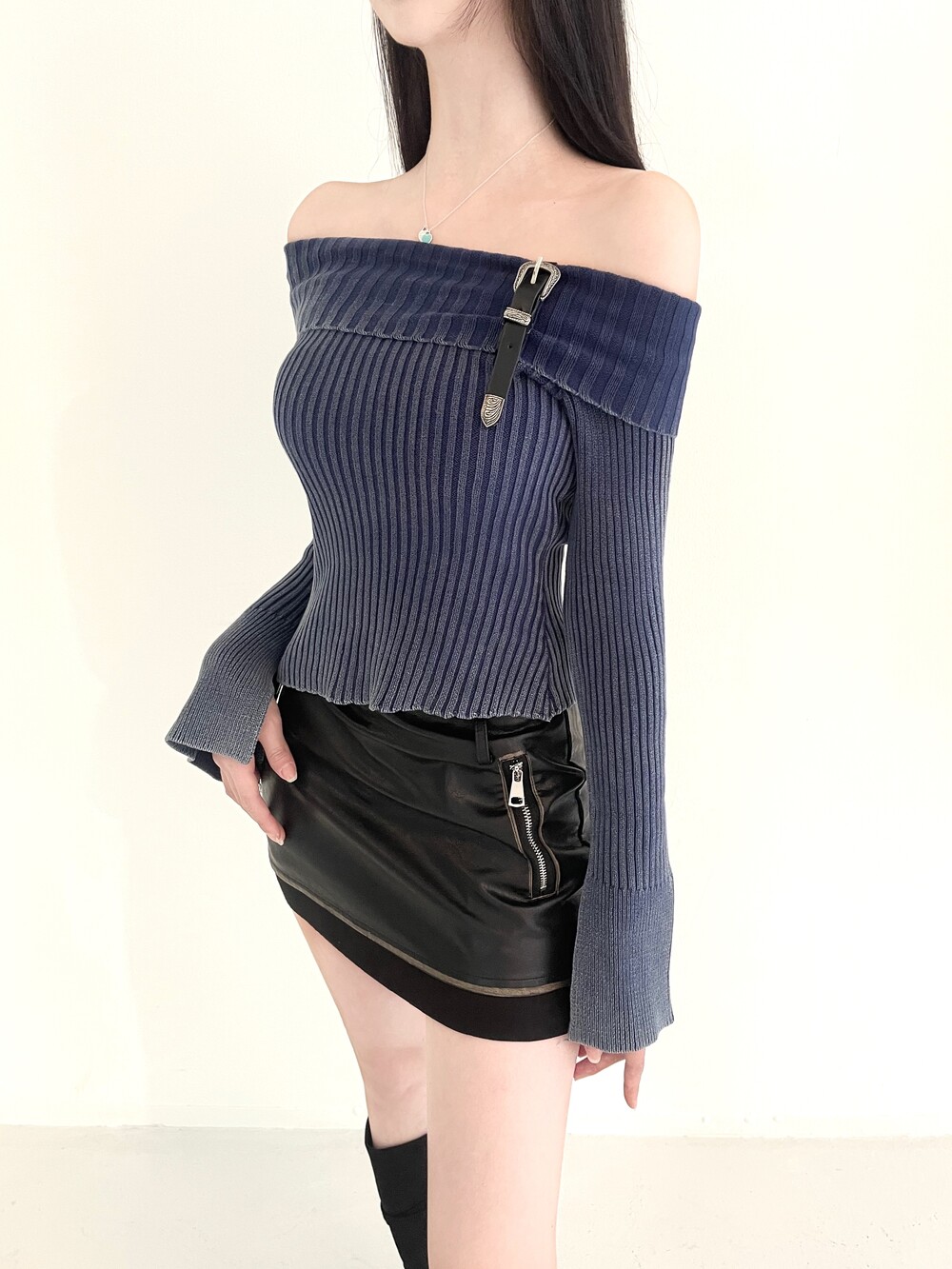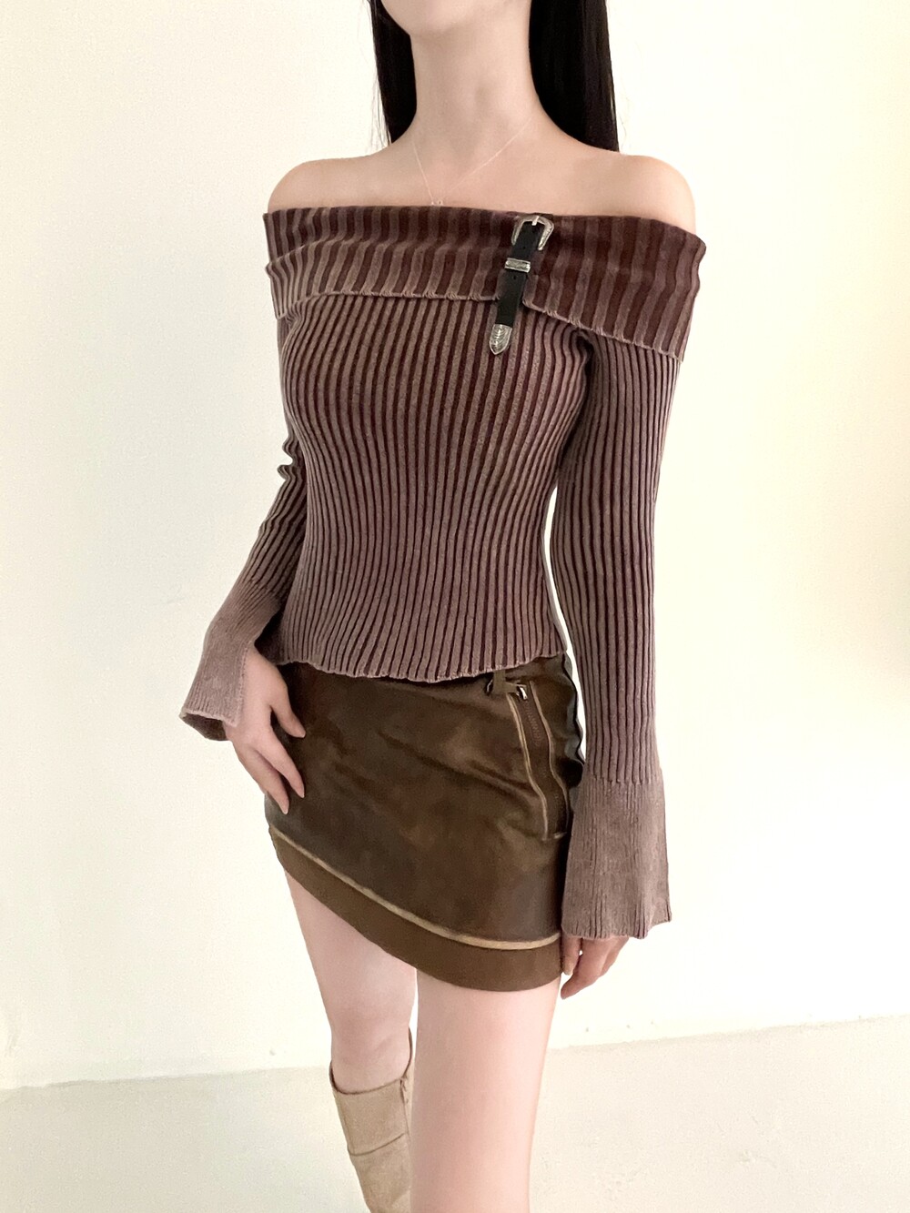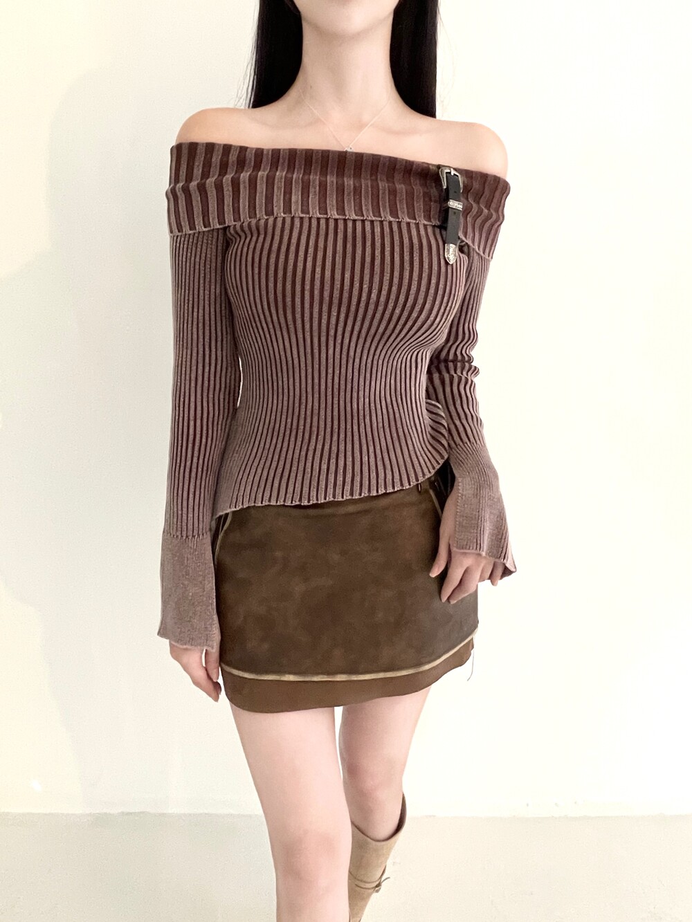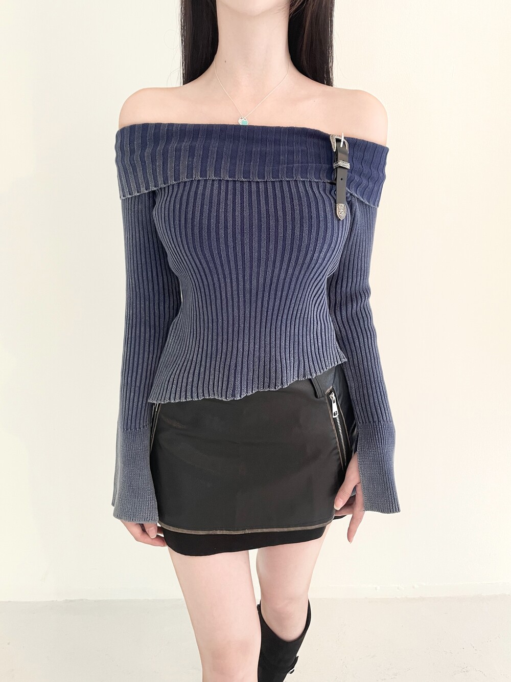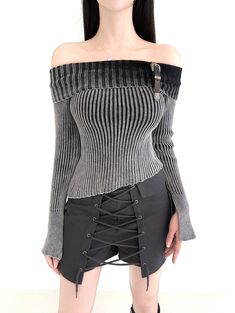 윗단을 플랩하여 접어 입는 오프숄더 상의로