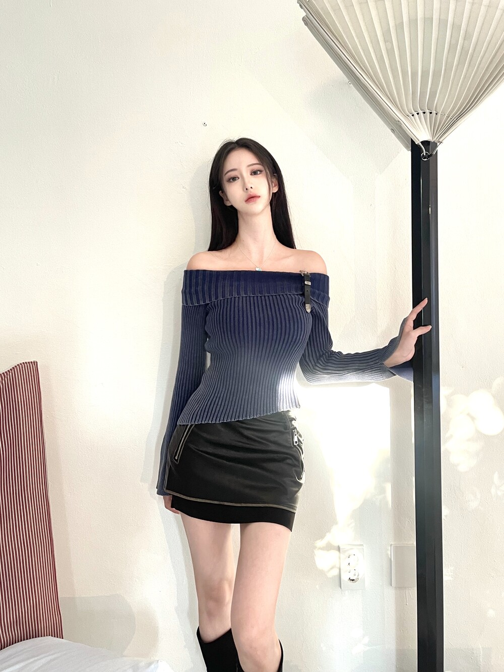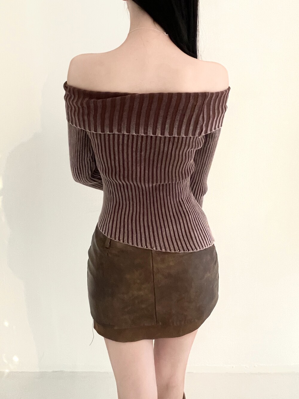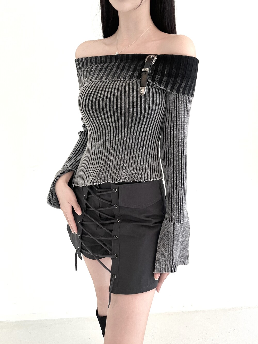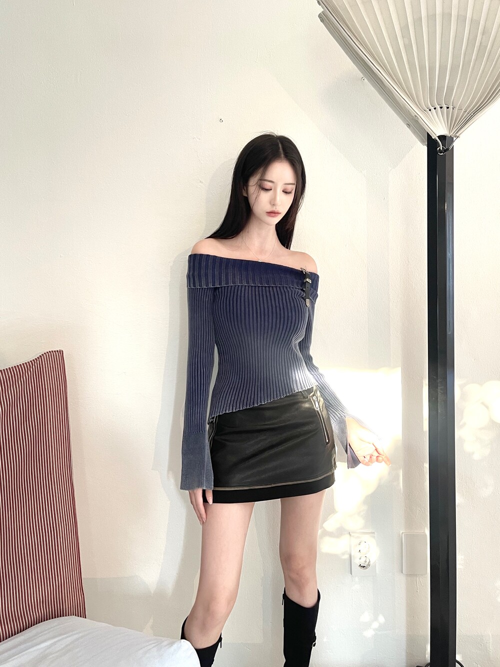 윗단을 플랩하여 접어 입는 오프숄더 상의로
