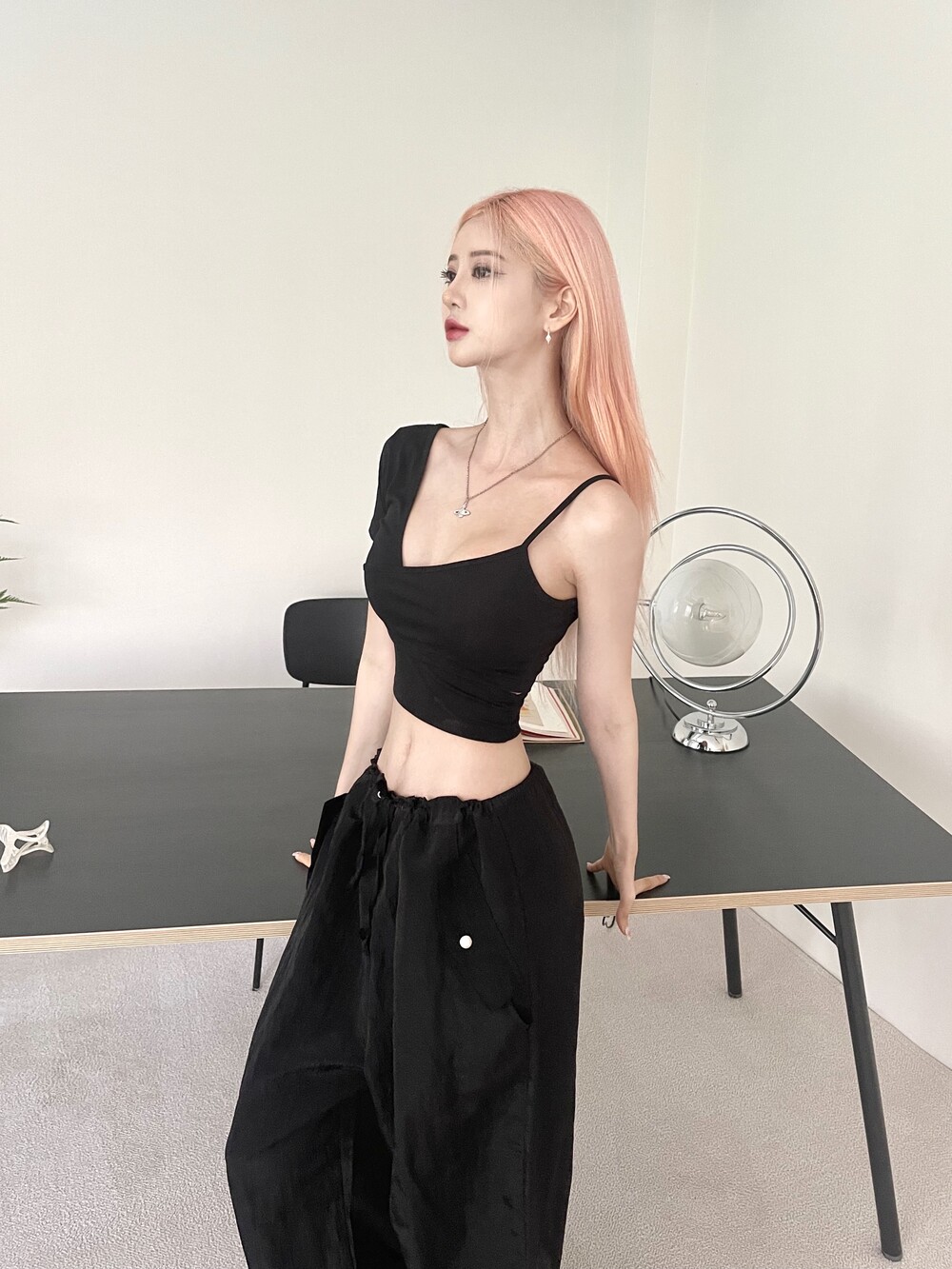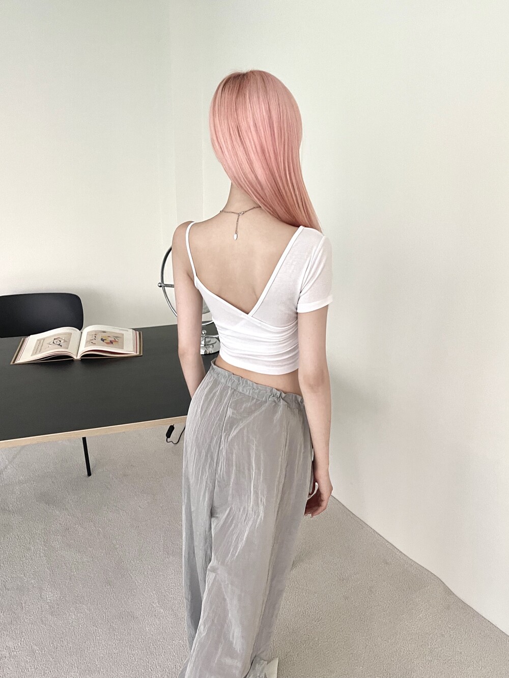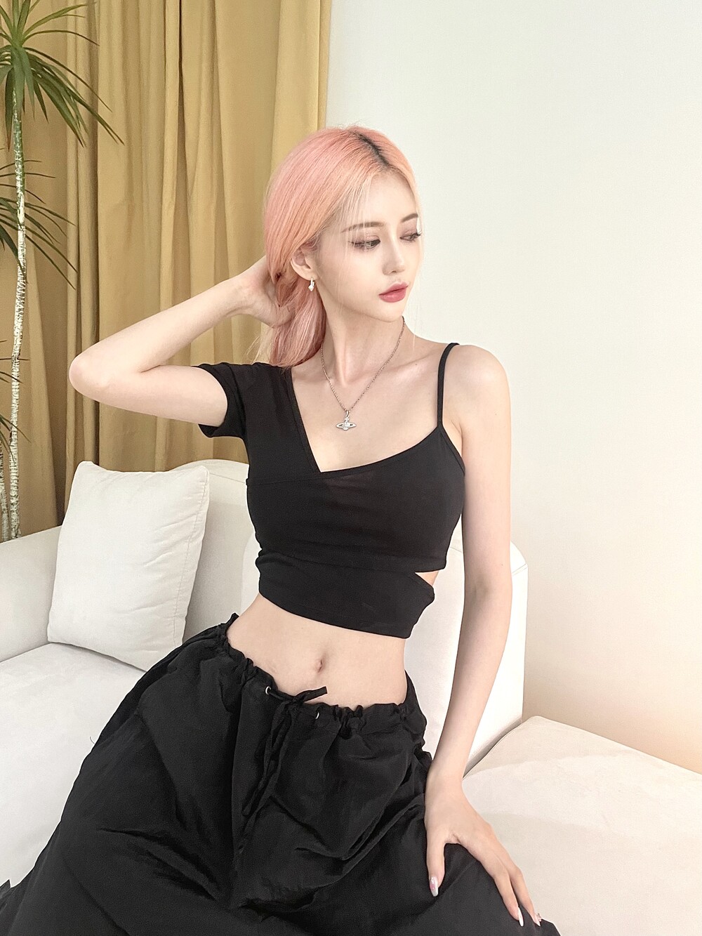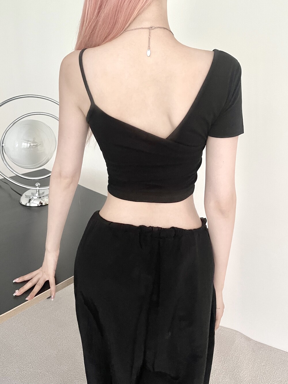 언발 원숄더 더블 레이어드 크롭 티셔츠