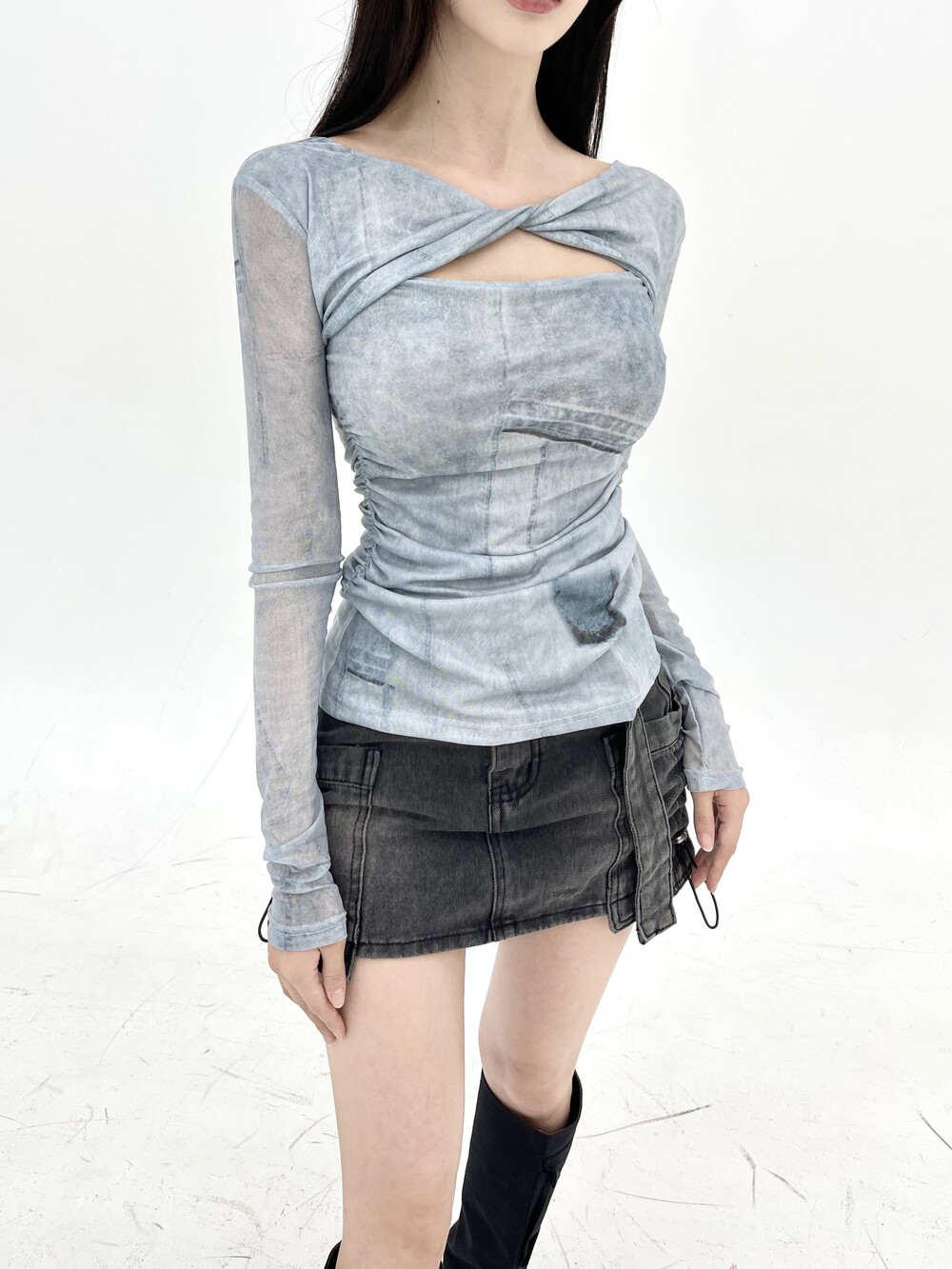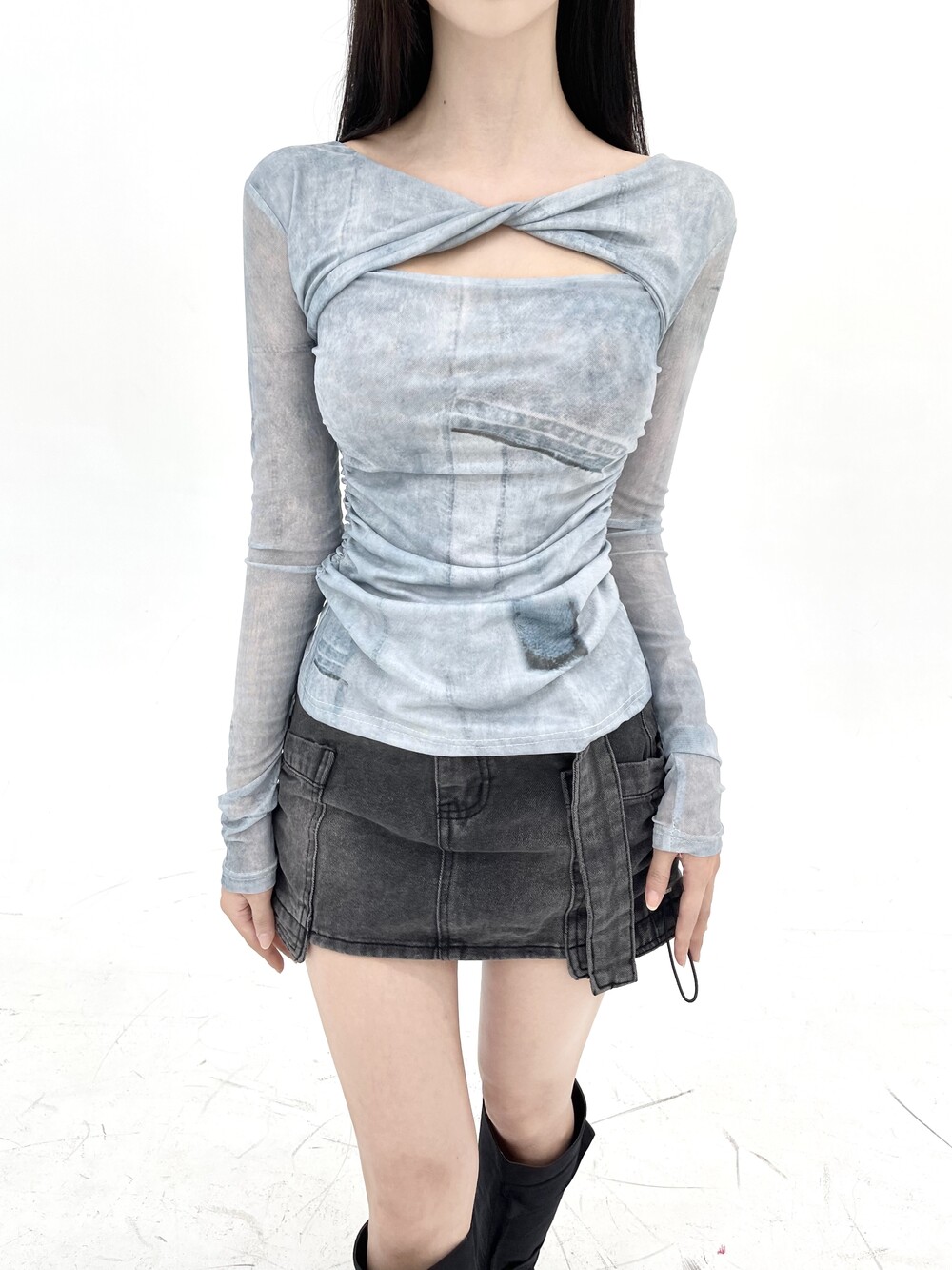 트위스트 꼬임 진 프린팅 컷아웃 티셔츠