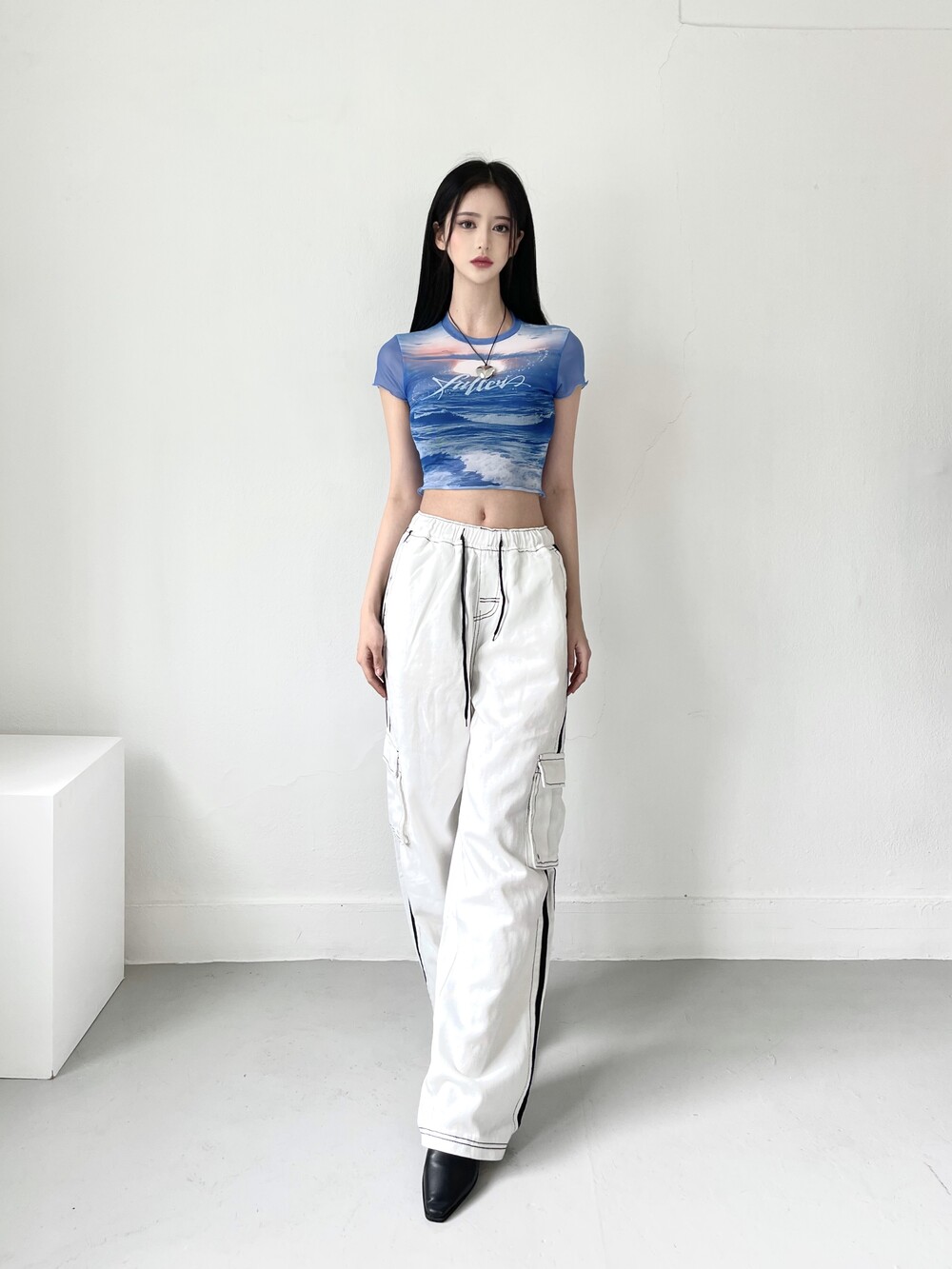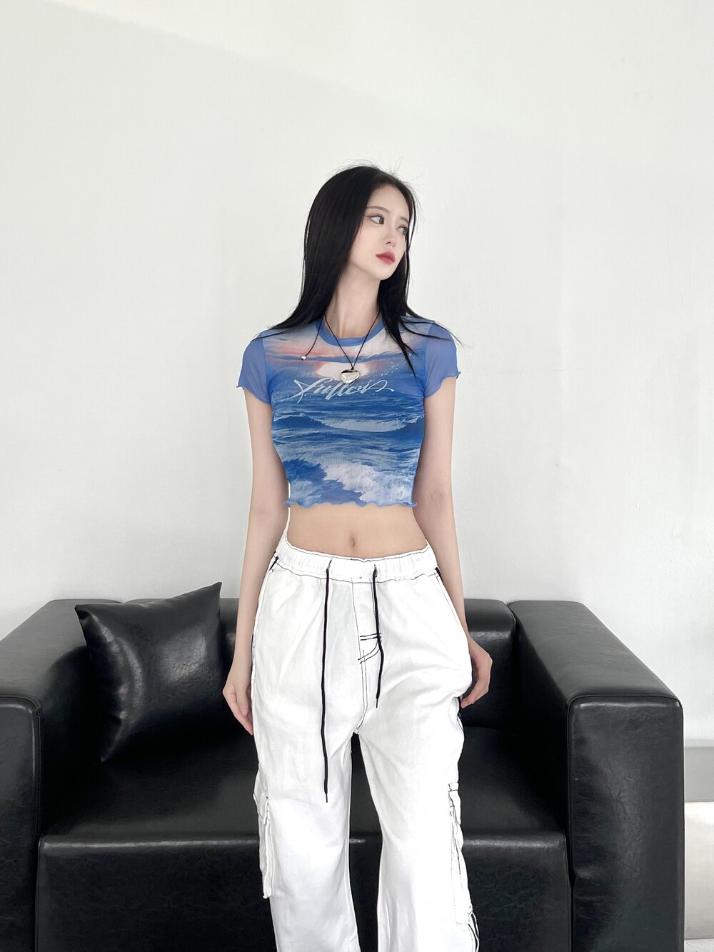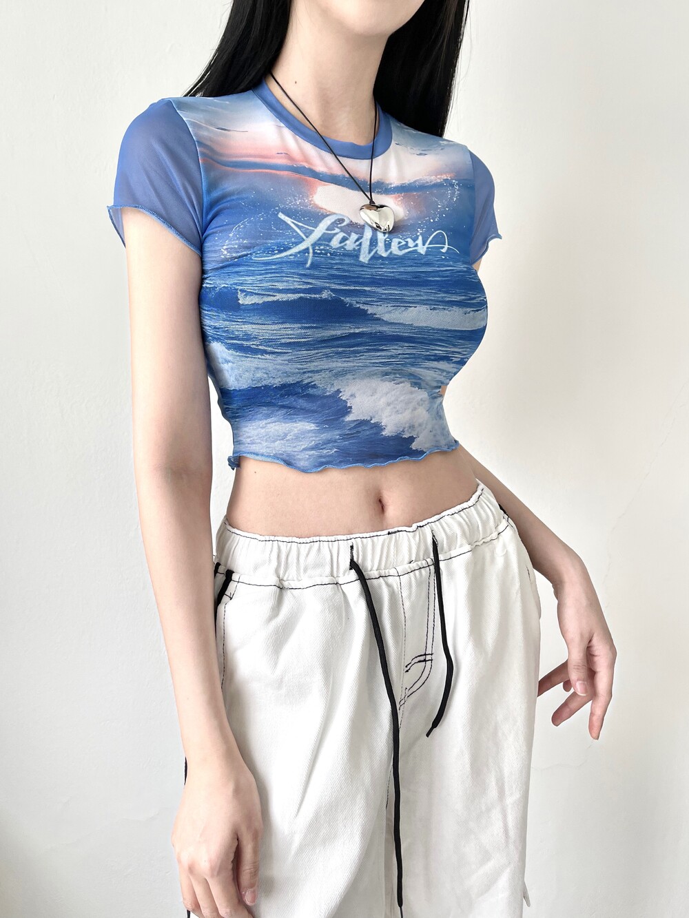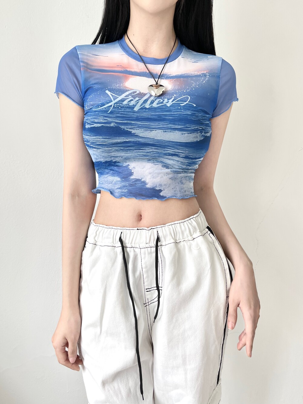 블루오션 프린팅 메쉬 크롭 반팔 티셔츠