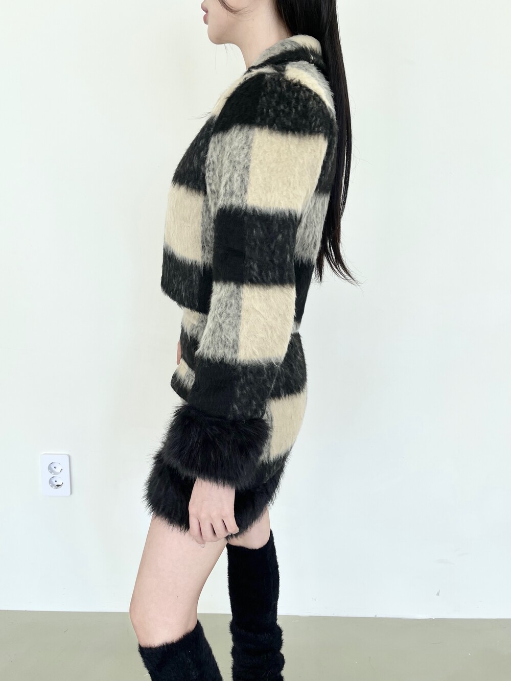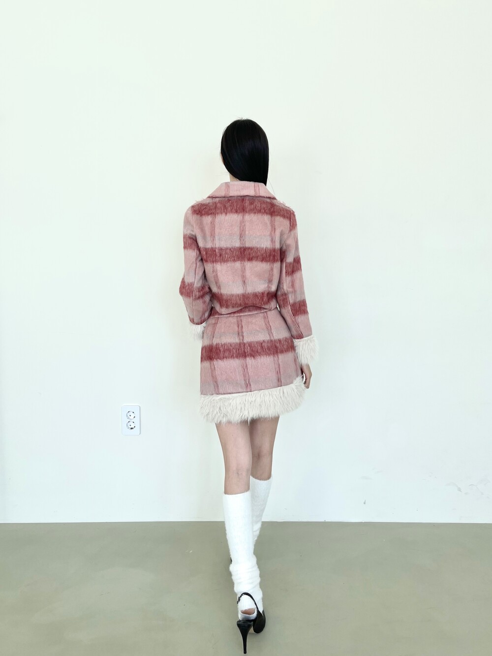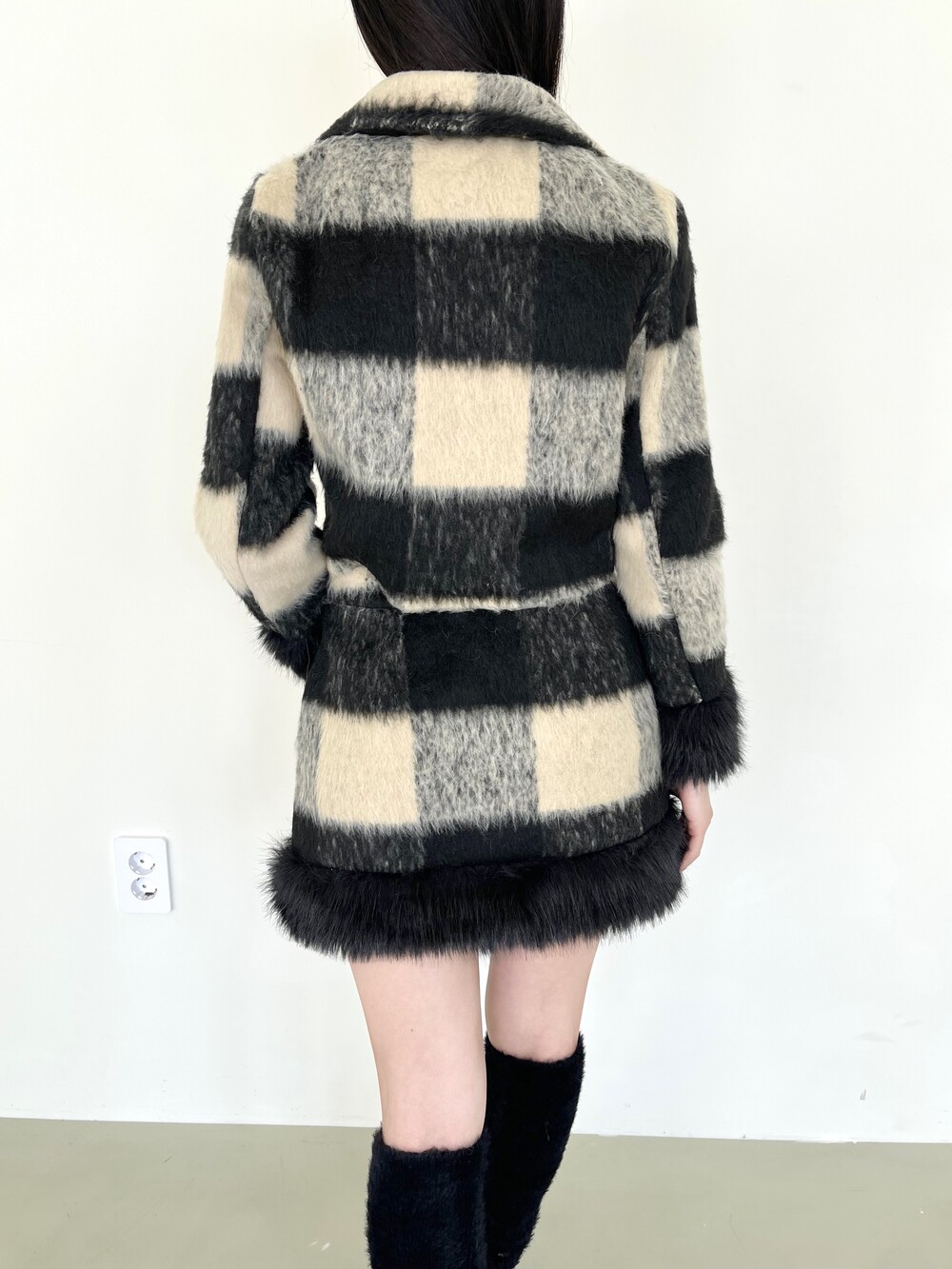 모헤어 체크 퍼 자켓-스커트 투피스