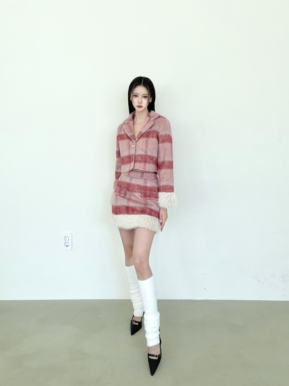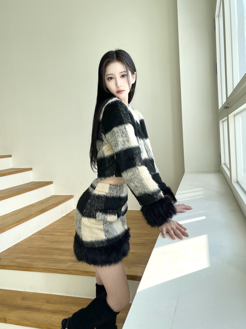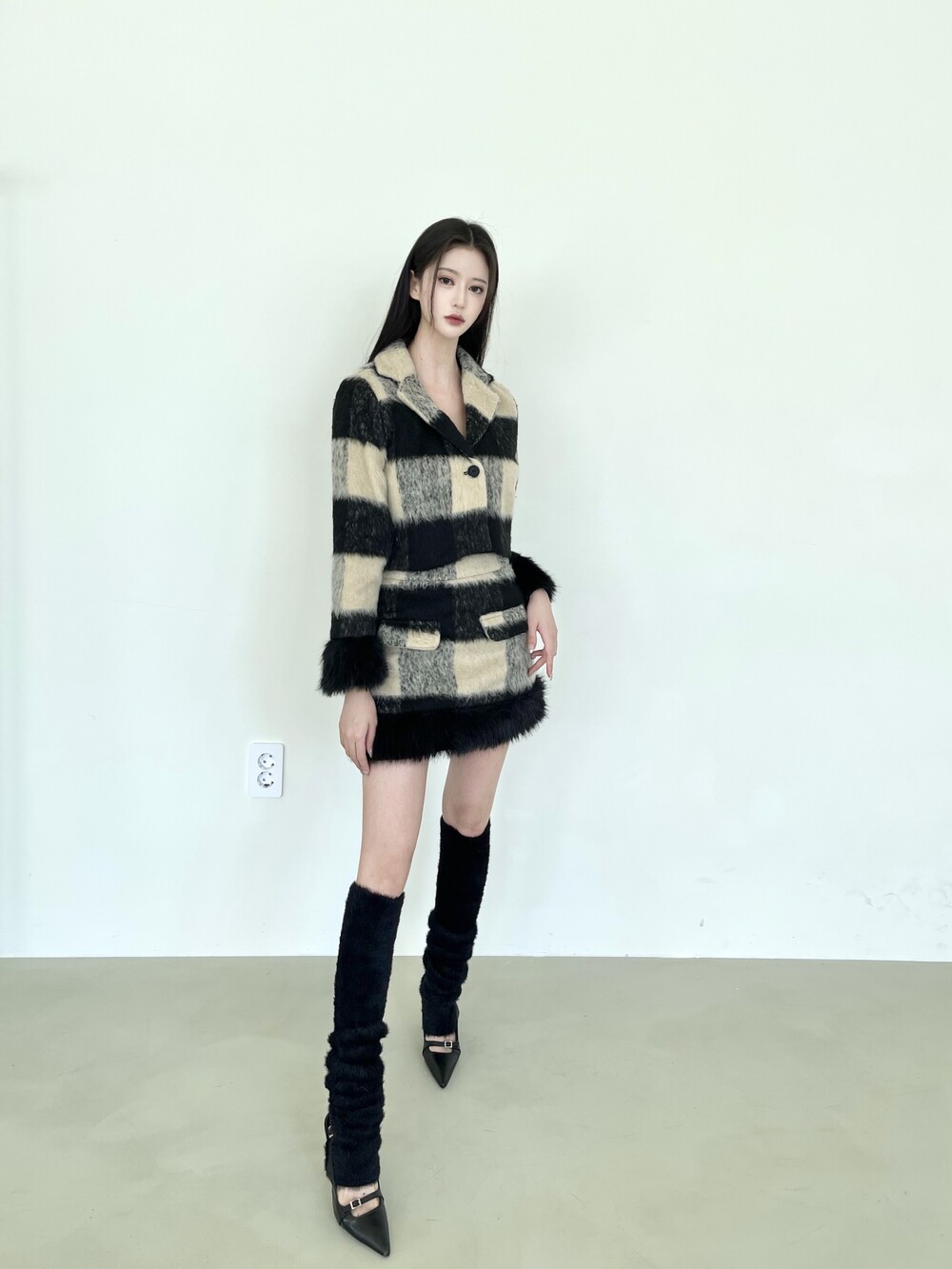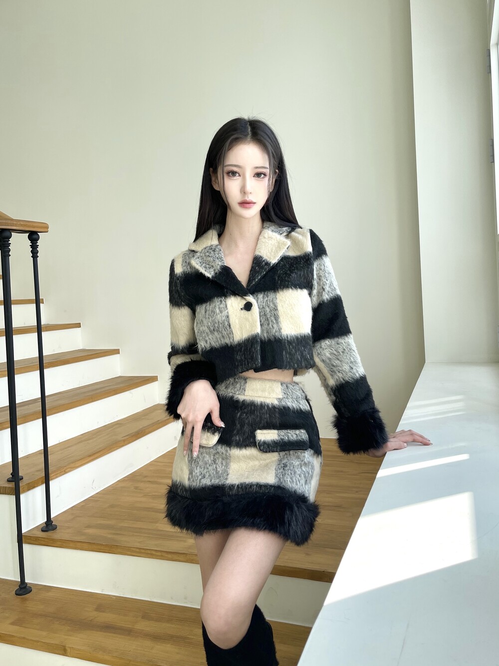 모헤어 체크 퍼 자켓-스커트 투피스