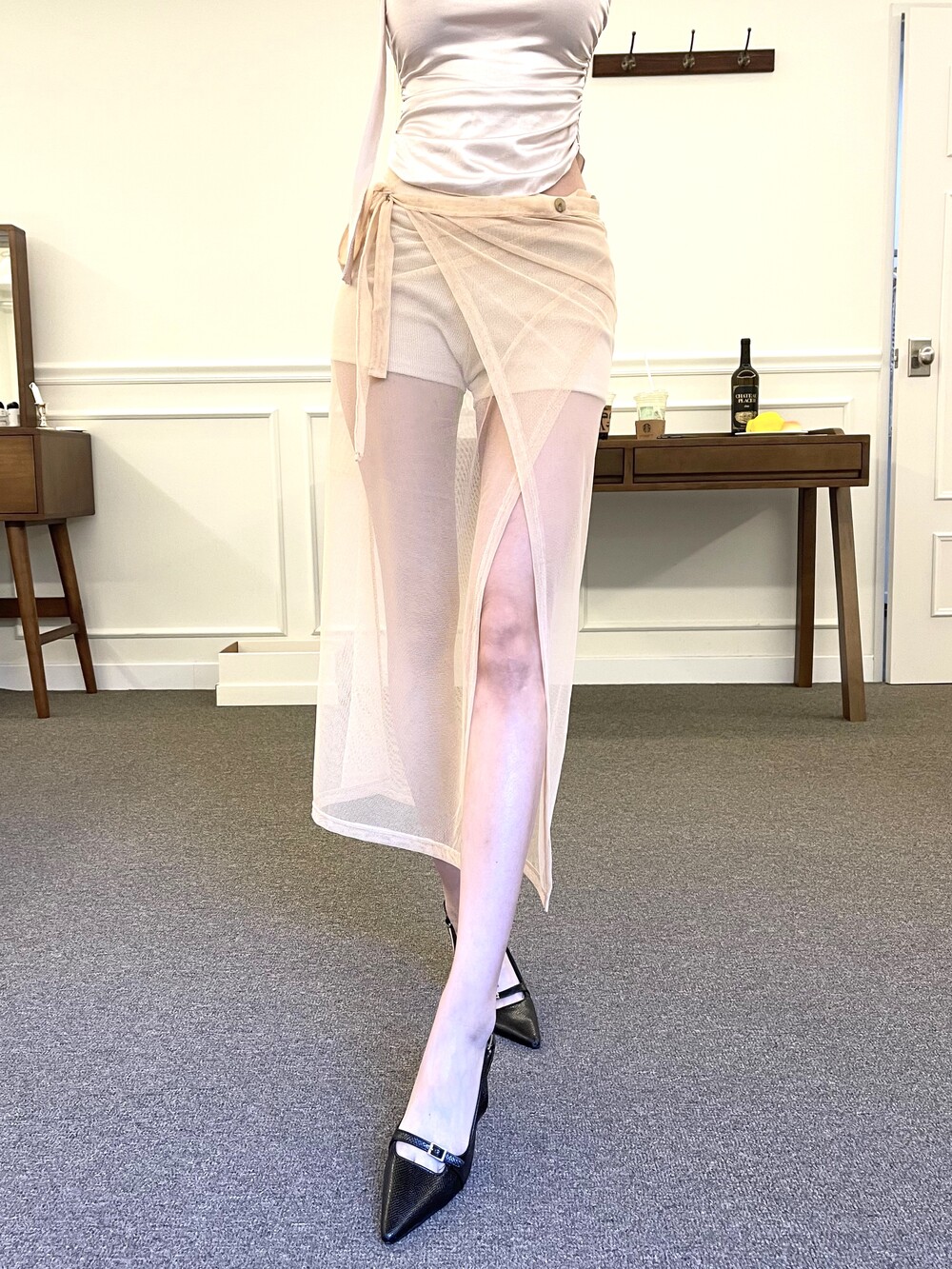시스루 랩 스트랩 롱 커버 스커트