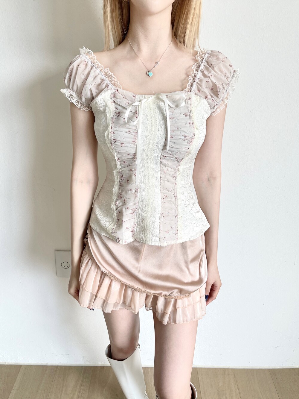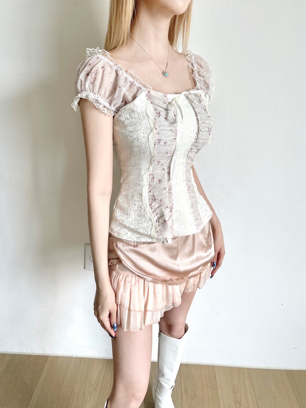 리본 퍼프 플라워 레이스 뷔스티에