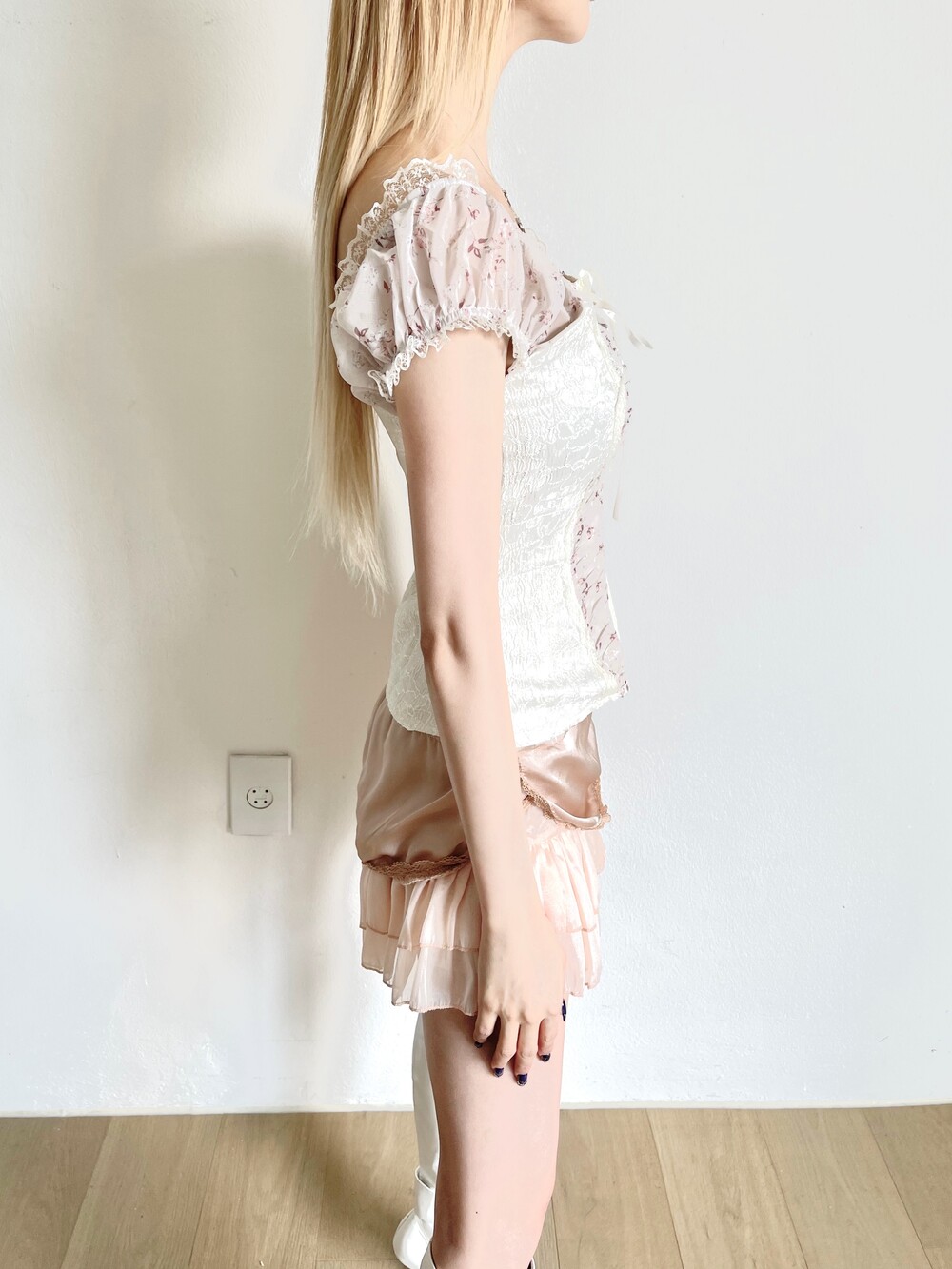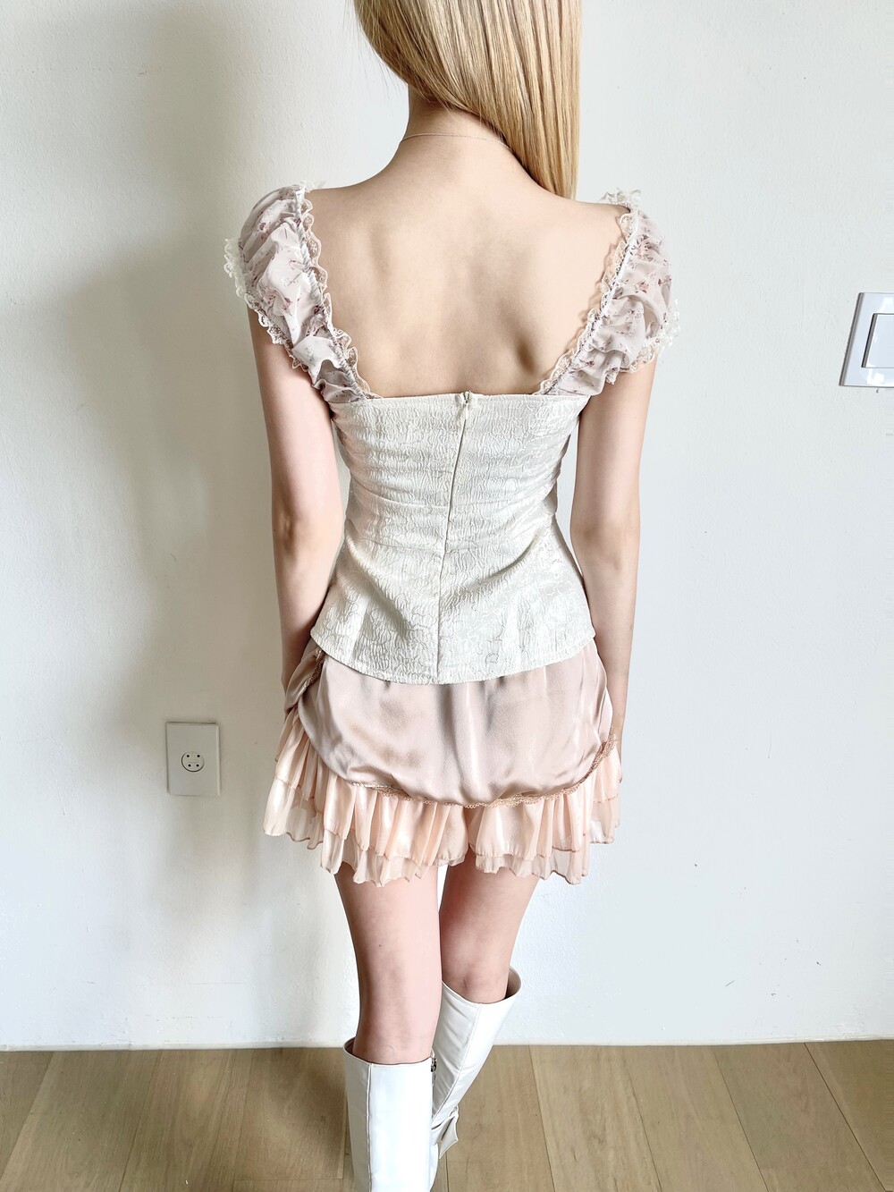 플라워쉬폰 원단이 배색되어 페미닌한 무드를 자아내는 퍼프 뷔스티에