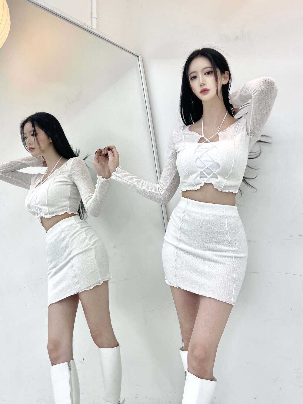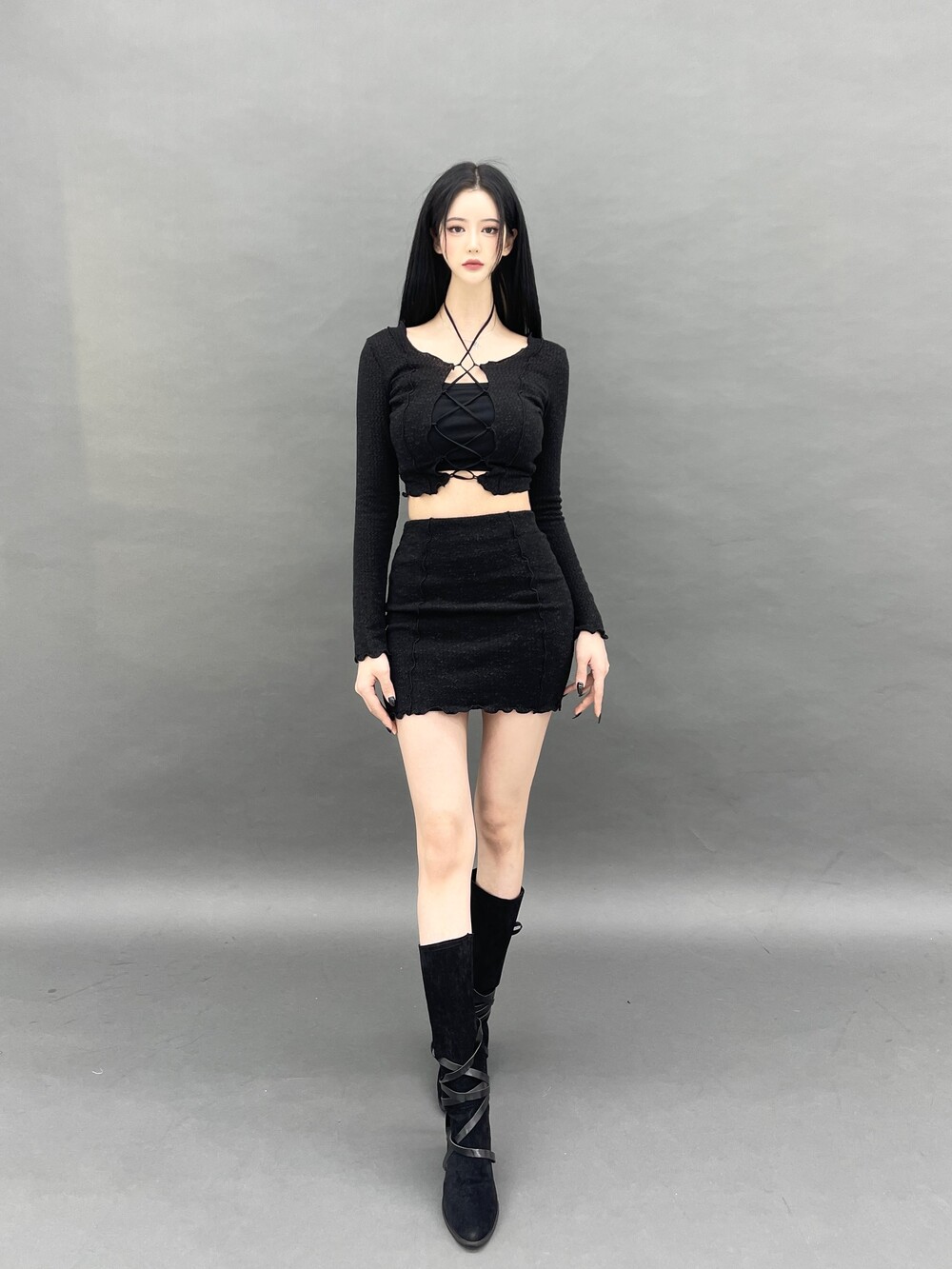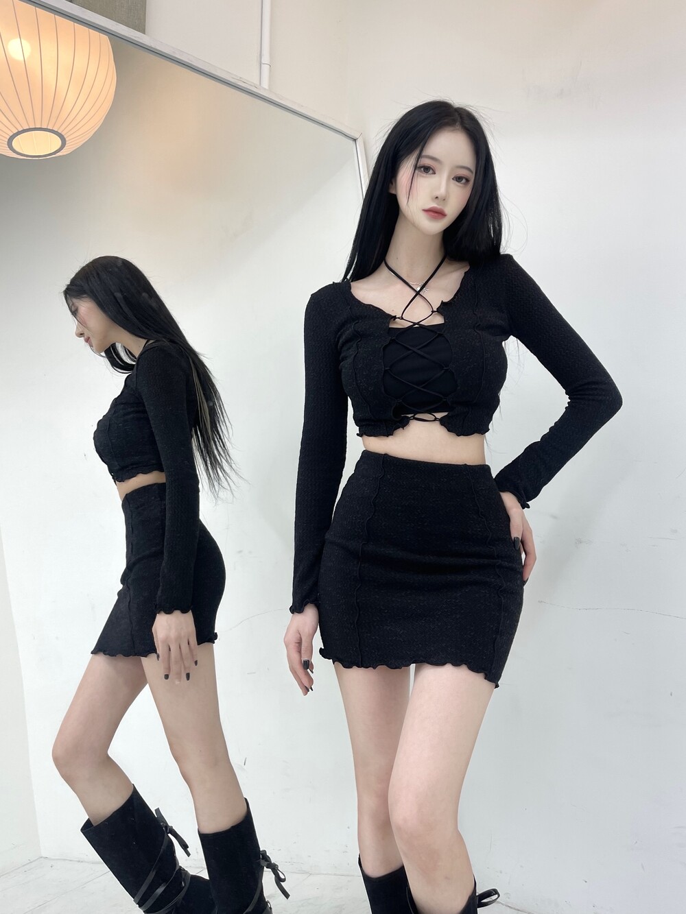 중앙부 스트링 코르셋 디테일로 자유로운 끈 연출이 가능